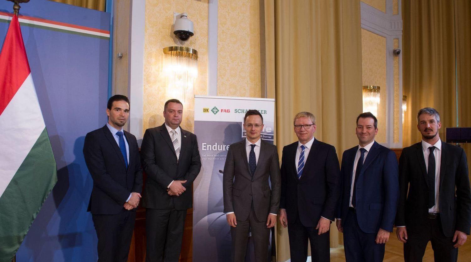 Szikora Levente, Szabó Péter, az FAG Magyarország Ipari Kft. ügyvezetője, Szijjártó Péter külgazdasági és külügyminiszter, Dr. Lindner Rainer a Schaeffler Csoport közép- és kelet európai alrégiójának vezérigazgatója, Ésik Róbert a Nemzeti Befektetési Ügynökség elnöke és Dr.Barcsa Lajos Debrecen alpolgármestere a bejelentést követően