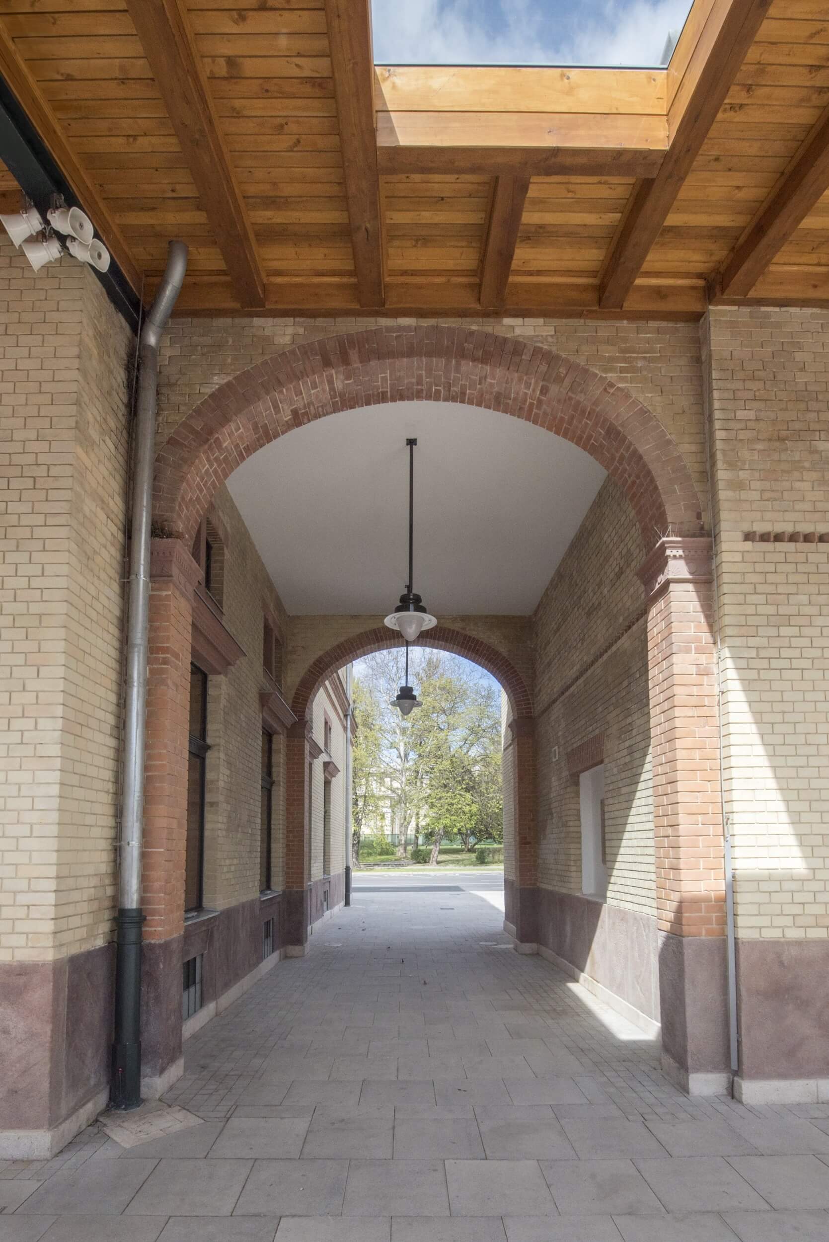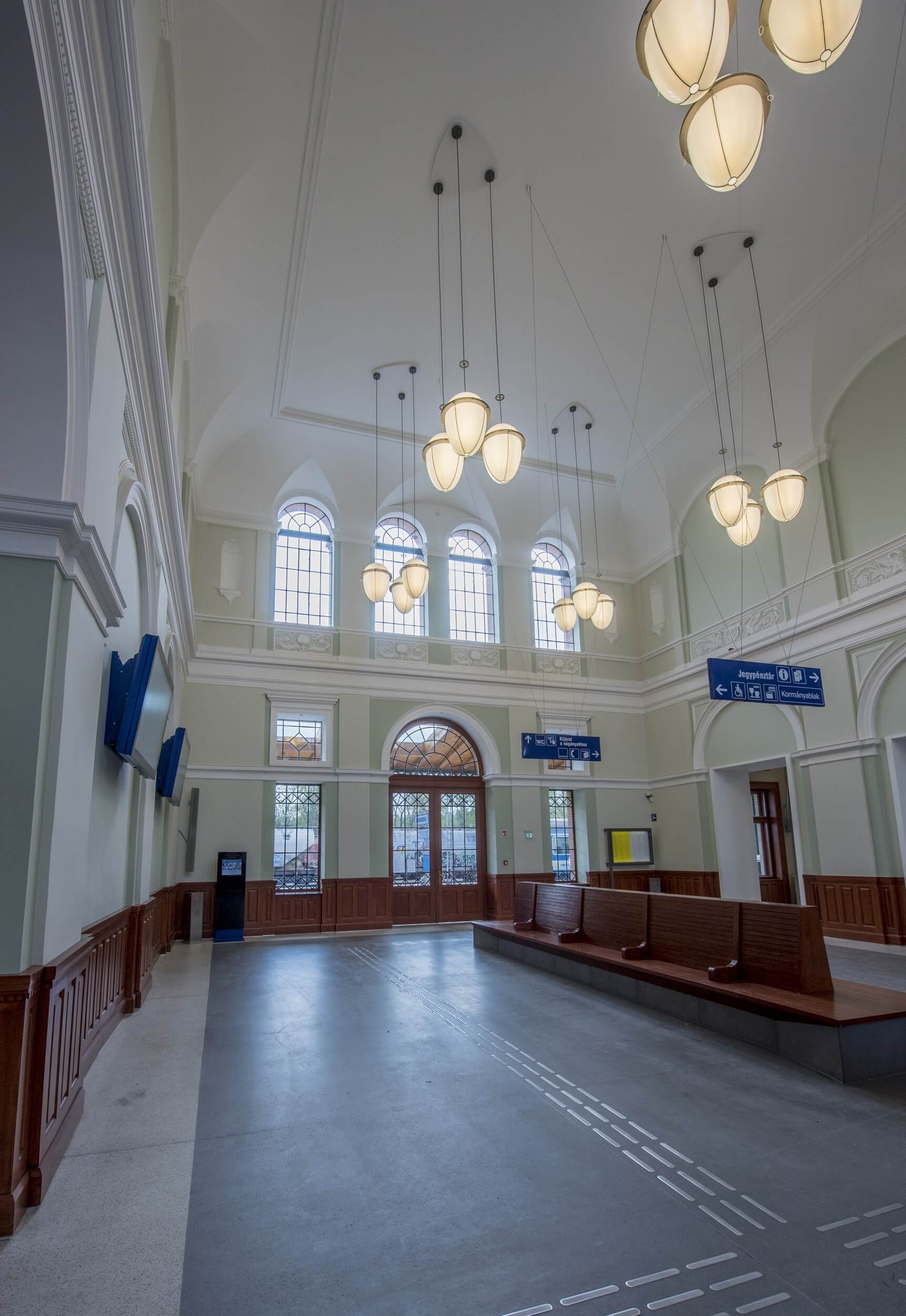 A közönségforgalmi terek az eredeti állapotuknak megfelelően lettek visszaállítva, ezzel szemben a vasútüzemeltetést biztosító terek új kiosztást kaptak a modern kornak megfelelő légtechnikával, világítással, szellőzéssel, vizes blokkokkal, teakonyhákkal. Az épületben egy kormányablak is megnyílt: „Érdekes feladat volt a modern dizájnt belehelyezni egy történelmi épületbe, aminek egyébként annak idején a „restije” működött ezen a részen.” A fejlesztésben mindezek mellett felújították az állomáshoz tartozó járdát és a taxiparkolót, aszfalt helyett térkőlap burkolattal, az épület mellett kandelábereket állítottak.
