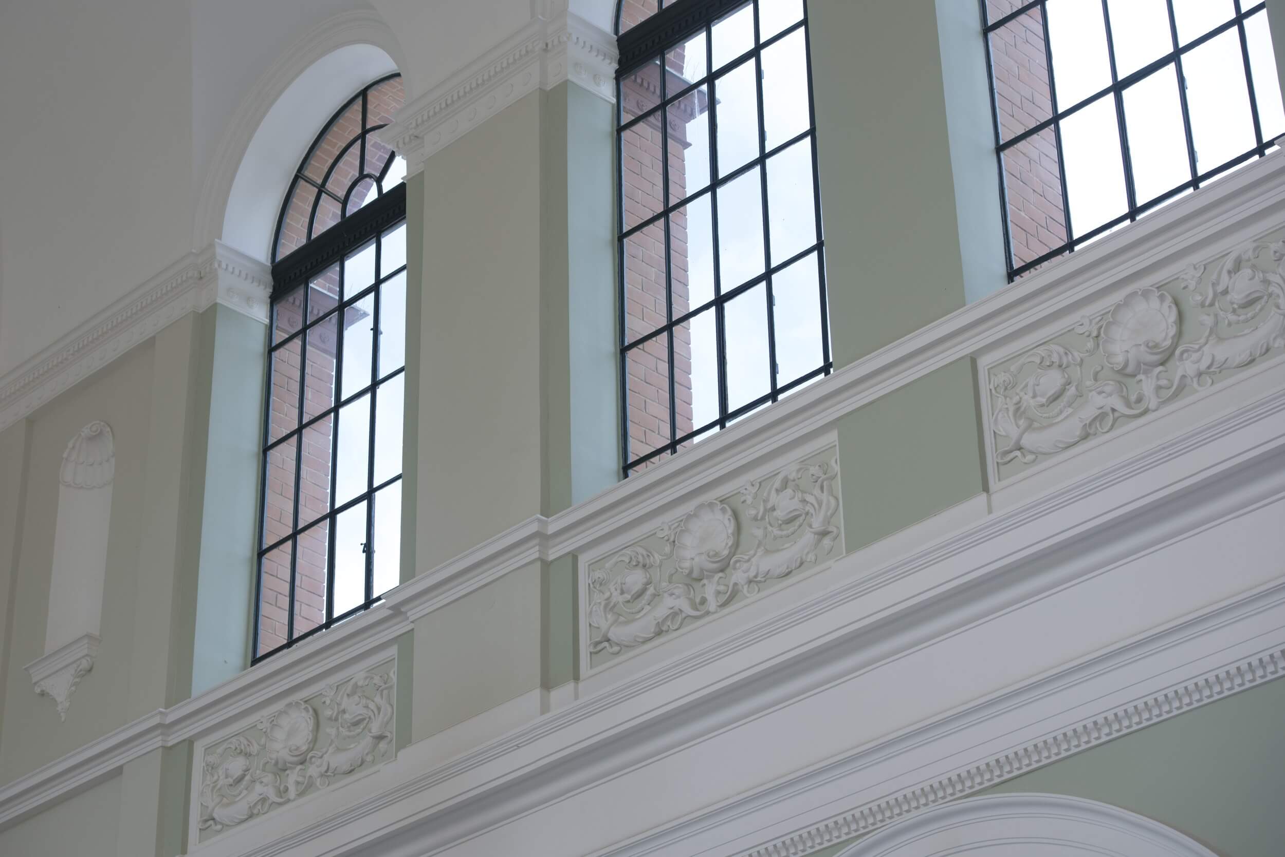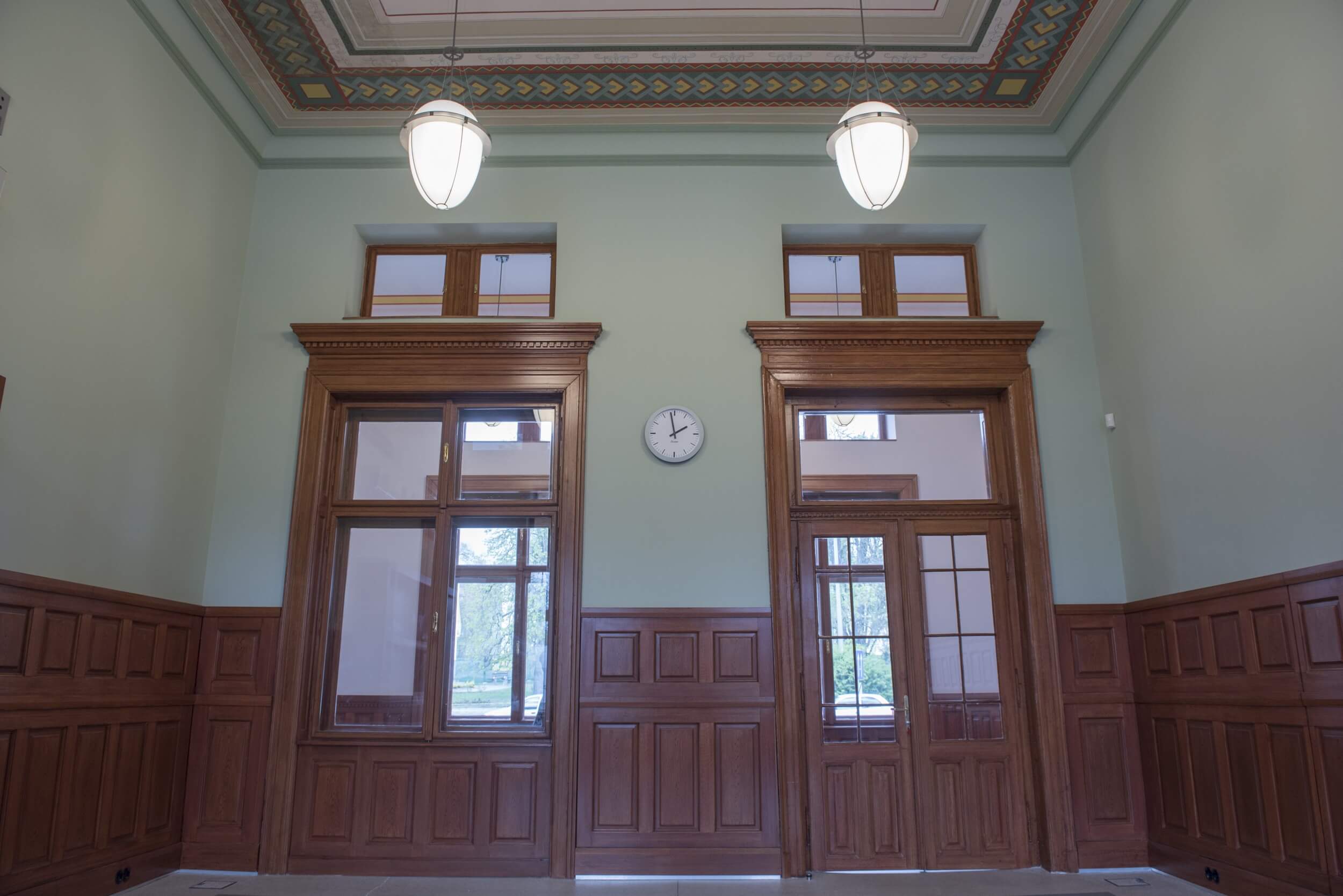 Mindezek mellett az összes megmenthető fa nyílászárót megmentették, amit nem, azt a régi minta alapján újra gyártották. „A sokszori átfestés során 8-10 rétegnyi mázolást csiszoltunk le, és újra flódereztük a nyílászárókat és a faburkolatokat.” A flóderezésben a régi nyílászárókat a fáig visszacsupaszítják, majd két réteg fehér alapozót visznek fel rá, a rétegek között tapaszolásokkal a fahibák kijavítására. „Ezután jön egy világosbarna alap, majd a díszítőfestő egy sötétbarna színnel viszi rá a kívánt (jelen esetben tölgy) faerezetet, végül mindezt kétszer lelakkozzuk.” Ezt a munkát összesen 150 nyílászárón kellett elvégezniük, valamint az összes belső faburkolaton, amelyek a közönségforgalmi terekbe kerültek be.