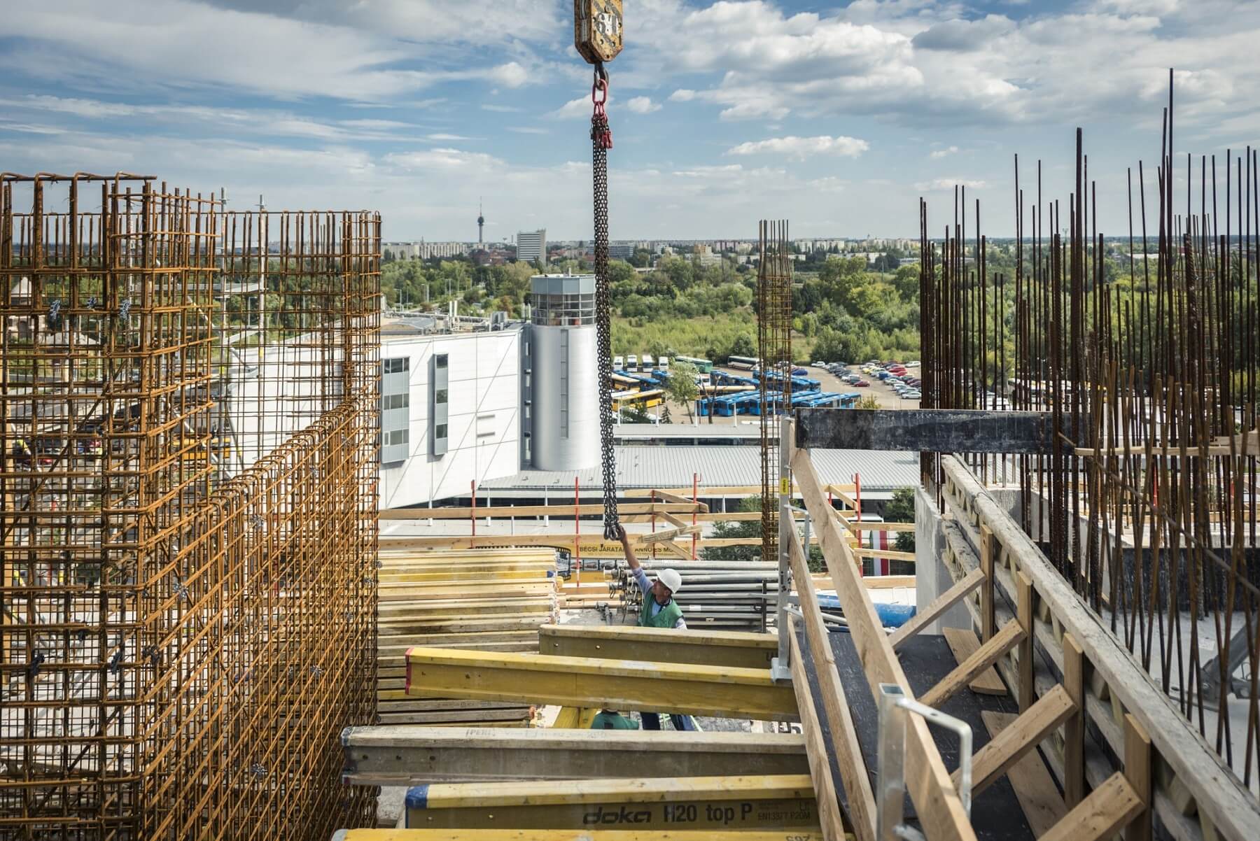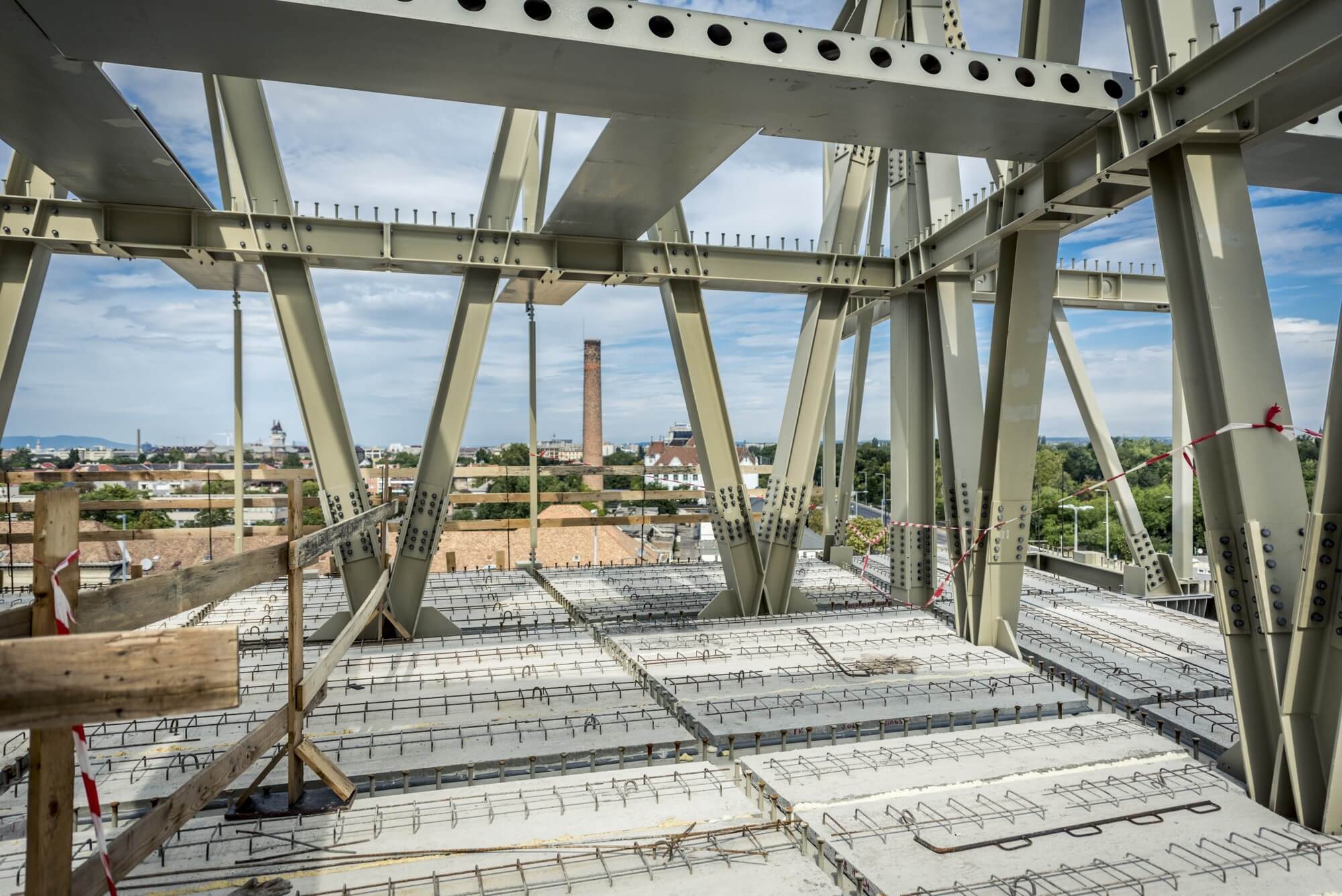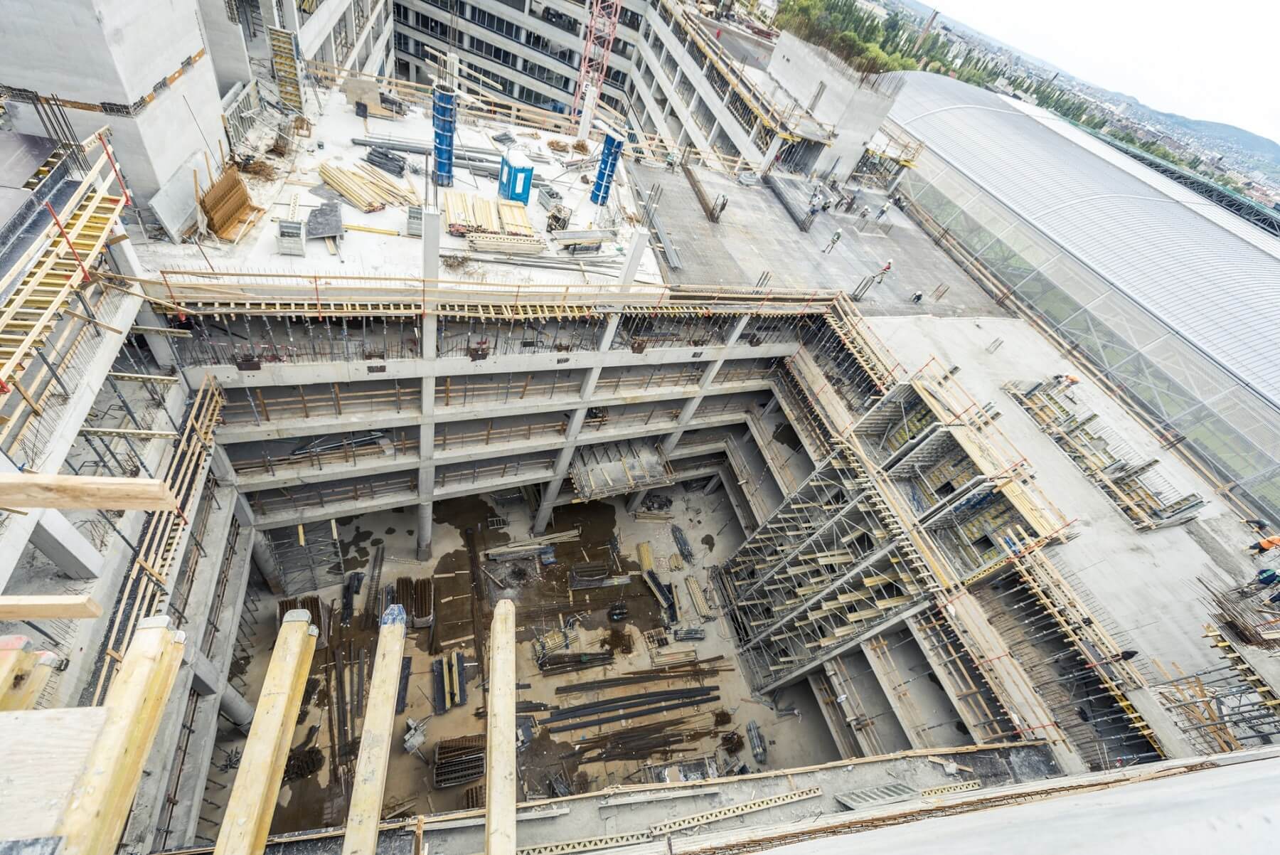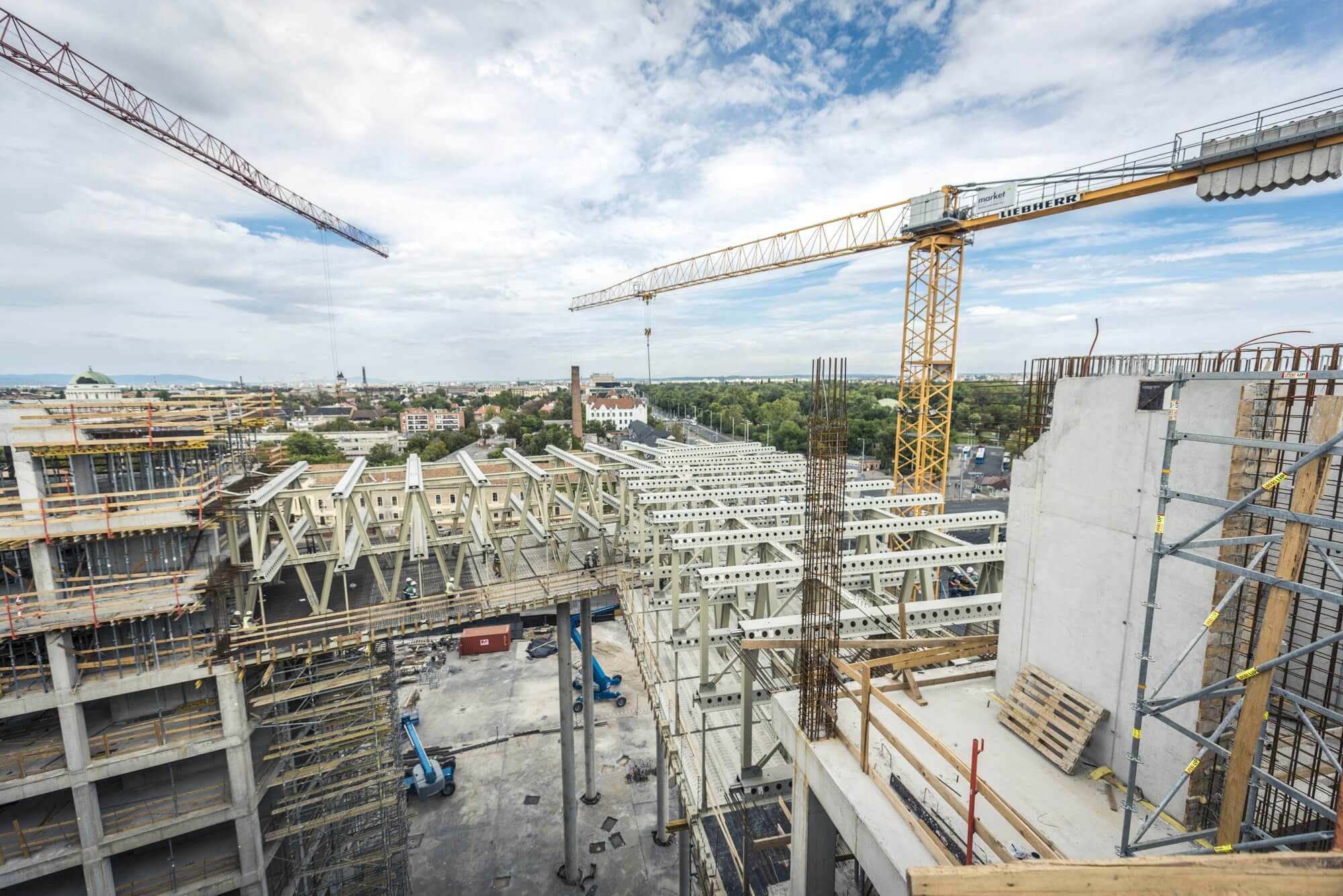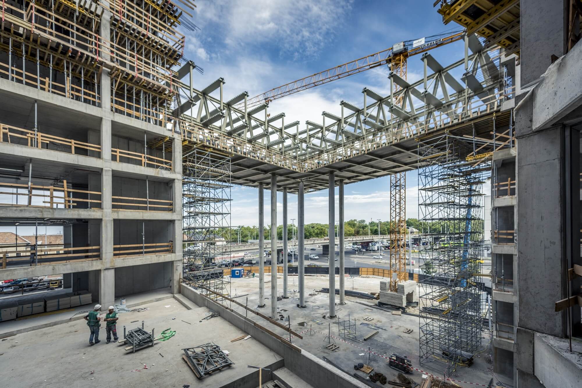 Ami a felszerkezetet illeti, részben már elkészült a zárófödém a nyolc- és a hétemeletes épületrésznél is, ugyanakkor az épület középső traktusában még a hatodik emelet tájékán tartanak. A szerkezetkész állapot október végére várható. Nagy előrelépésnek számított, hogy az épület sarkánál található, hét pilléren nyugvó, hatodik emelettől induló épületrész acélszerkezete készen van, itt már a vasbeton födémek behelyezése zajlik.