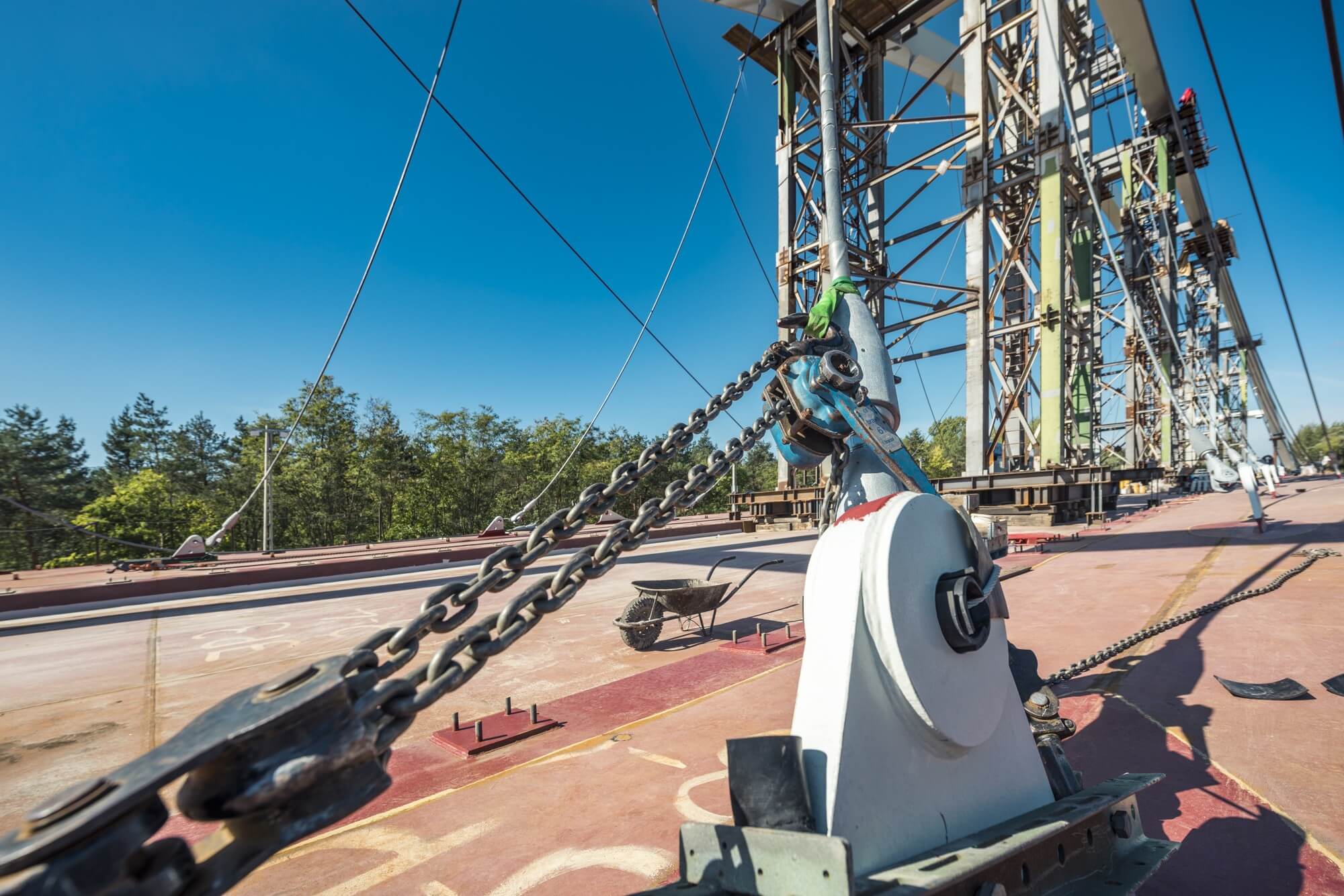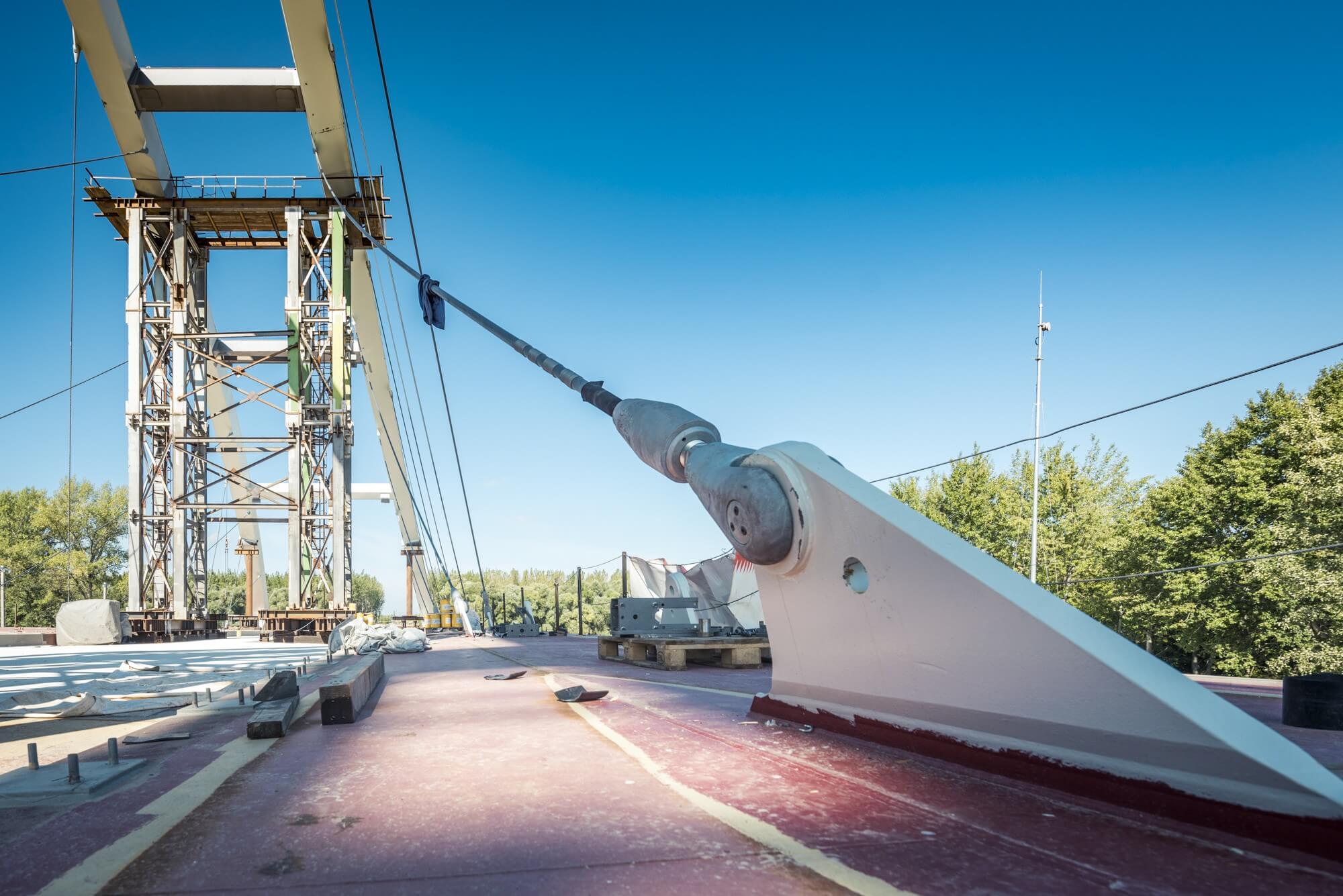 Négy darab száztonnás hidraulikus nyomó 3,6 méteres mozgatásokkal tolja a helyére a hidat, amit a parton épített fel a Hódút és a Strabag.