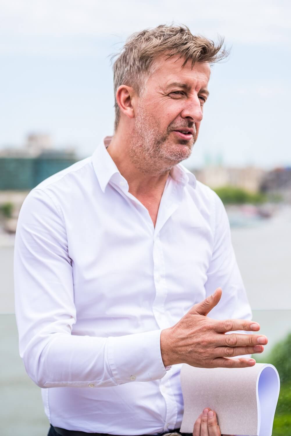 „Ez mintegy tíz évvel ezelőtt történt: akkor úgy gondoltam, hogy ide valamilyen bátor, formabontó épületet kell tenni. Ma már máshogy látom: a Clark Ádám téren építkezve nem érdemes konkurálni a Budai Várral vagy a Lánchíddal, hanem szerényen bele kell olvadni a környezetbe.”