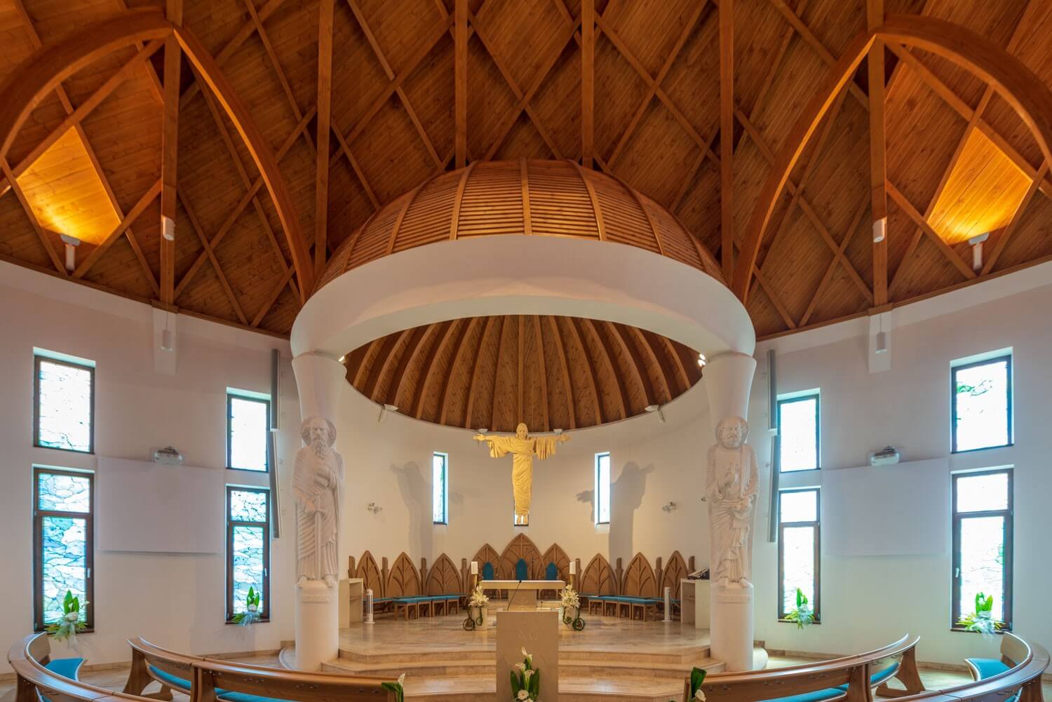 A 400 férőhelyes, több mint 1600 négyzetméter alapterületű templomot Nagy László építész tervei alapján alakították ki. A templomtérben a nagy kupola tetején található üvegben ábrázolták a Szentlelket, illetve szobrot állítottak Szűz Máriának és Keresztelő Szent Jánosnak is. Egy kisebb szentségi kápolna, egy sekrestye, valamint két nagyobb és egy kisebb közösségi terem is épült.