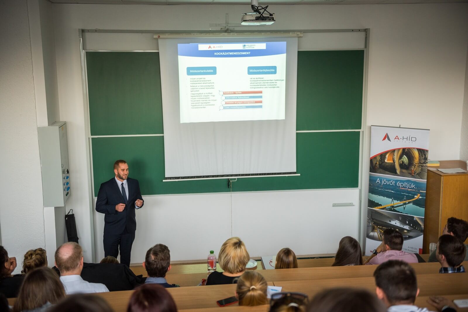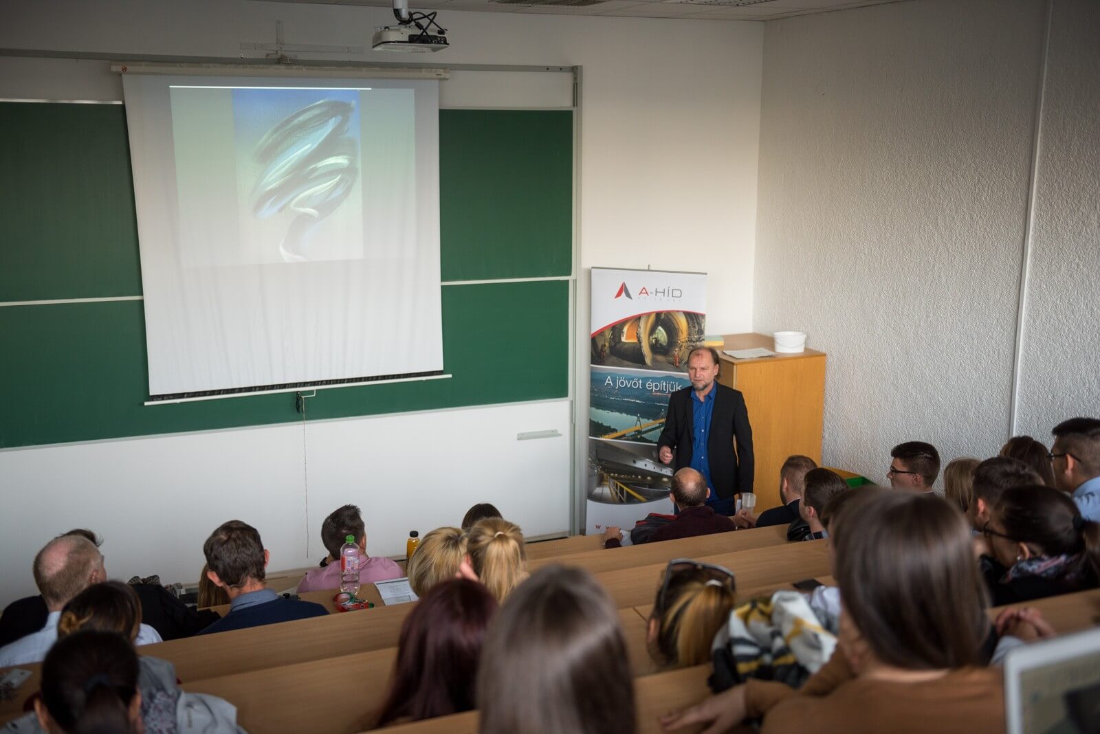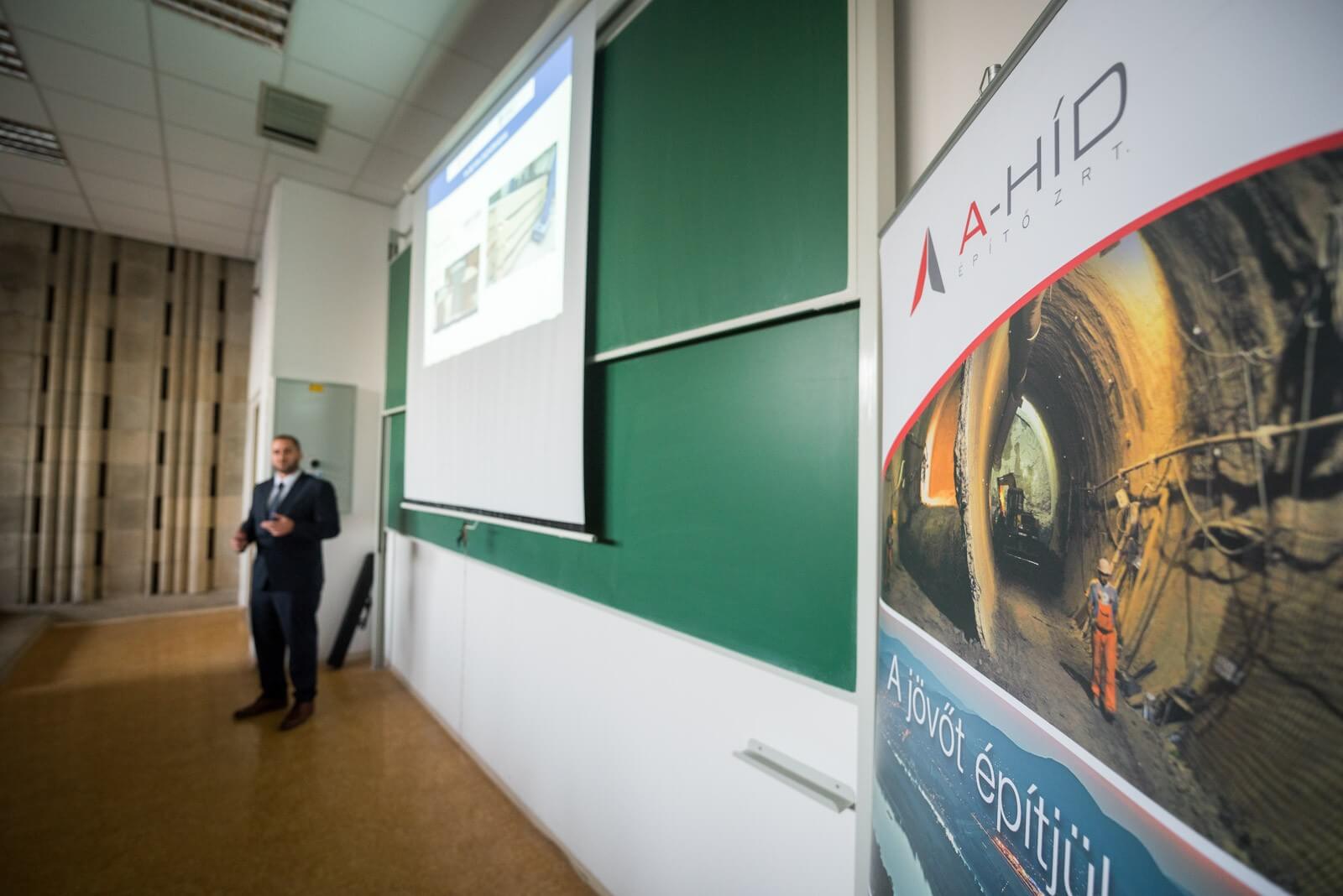 Előadásában kiemelte: az egyetemmel közös GINOP-os kutatásban – melyről korábban a Magyar Építőkön is beszámoltunk – szabadalmaztattak egy technológiát, aminek segítségével anélkül valósítható meg hídépítés, hogy zavarni, terelni kellene az alatta haladó forgalmat. A kutatáshoz és a cég egyéb tevékenységeihez folyamatosan igyekeznek bevonzani az új munkaerőt. Erre Gosztola Dániel maga is jó példa, hiszen idén került az A-Hídhoz, miután korábban megnyerte a TMDK-t.