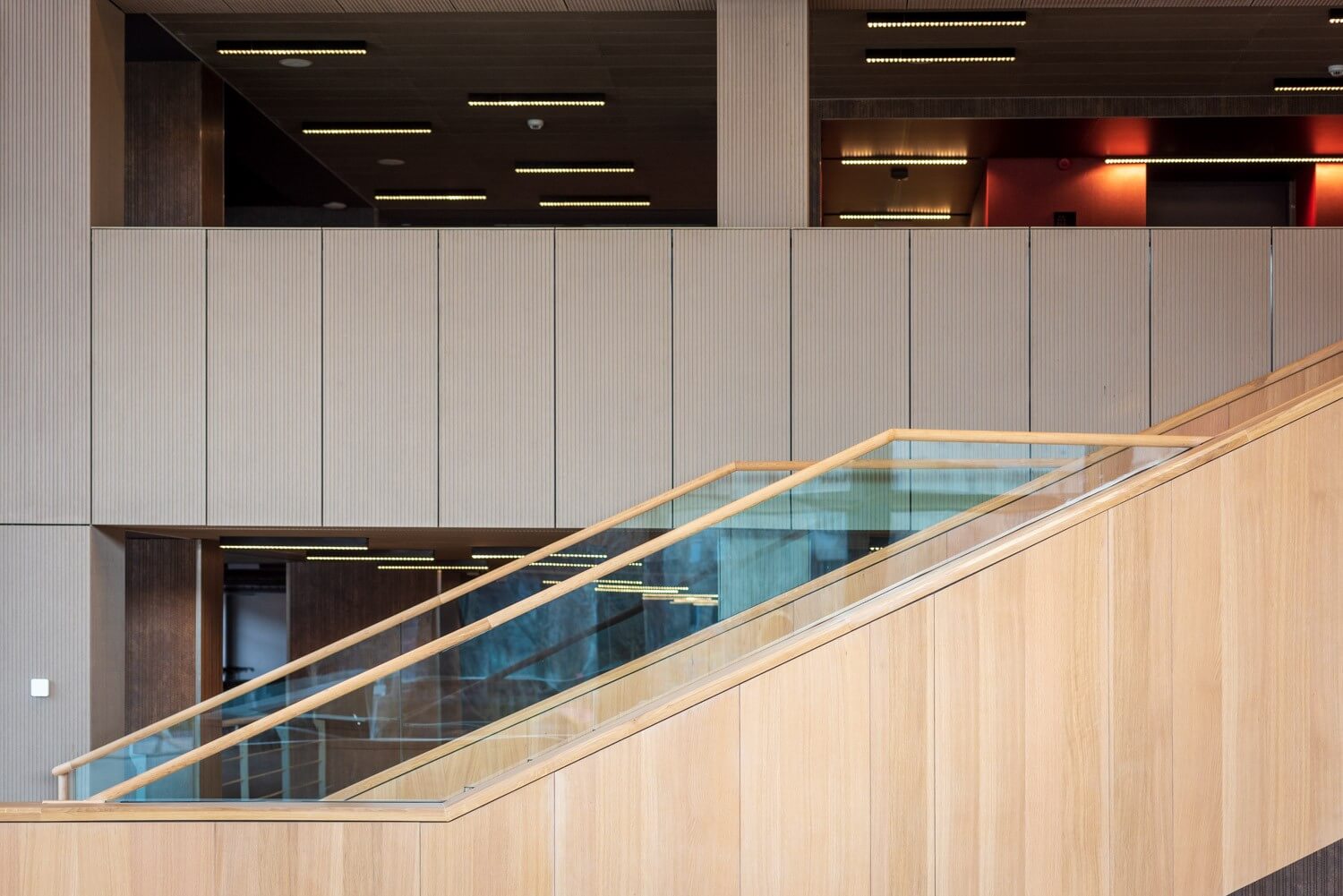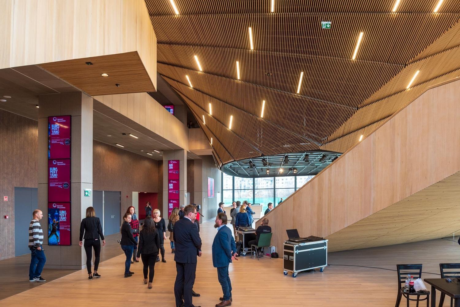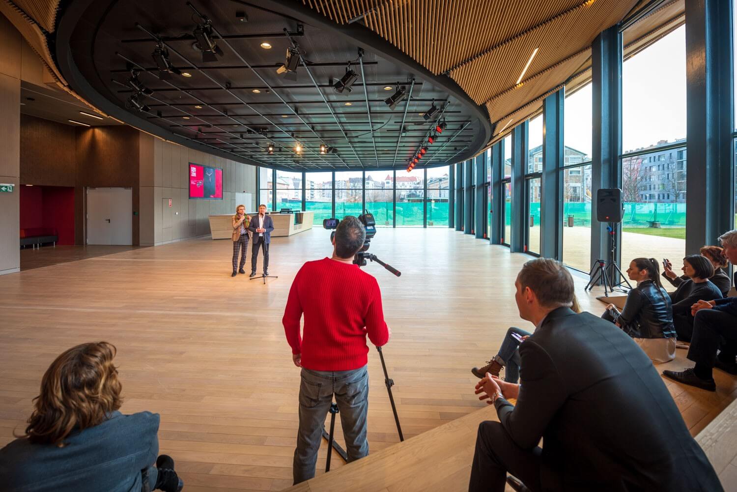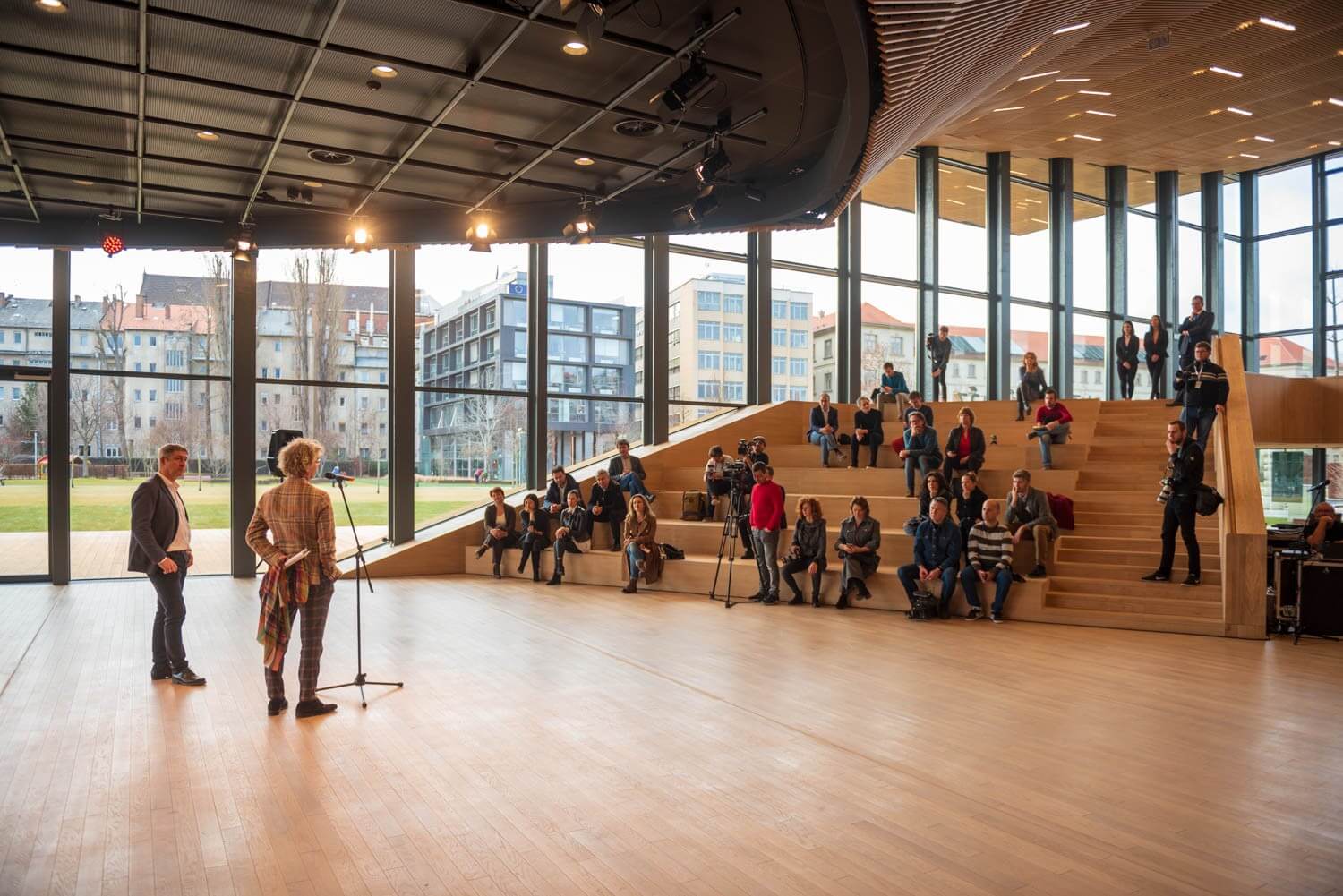 A projektről kiadott sajtóközlemény az épület egyik legérdekesebb részének a "térben lebegő kistermet" jelöli. Ez a helyiség az egybefüggő, pillérek nélküli előcsarnok felett kapott helyet.