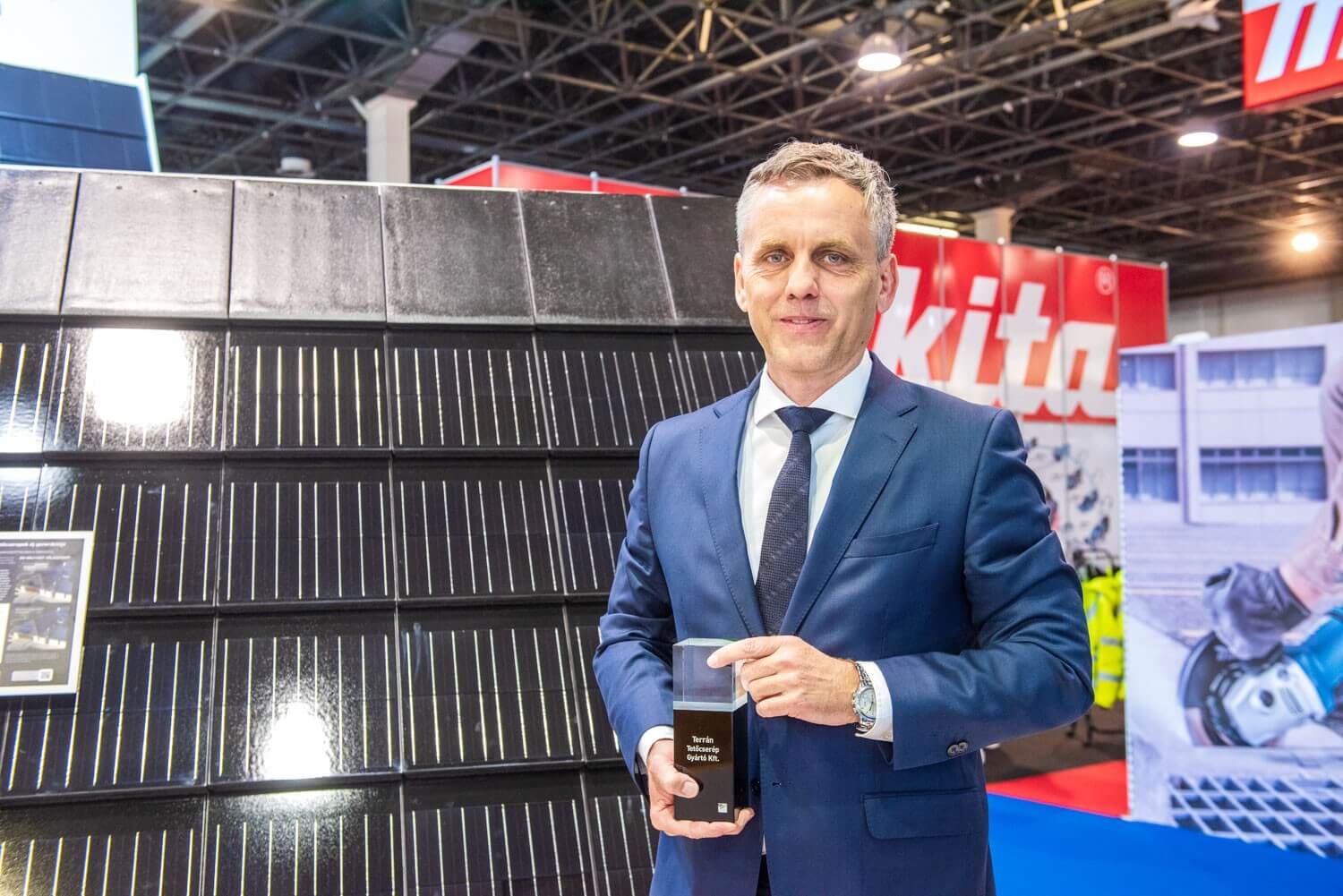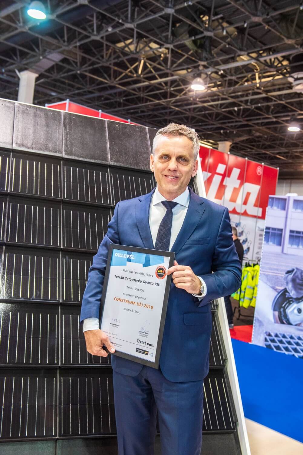 Óriási érdeklődés övezi a Terrán Tetőcserépgyártó Kft. által kifejlesztett napelemes tetőcserepet: a terméket bemutató videót például rövid idő alatt több mint 25 ezren tekintették meg a világhálón. Gódi Attilával a Terrán Tetőcserépgyártó Kft. ügyvezető igazgatójával a Generon piacra dobásának napján beszélgettünk a Construmán, ahol a termék Construma-díjban részesült.