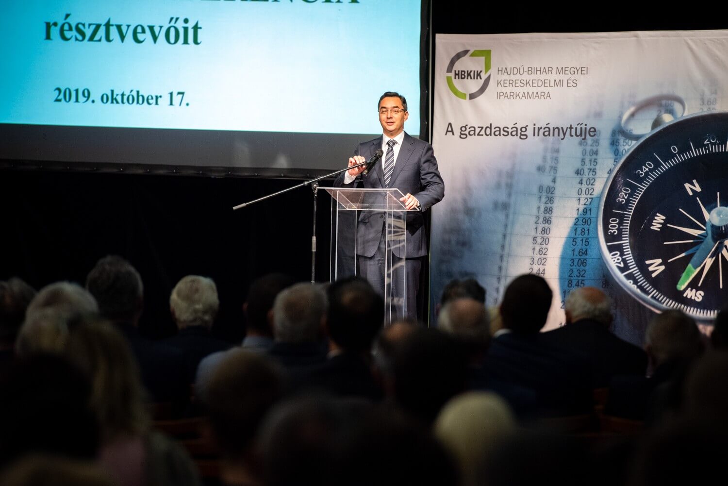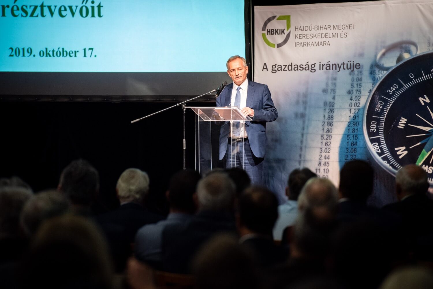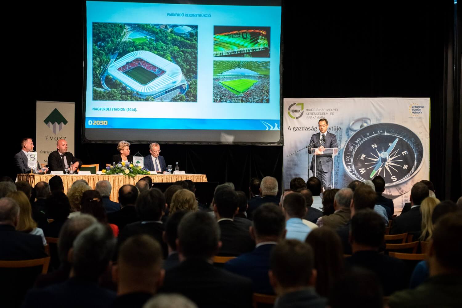 A folytatásban Dr. Papp László polgármester Debrecen városfejlesztési programját ismertette. Szavaiból kiderült, ma több mint 700 hektáron zajlanak iparfejlesztési munkálatok a városban, amiből a BMW 400 hektárt fed le, a hozzá kapcsolódó beszállítói park 100 hektárt tesz ki. Arra is utalt, hogy bár a világgazdaságban várható lassulás az építőiparra is hatással lesz, a Debrecenben 2014 és 2019 között beindult folyamatok pontosan ezt az időszakot fogják áthidalni, kompenzálva a visszaesést. „Rendkívül komoly gyárépítések és kapcsolódó infrastrukturális fejlesztések néznek majd szembe az esetleges lassulással.”