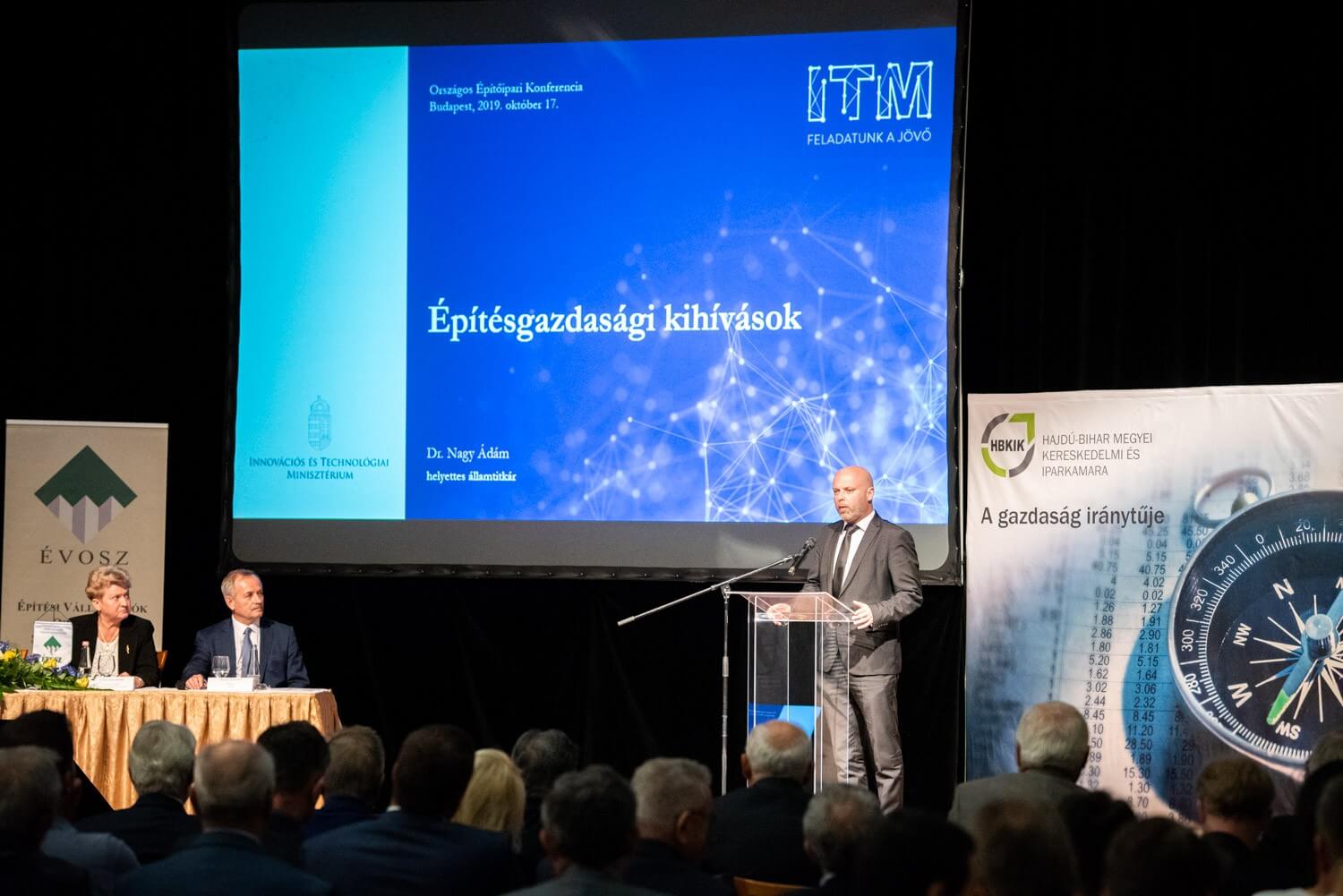 Az Információs és Technológiai Minisztérium részéről elsőként az iparági stratégiákért és szabályozásért felelős államtitkár tartott előadást a konferencián. Dr. Nagy Ádám nemzetgazdasági szinten mutatta be az építőipar szempontjából is fontos versenyképességi mutatókat, majd áttért a makrogazdasági alapvetésekre, melyek a versenyképesség fenntartásához kellenek. Beszédében hangsúlyozta, a hozzáadott értéket növelő cégek tudják megőrizni a versenyképességüket.