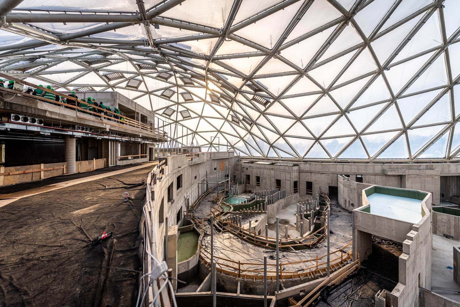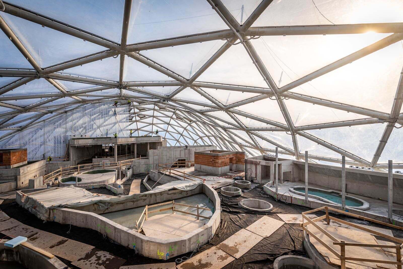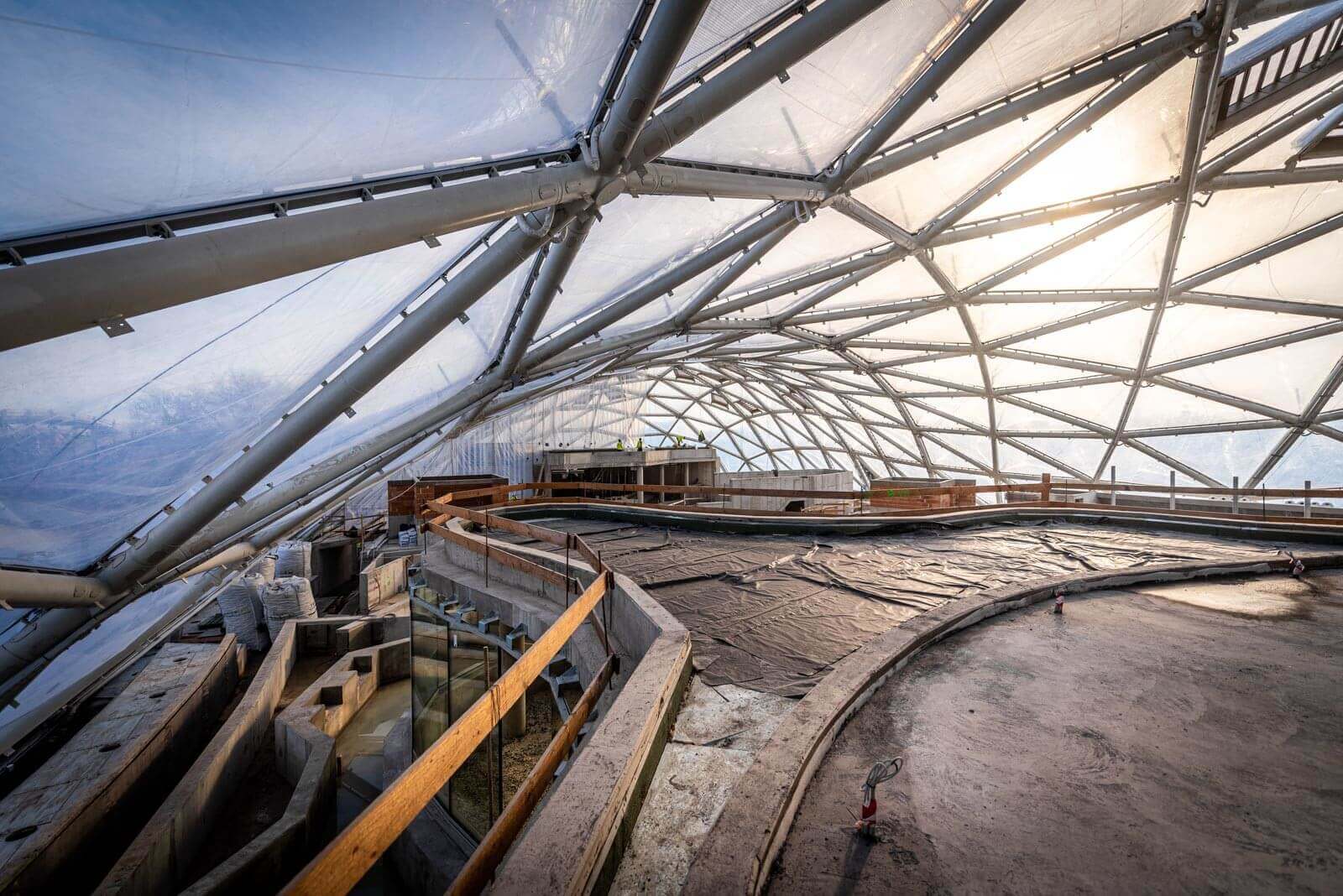 Ezt követően indulhattak az épület belső terében az állattartó terek, köztük az édesvízi és tengeri akváriumi medencék kialakítása, valamint a környező szabadtéri kifutók kiépítésével kapcsolatos munkálatok. A biodóm két fő részre lesz tagolható: egy akváriumi részre, illetve egy ősvadon részre.