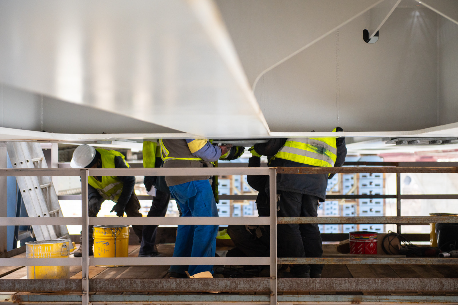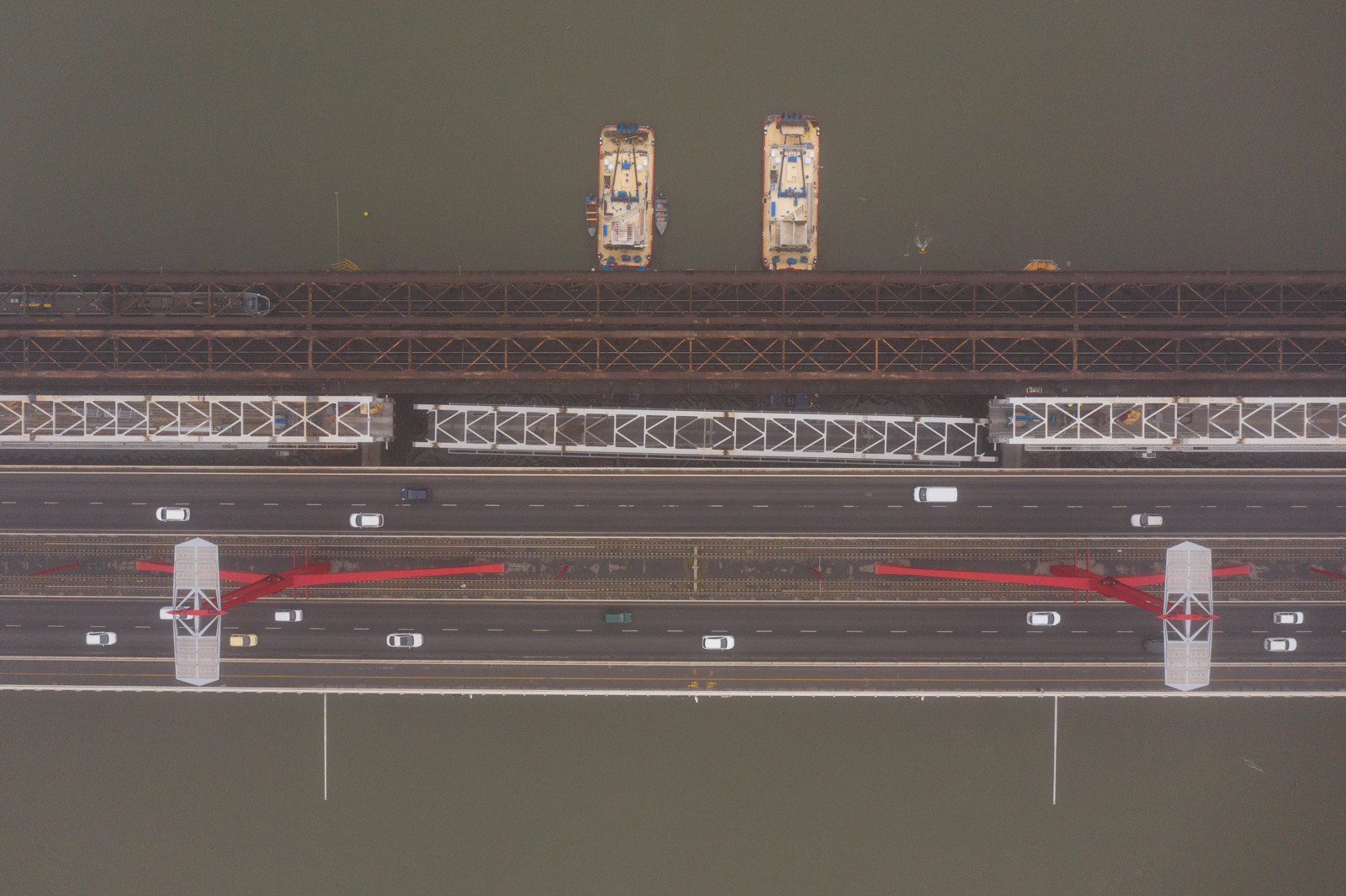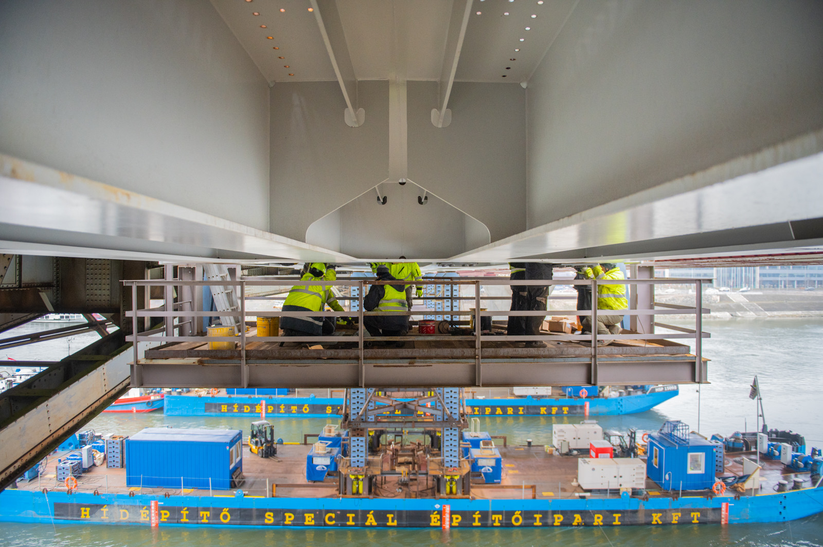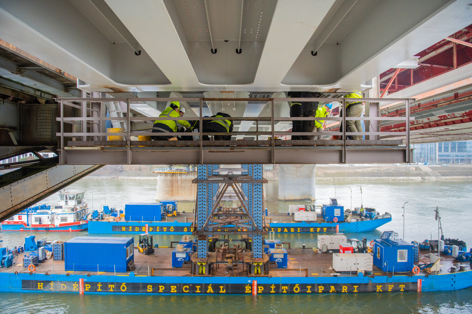 Mindeközben kezdetét vette a középső hídszerkezet egyes tartozékainak bontása is. Egyelőre csak az üzemi járdát és az ahhoz tartozó korlátot bontották el, de hamarosan megkezdődik az acélszerkezet darabolása és elszállítása is, ami – akárcsak az építés – a vízről fog történni.