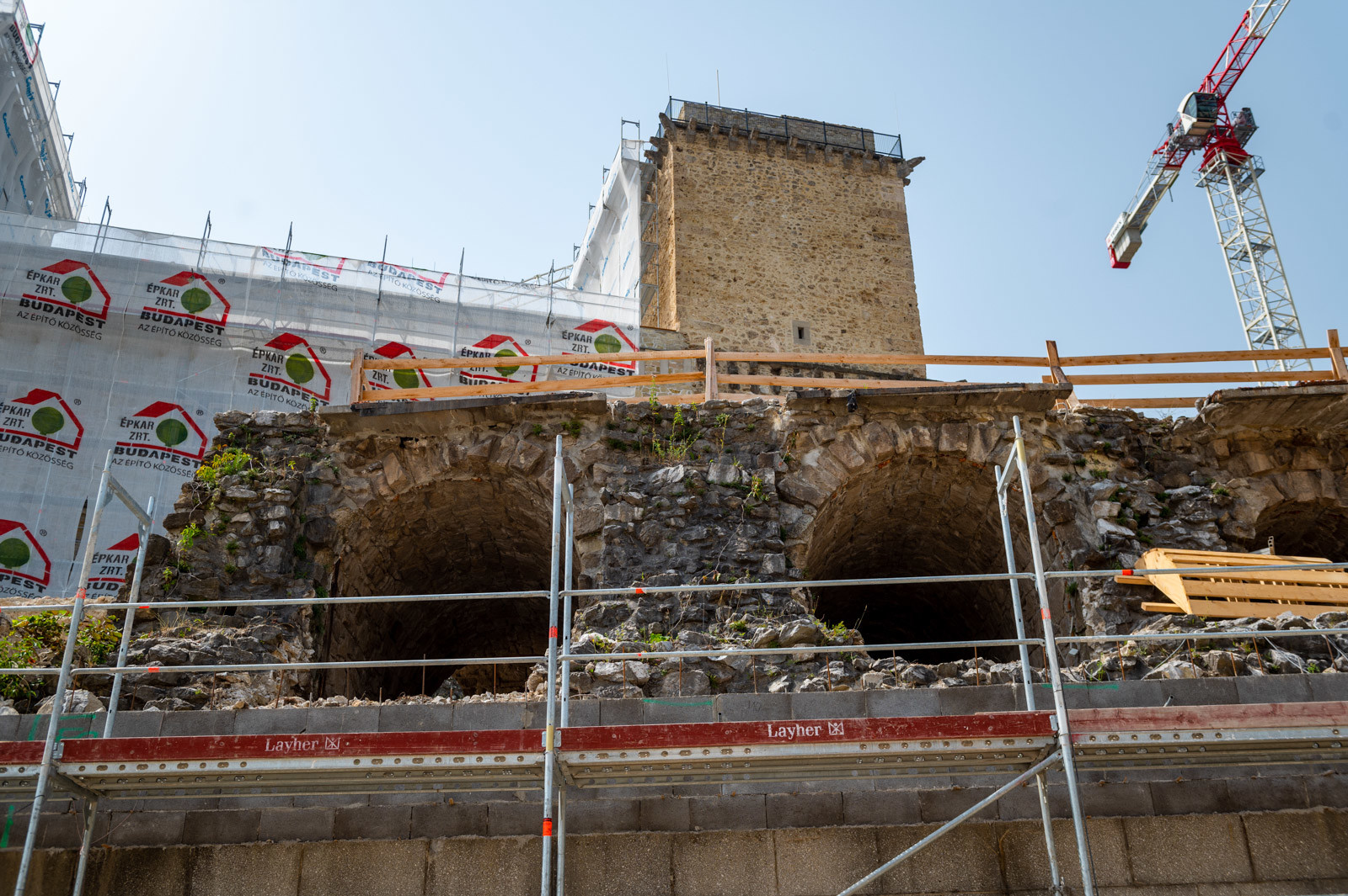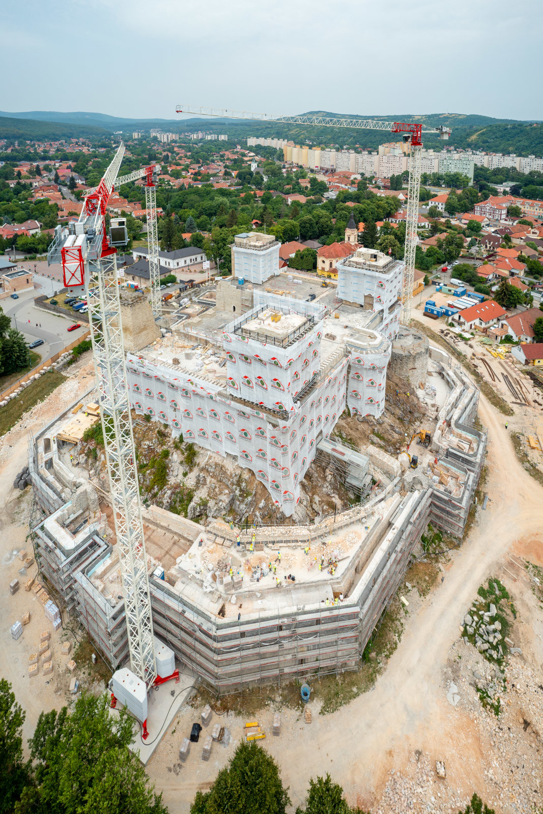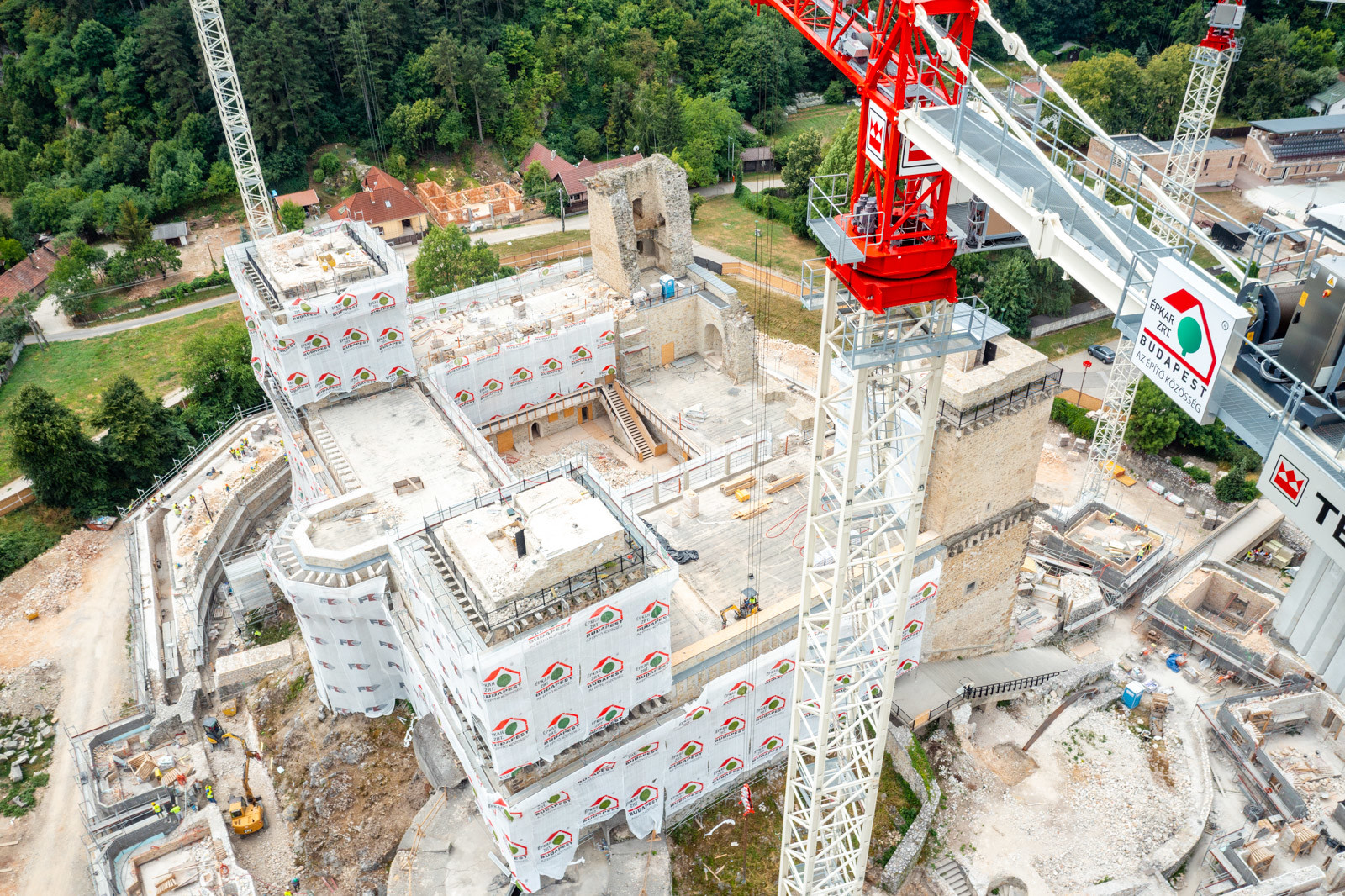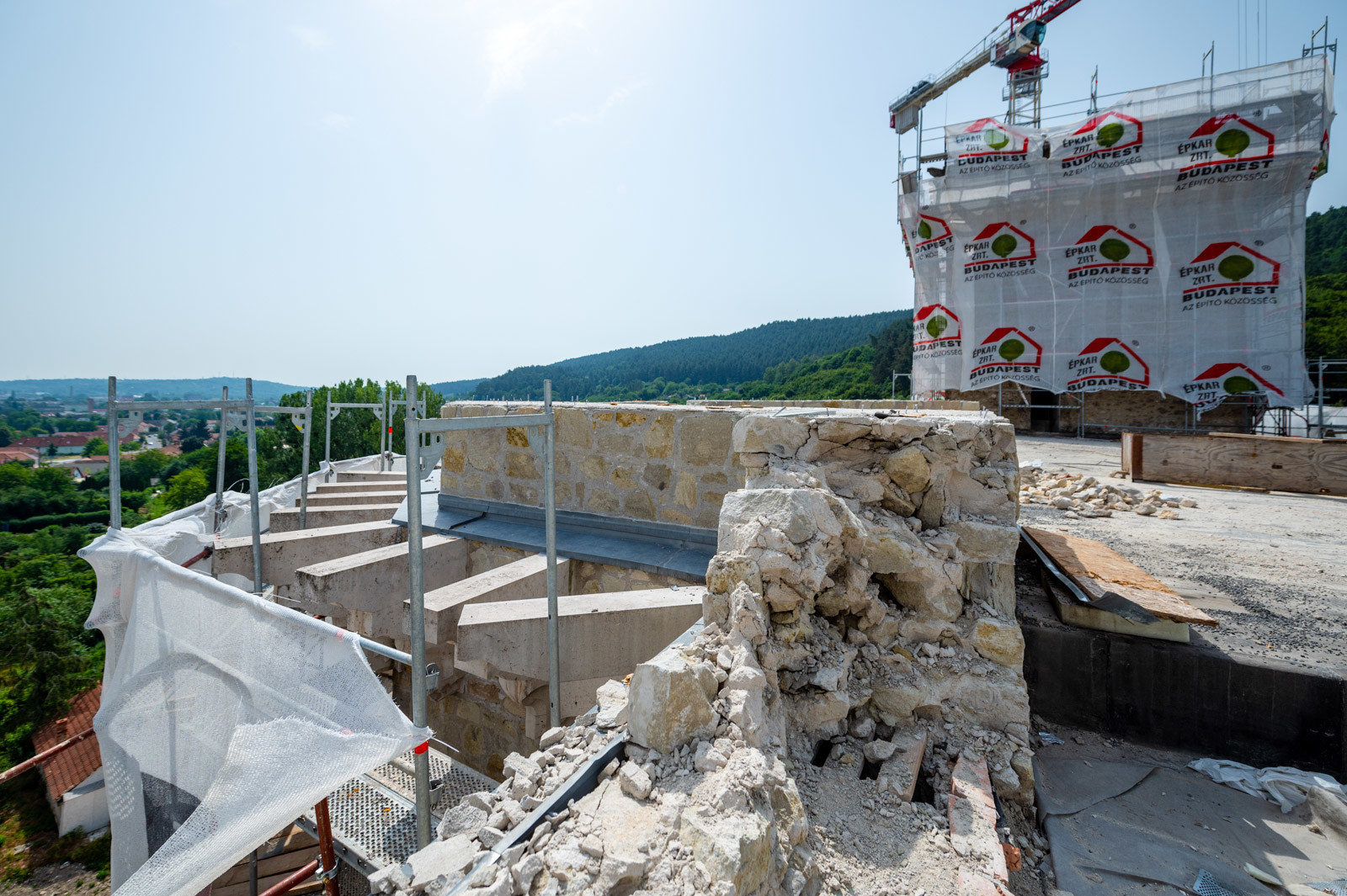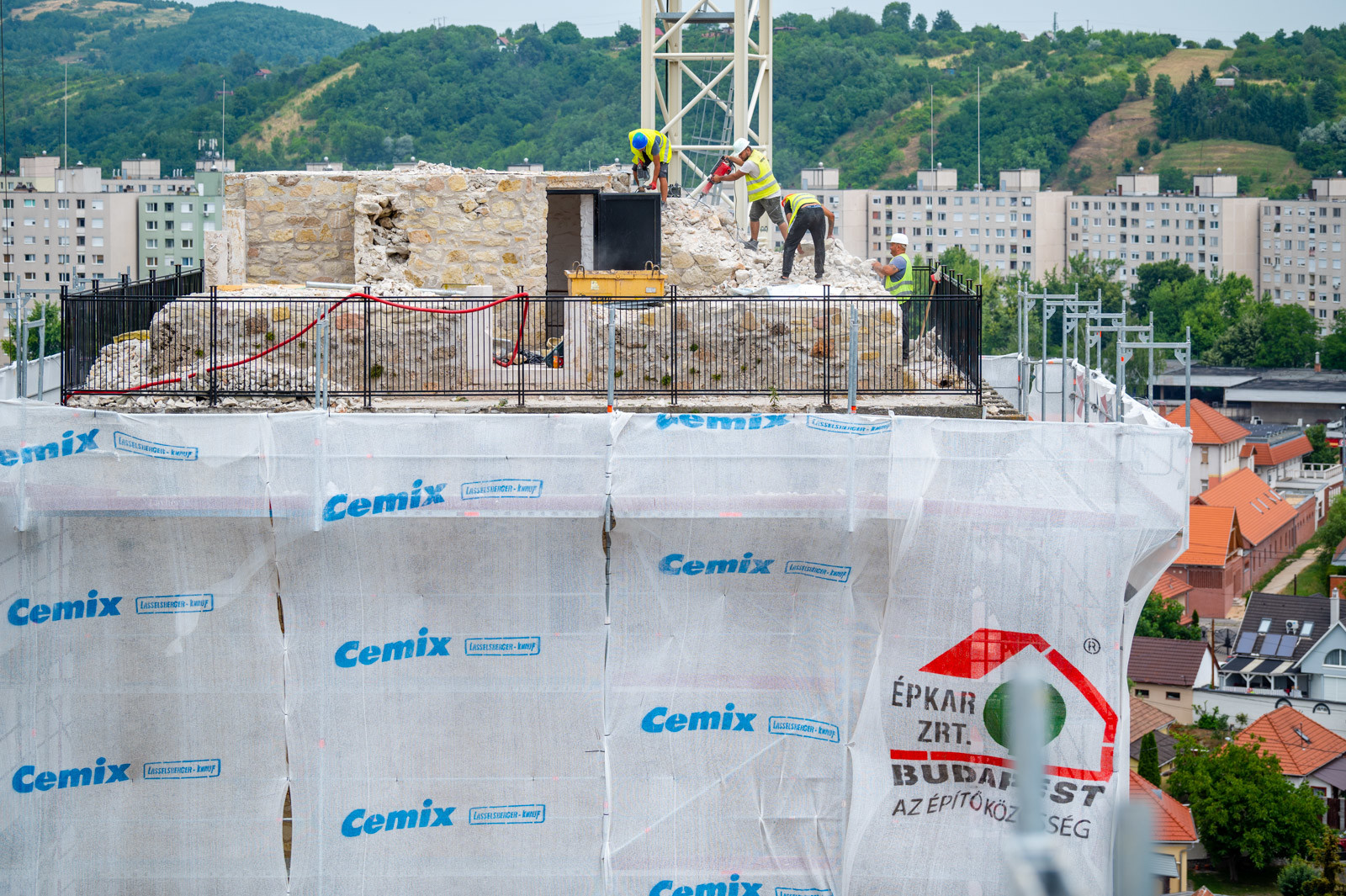 A külső vár falazásával terv szerinti ütemben haladnak. Ugyanakkor a vár udvarán a toronypárok földszinti része már elkészült, a kazamata szinten már a körbejárható 1. emeleti teraszokat építjük. „A vár szinte teljes kerületén megtörtént az állványzat elhelyezése a bontási és építési munkálatokhoz” – hangsúlyozta Mersits Ádám.