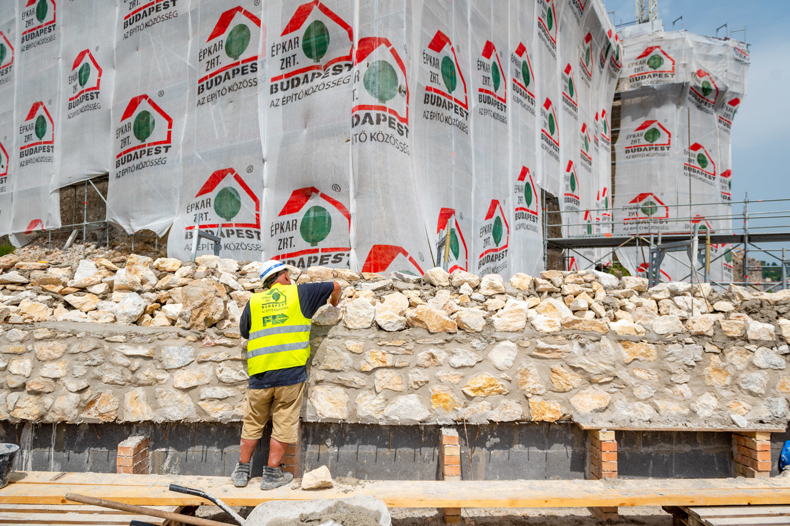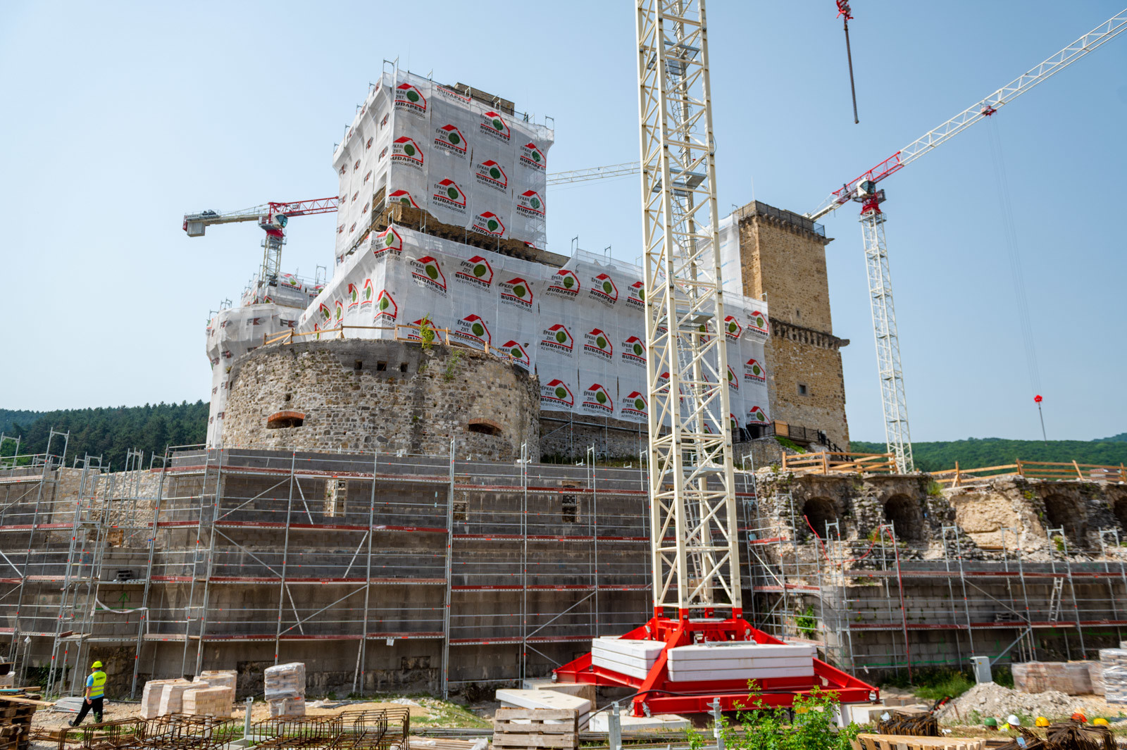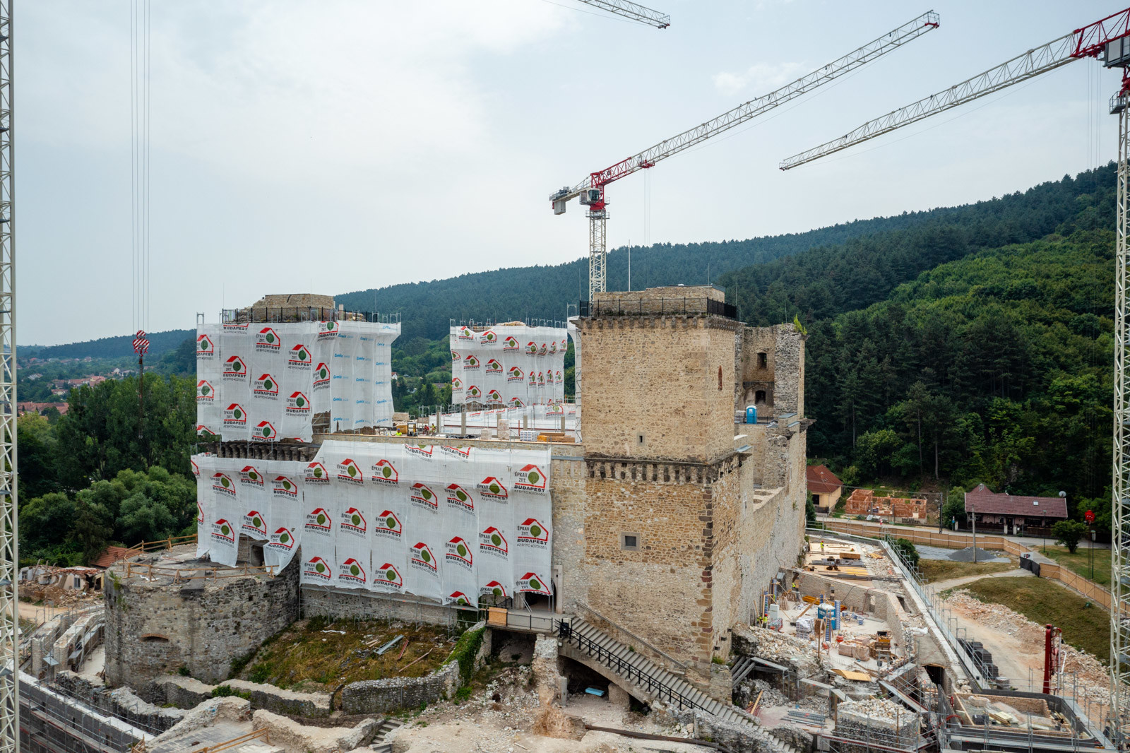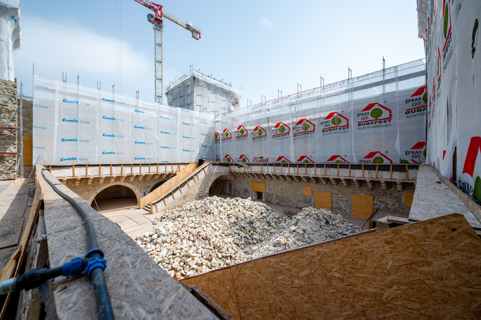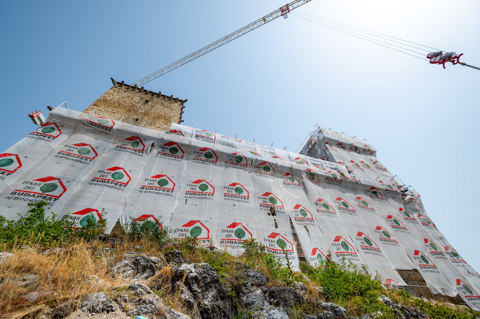A külső vár falazásával terv szerinti ütemben haladnak. Ugyanakkor a vár udvarán a toronypárok földszinti része már elkészült, a kazamata szinten már a körbejárható 1. emeleti teraszokat építjük. „A vár szinte teljes kerületén megtörtént az állványzat elhelyezése a bontási és építési munkálatokhoz” – hangsúlyozta Mersits Ádám.