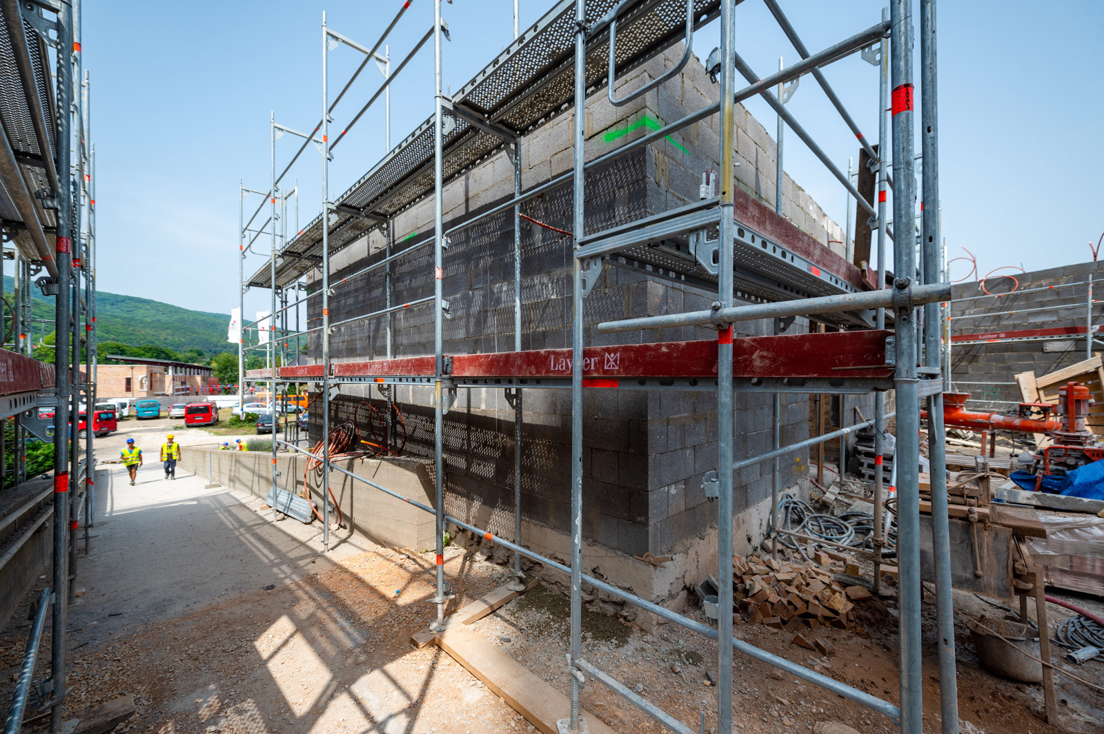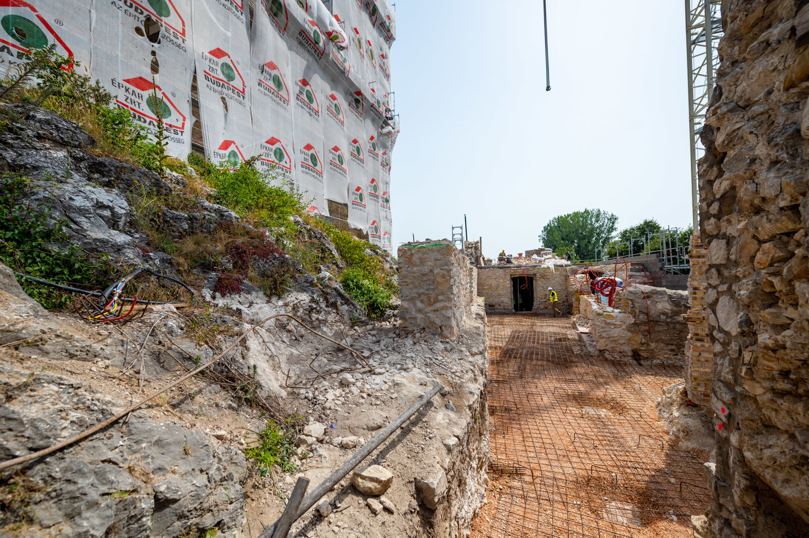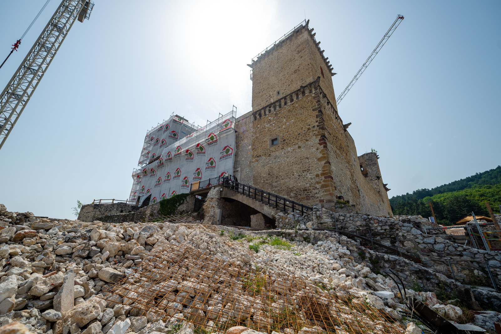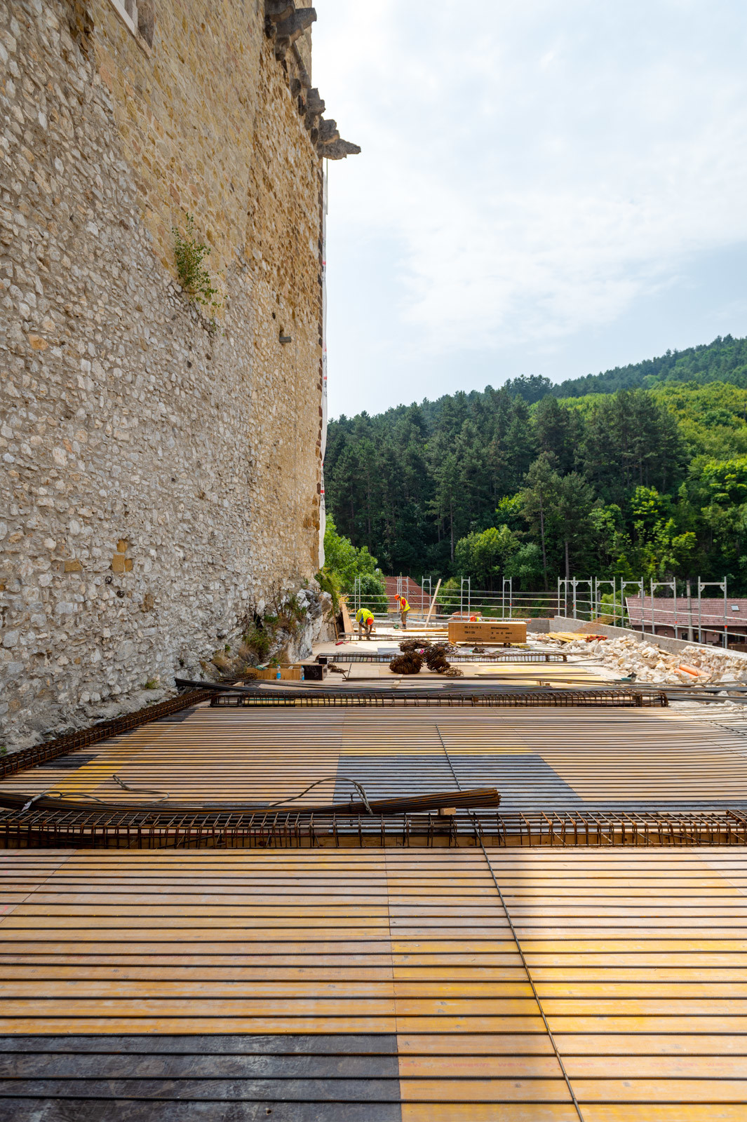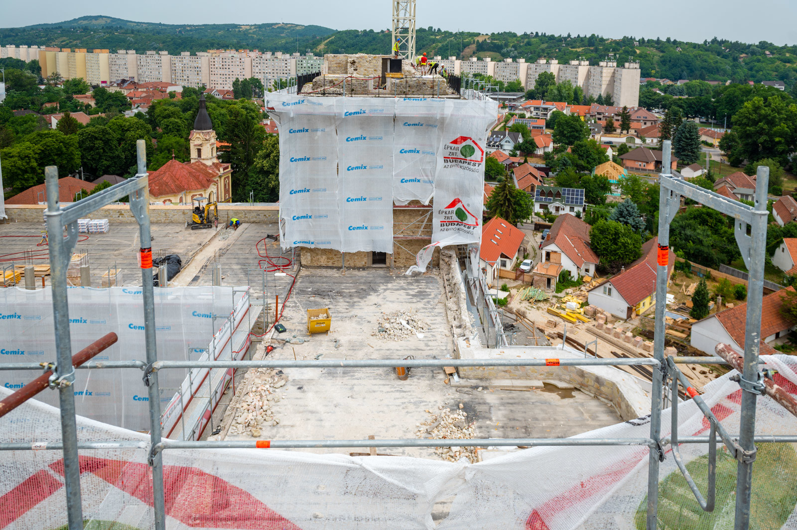 A külső vár falazásával terv szerinti ütemben haladnak. Ugyanakkor a vár udvarán a toronypárok földszinti része már elkészült, a kazamata szinten már a körbejárható 1. emeleti teraszokat építjük. „A vár szinte teljes kerületén megtörtént az állványzat elhelyezése a bontási és építési munkálatokhoz” – hangsúlyozta Mersits Ádám.