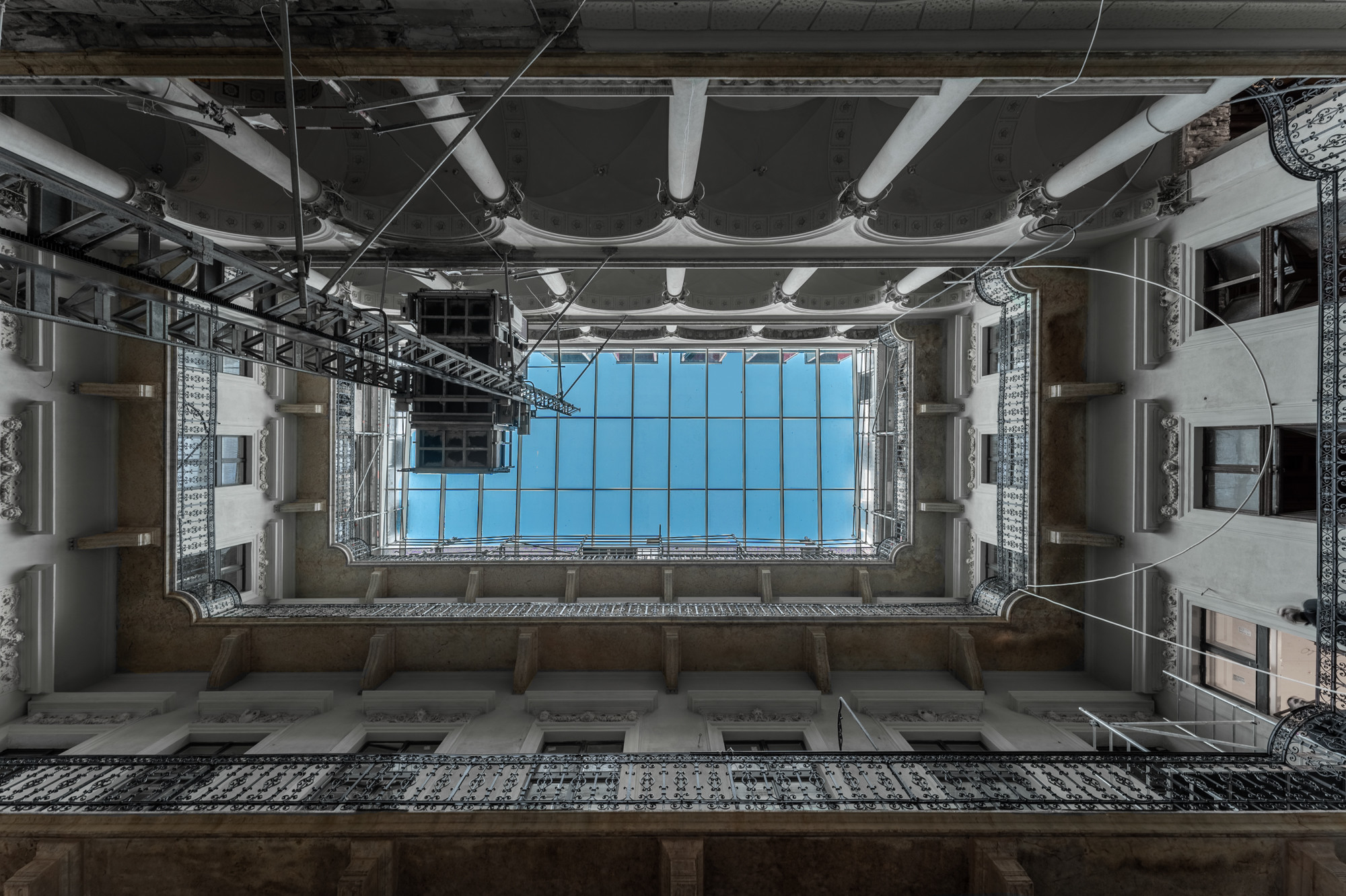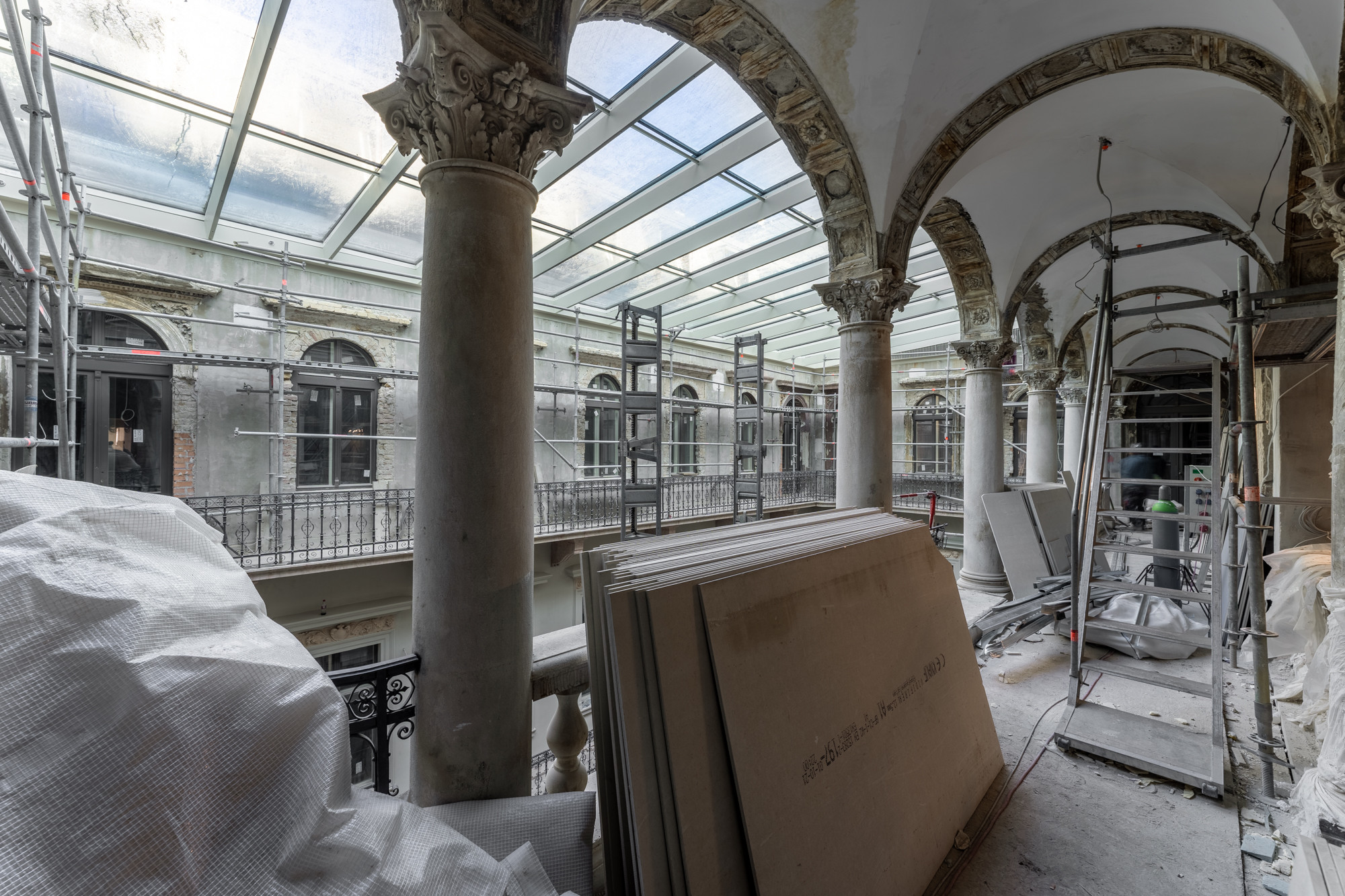 Szintén jelentős előrelépés, hogy az épület belső udvarát lefedő üvegtető elkészült. A műemléki homlokzat, körfolyosók és loggiák restaurálása már folyamatban van, az idei évben ez is elkészül.
