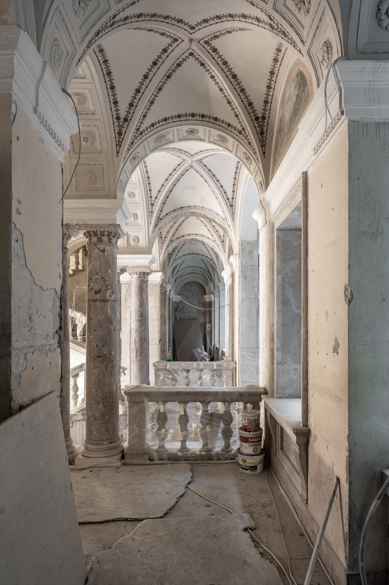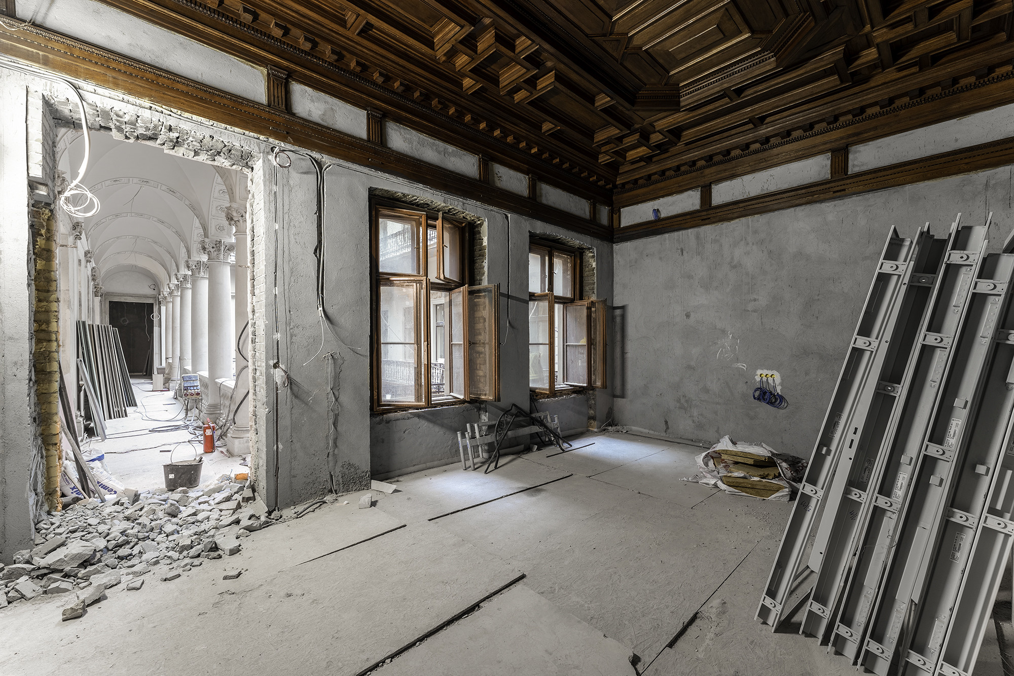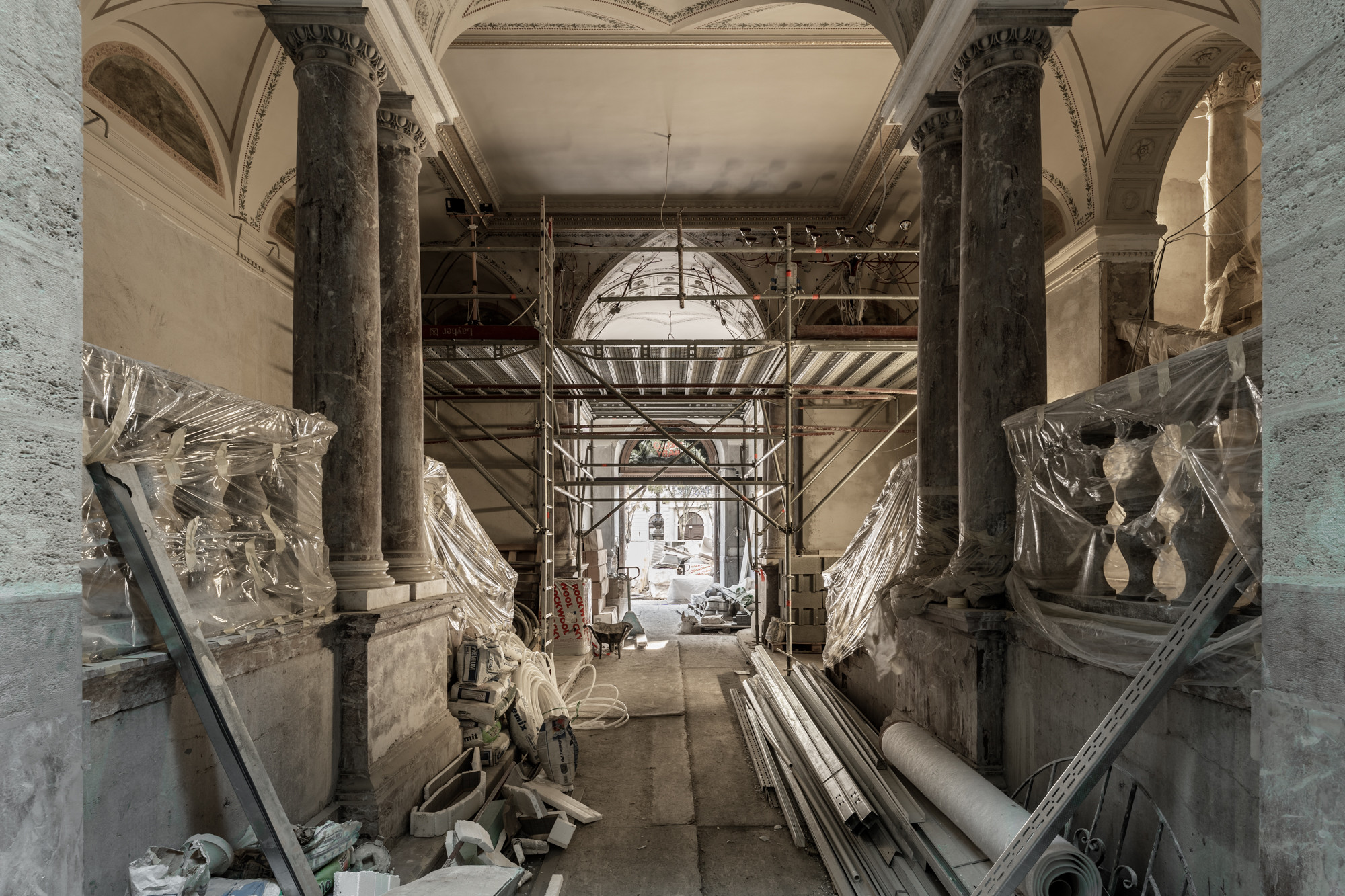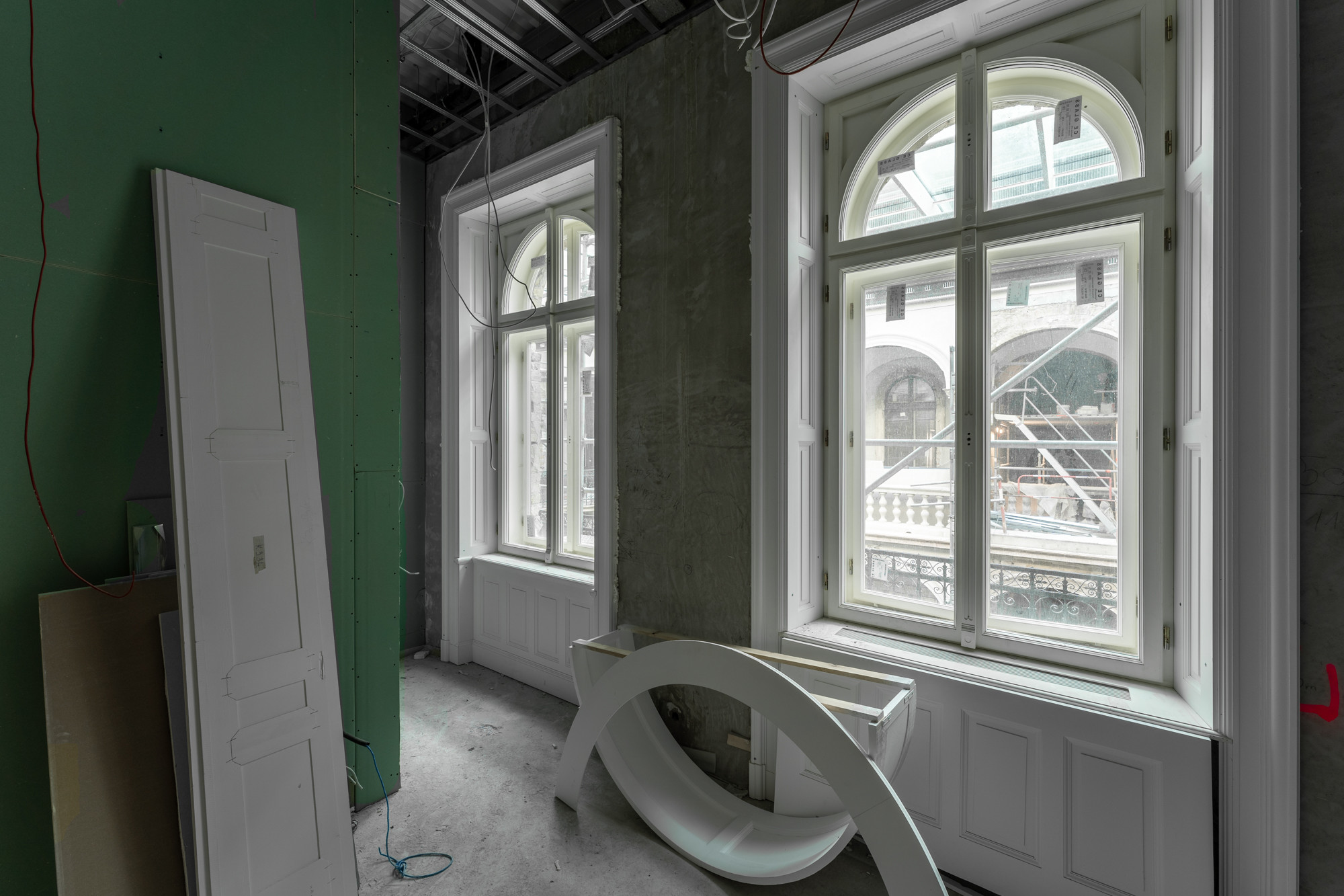 A projektben jelenleg már a befejező szakipari munkákat végzik: többek közt a gipszkartonozás, a válaszfalak és álmennyezetek építése, valamint a gépész-elektromos kiépítések zajlanak. „Ugyanakkor ide tartozik a festés és a tapétázás előkészítése: a falak és a mennyezetek glettelése, a díszítő stukkók elhelyezése, valamint a hidegburkolás. Továbbá zajlik a műemléki terek márvány padlóburkolatának kivitelezése” – tette hozzá az építésvezető.