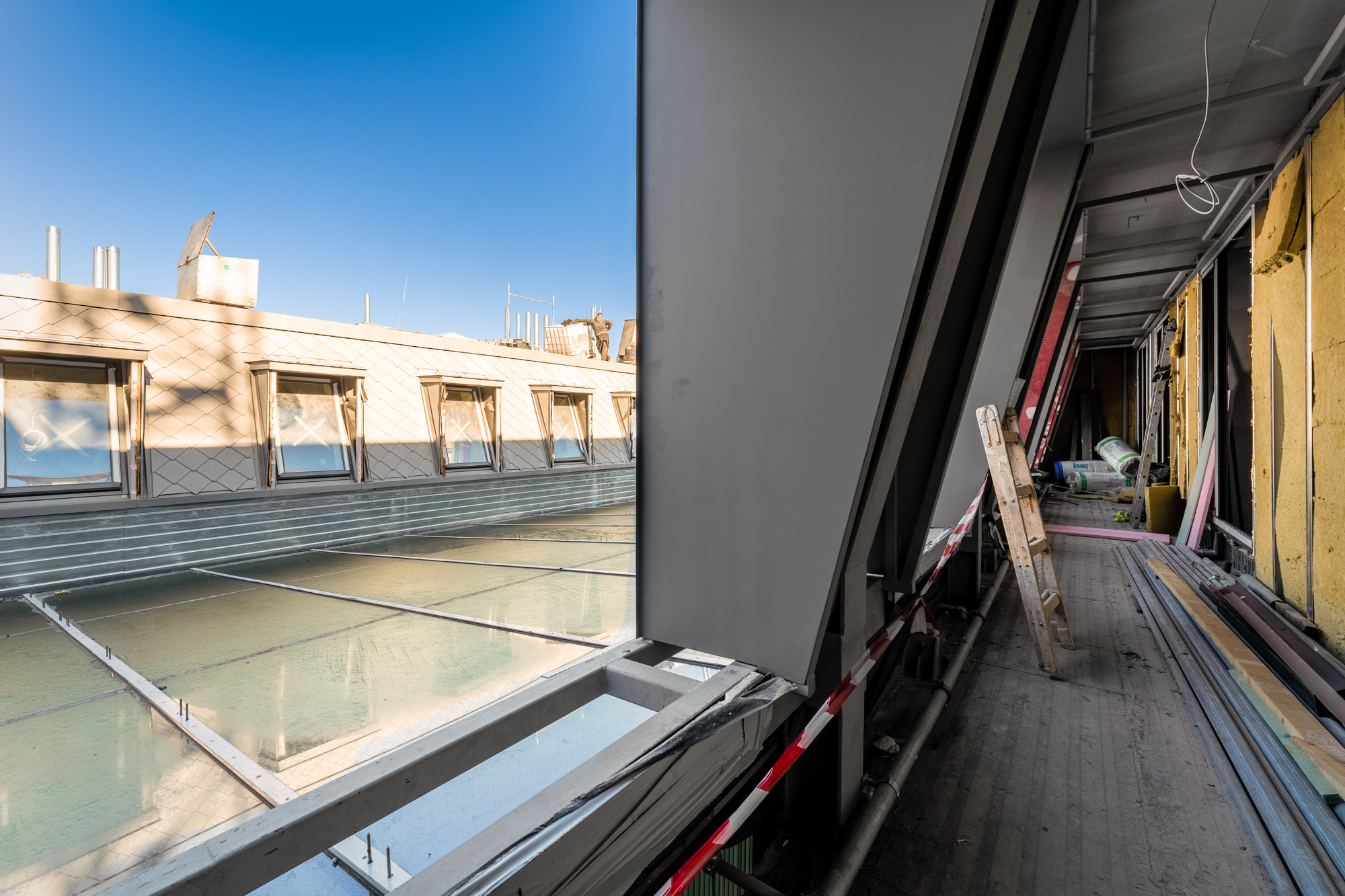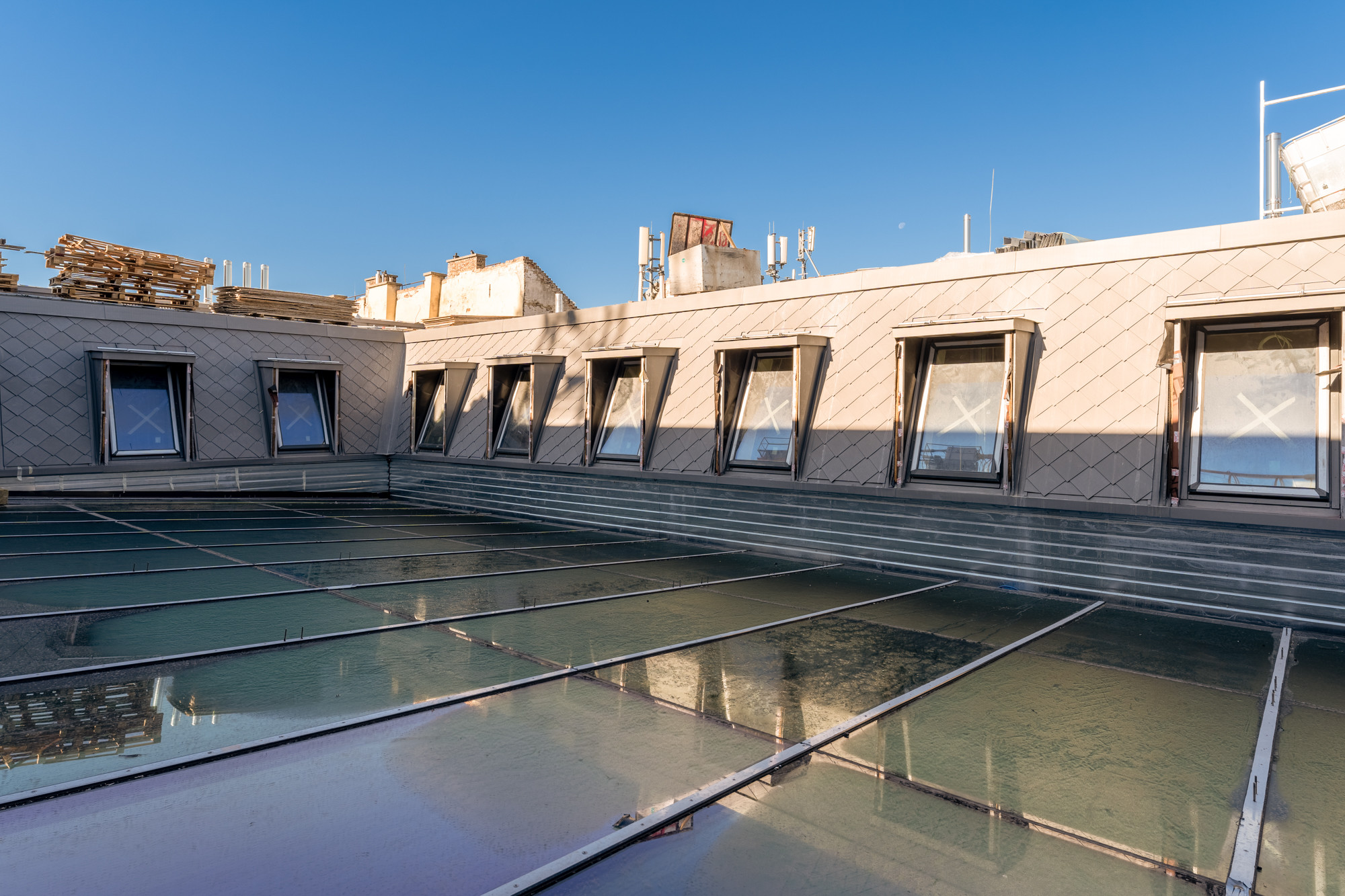 Szintén komoly odafigyelést tett szükségessé a homlokzat, amelyet acél segédtartó szerkezettel támasztottak meg az új, acélszerkezetű födém elkészültéig. Az építésvezető hozzátette, az eredetivel egyező dőlésszögű tető acélszerkezettel épült újjá. „Erre készült el a tetőhéjalás, vízszigetelés, valamint a kiselemes és állókorcos bádogfedés.”