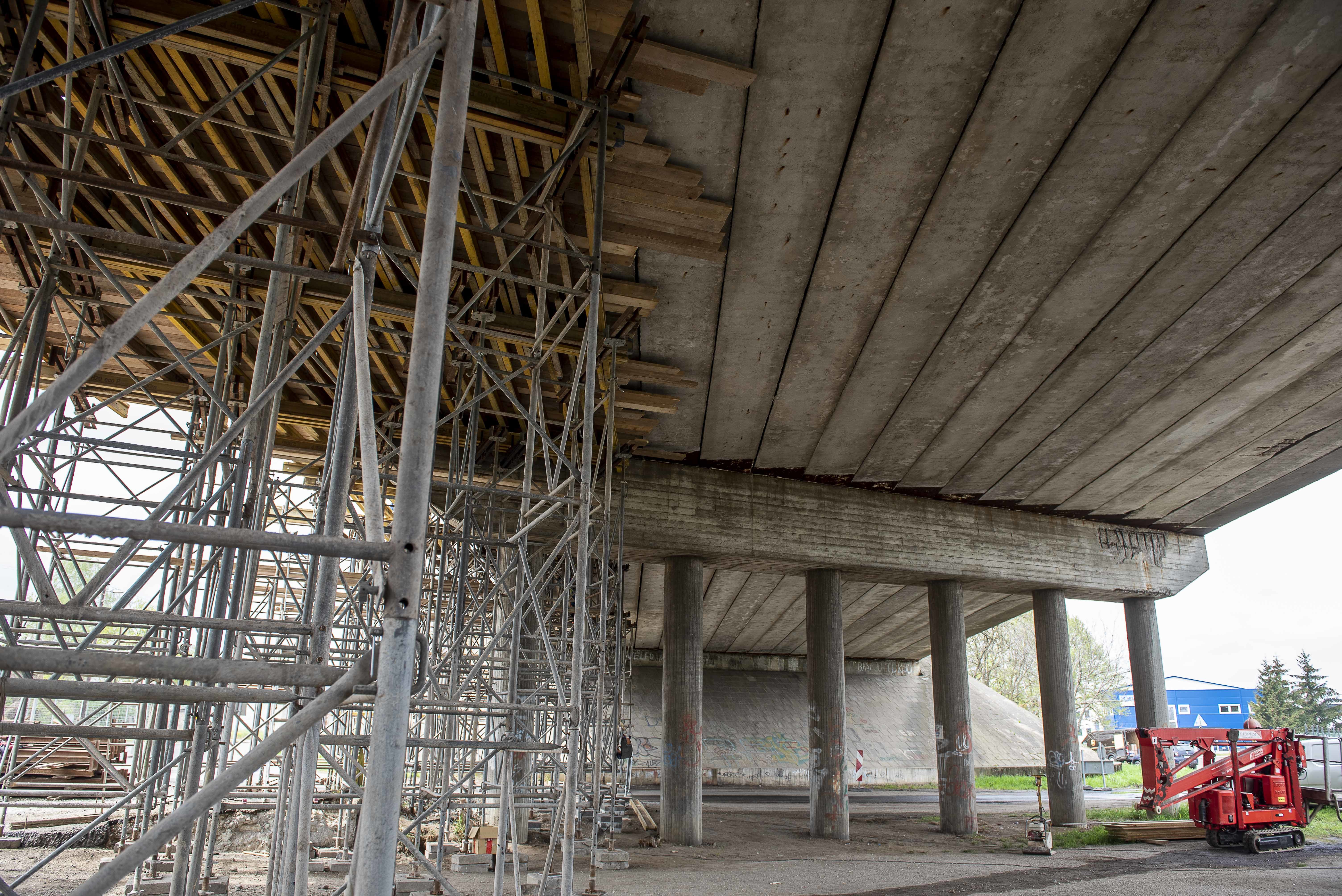 „A kivitelezés egyik leglátványosabb munkafolyamata a tizenhat, egyénként 23.5 méteres tartógerenda beemelése volt. A munkálatok nagy szakmai kihívást jelentenek, hiszen a közúti és a vasúti forgalom is folyamatos az építkezés alatt, ráadásul a felüljáró alatt magasfeszültségű vezeték miatt szigorú előírásoknak kell megfelelni.”