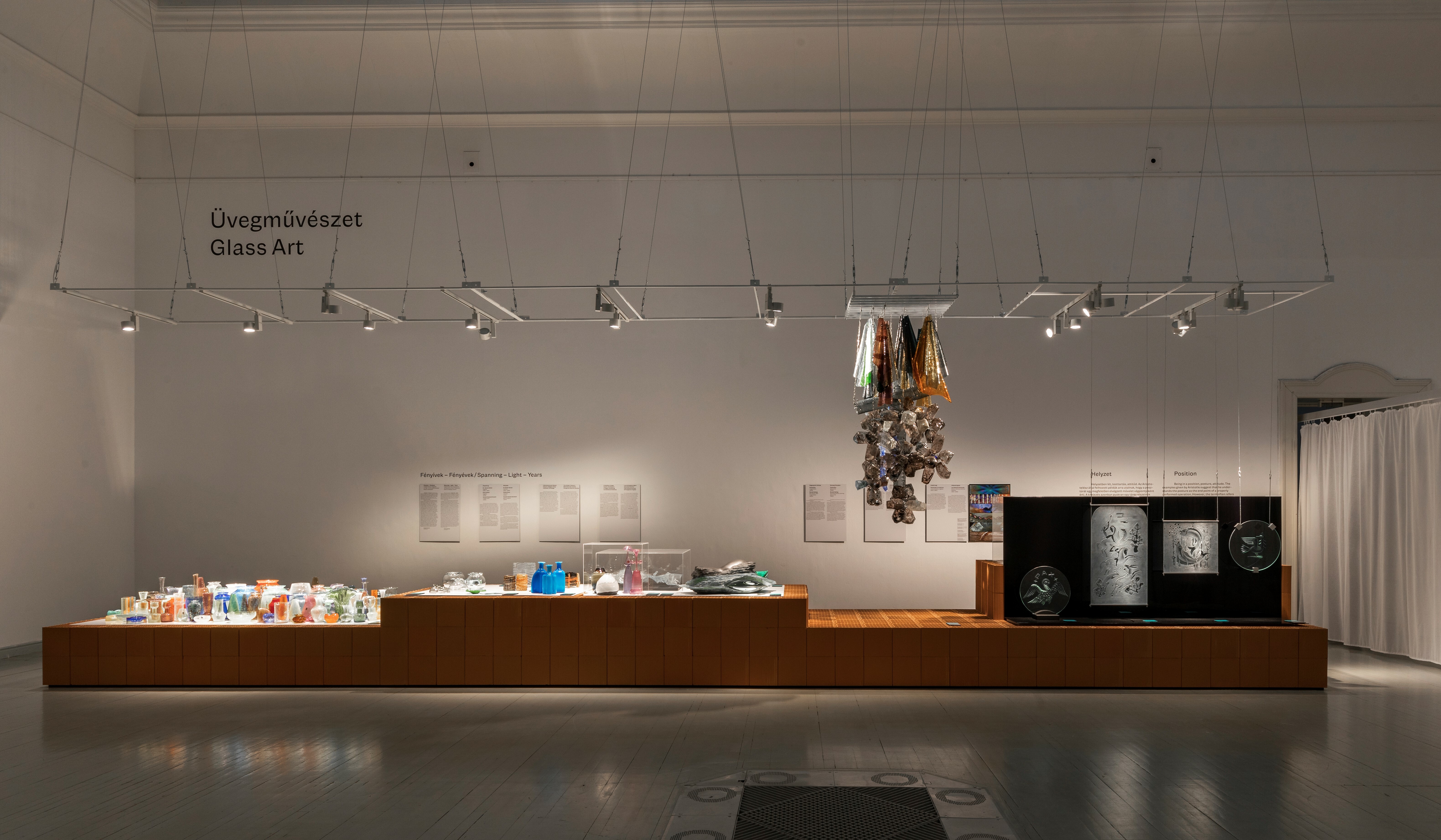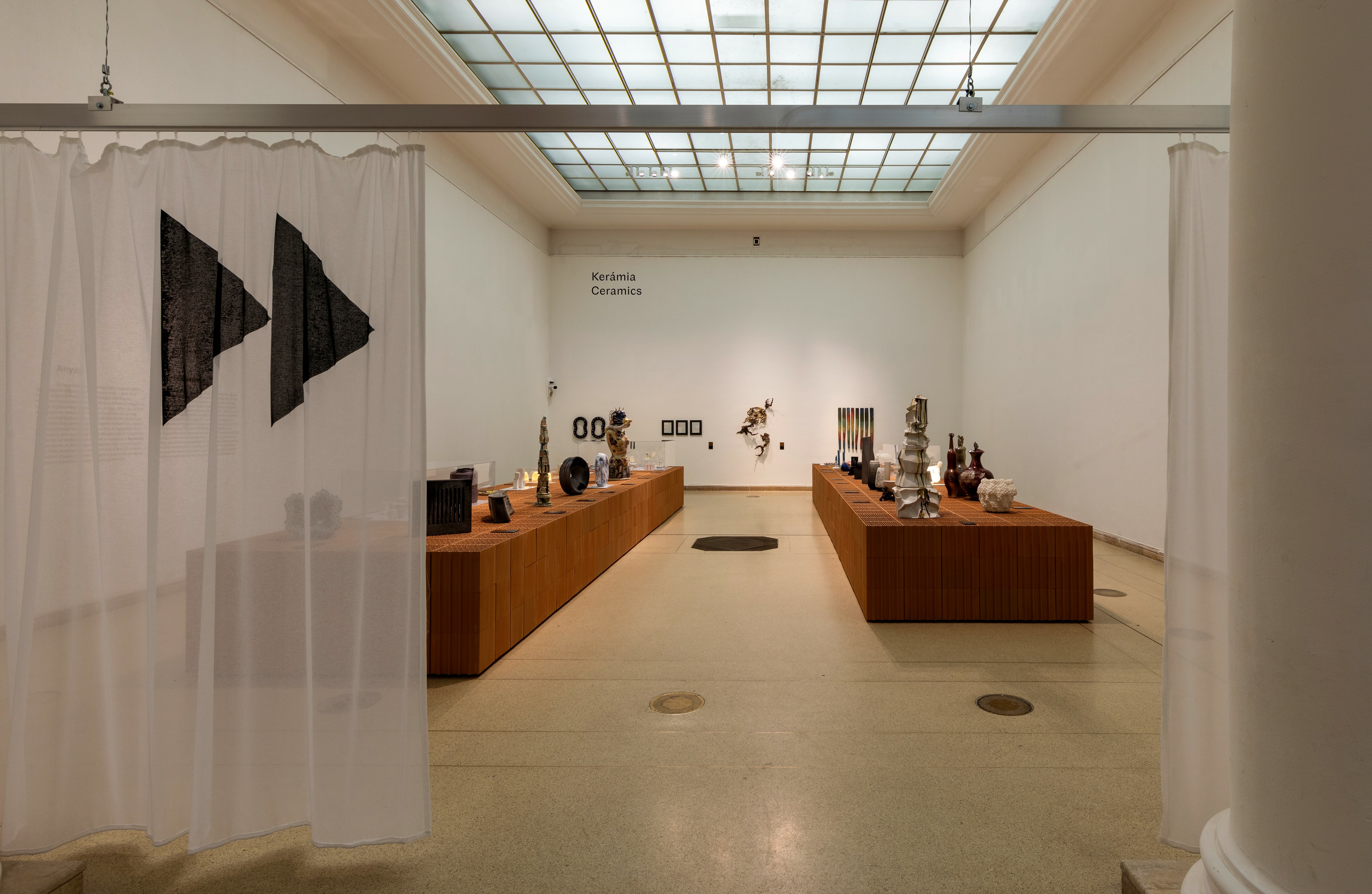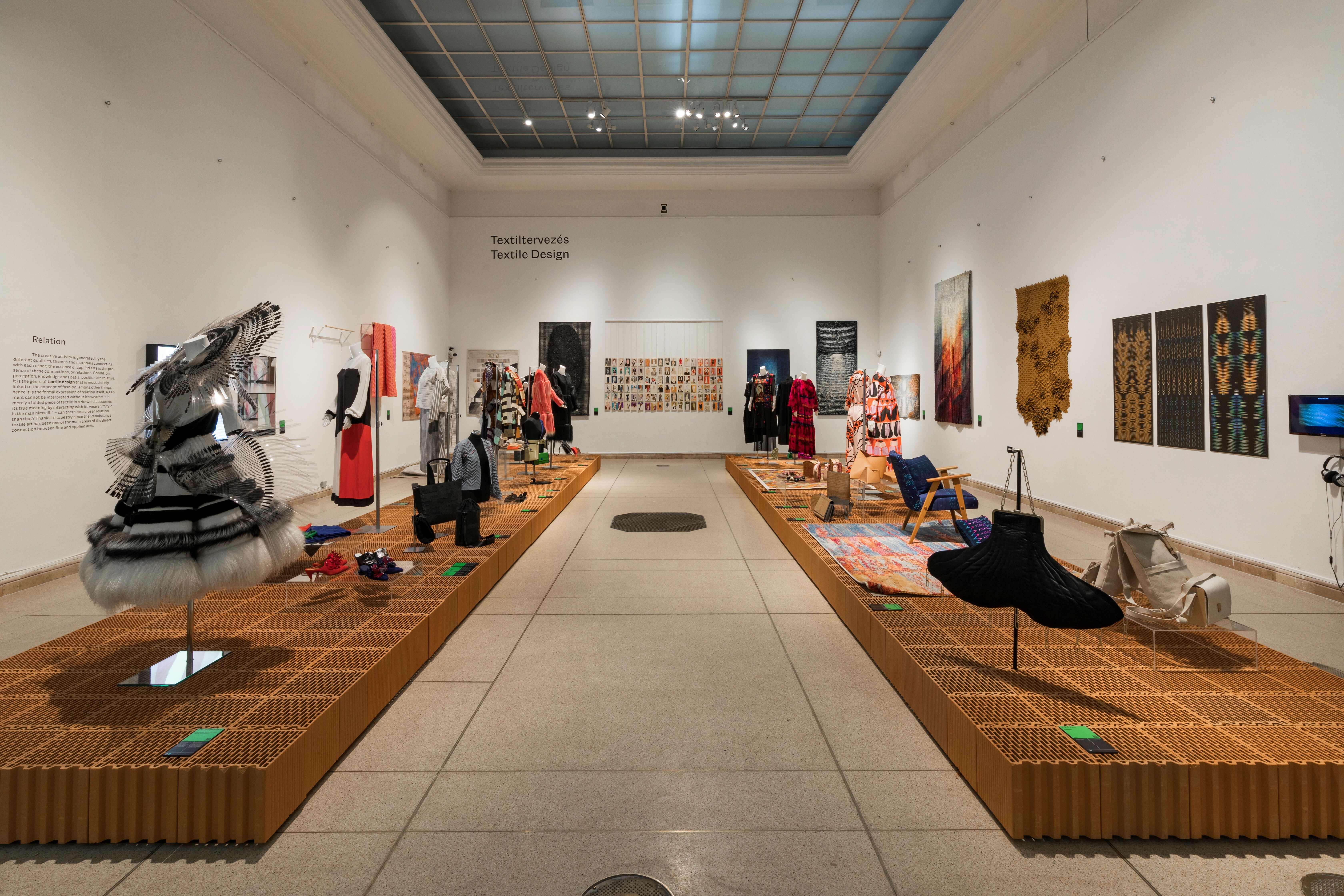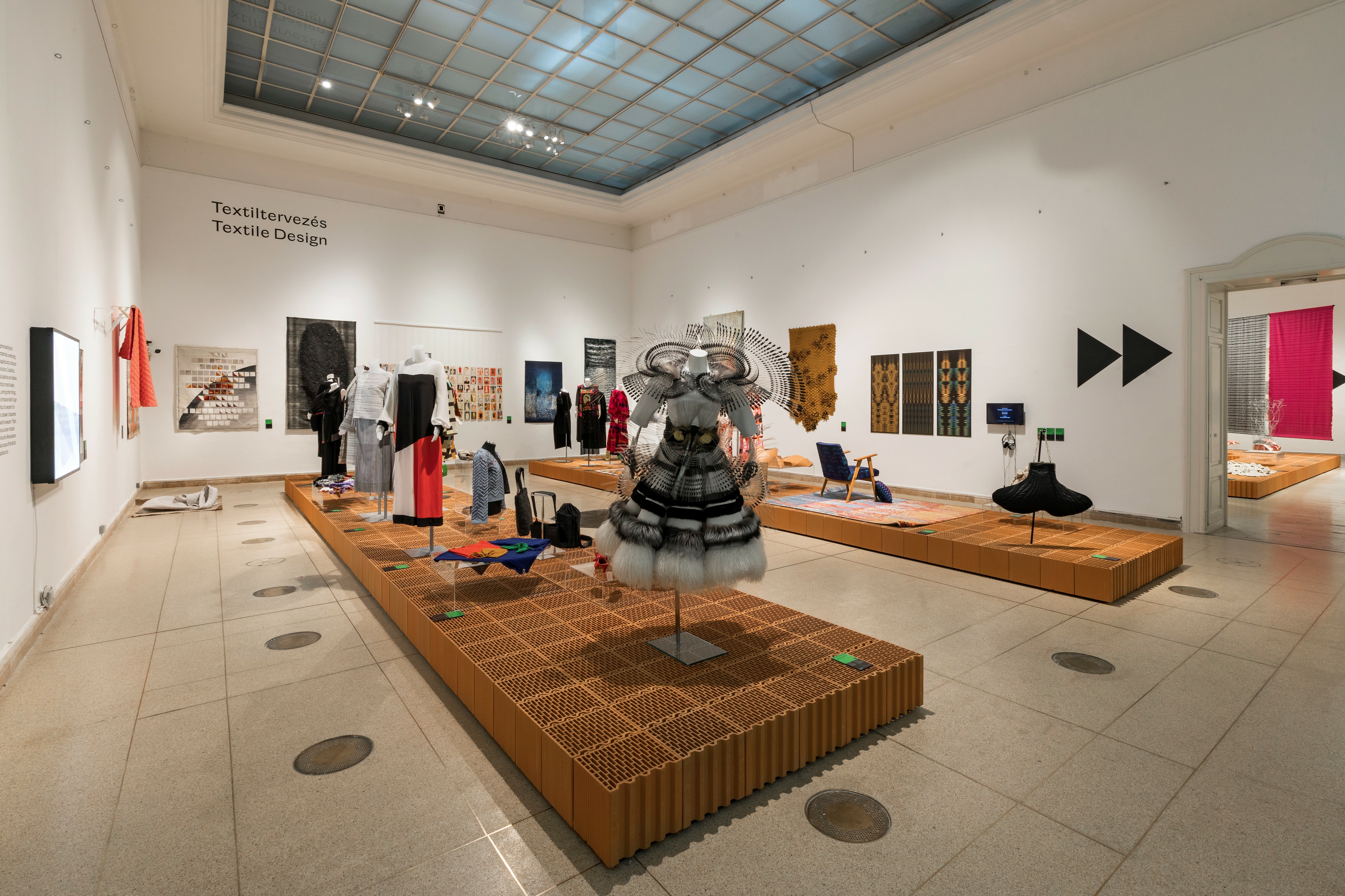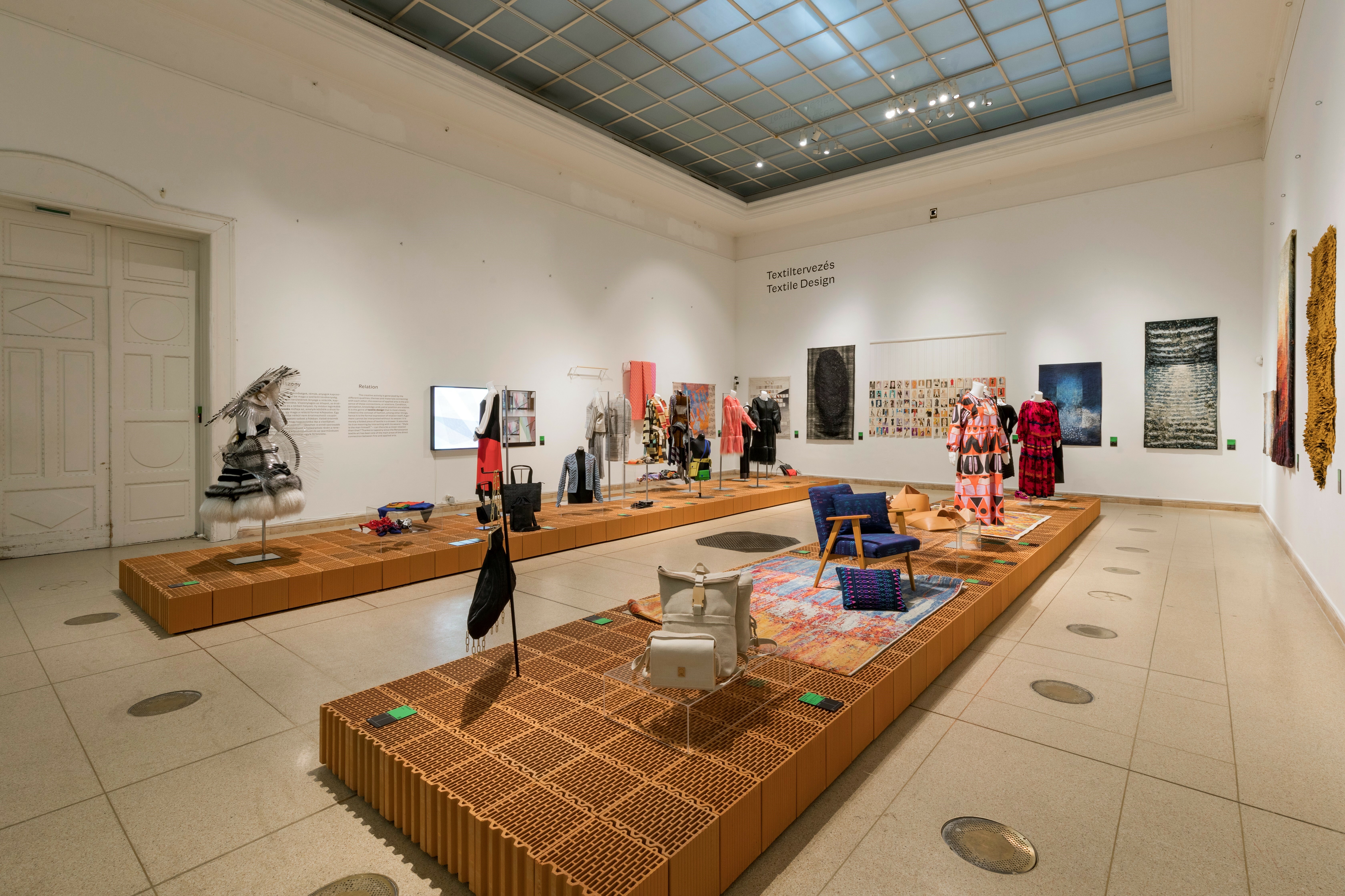 „A használt anyagokkal a kiállítás tematikájának kézművességre utaló jellegét is ki szerettük volna fejezni, ezért döntöttünk az égetett kerámia posztamensek és a térbe belógatott, azokat osztó függönyök mellett. A szalonon kiállításra kerülő műtárgyak sokszínűsége miatt alapvetés volt egy neutrális posztamensrendszer megtervezése, mely egyszerre képes összefogóan kezelni az összes különböző műtárgyat. Így került kiválasztásra a nagyméretű üreges vázkerámia falazóblokk, amelyből vágás, faragás nélkül készült el az összes posztamens” – mondta el Szabó Levente, tervező.