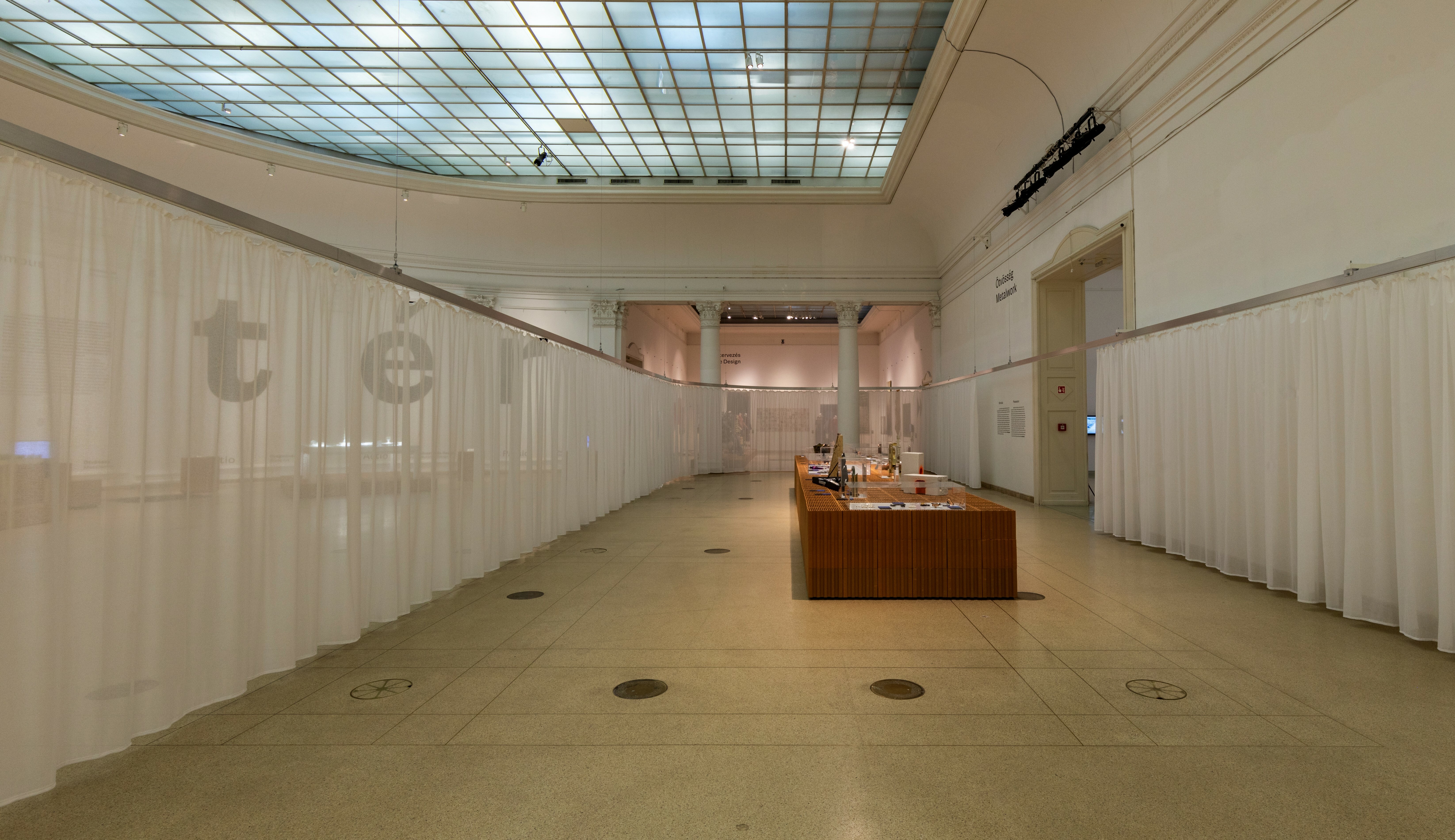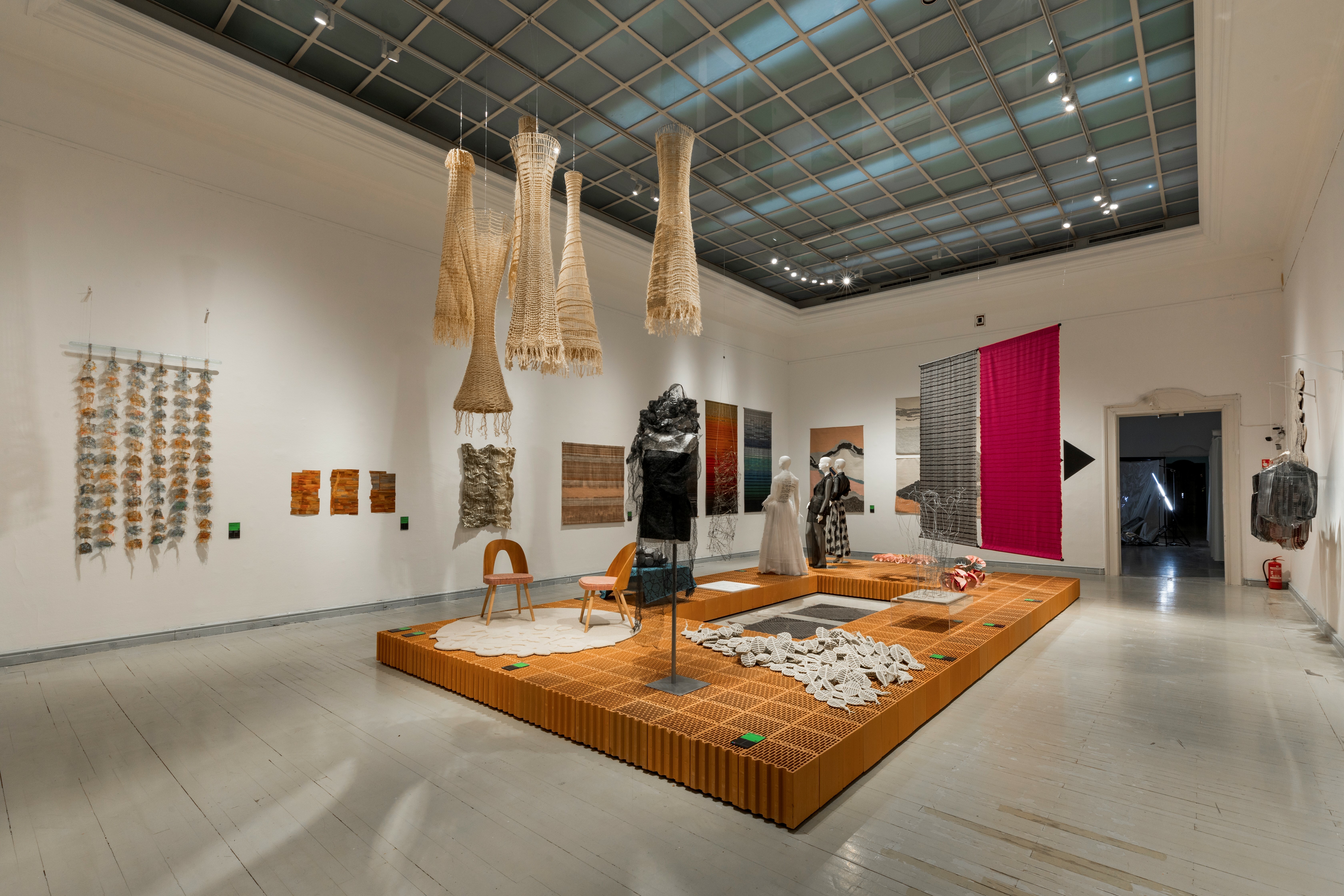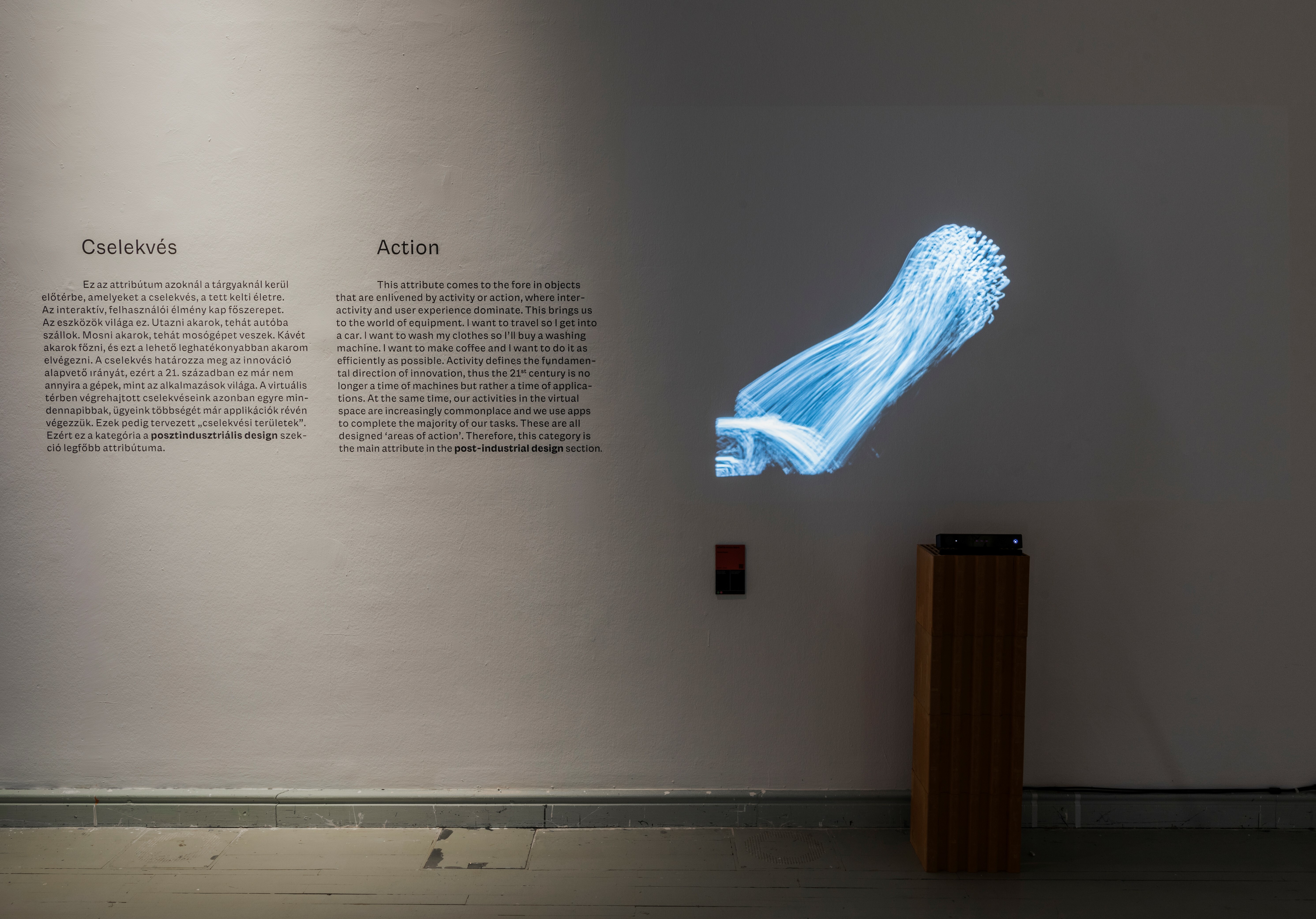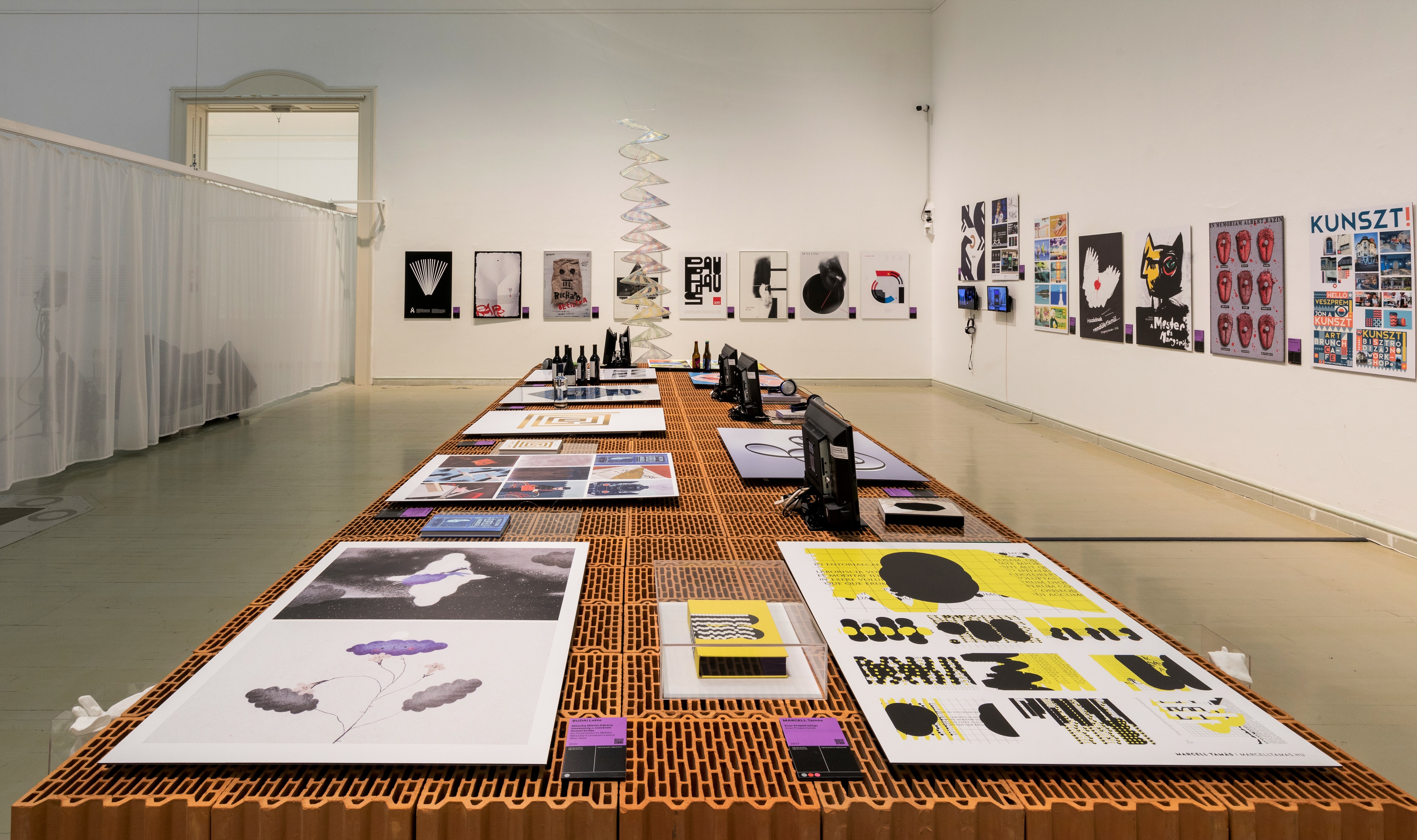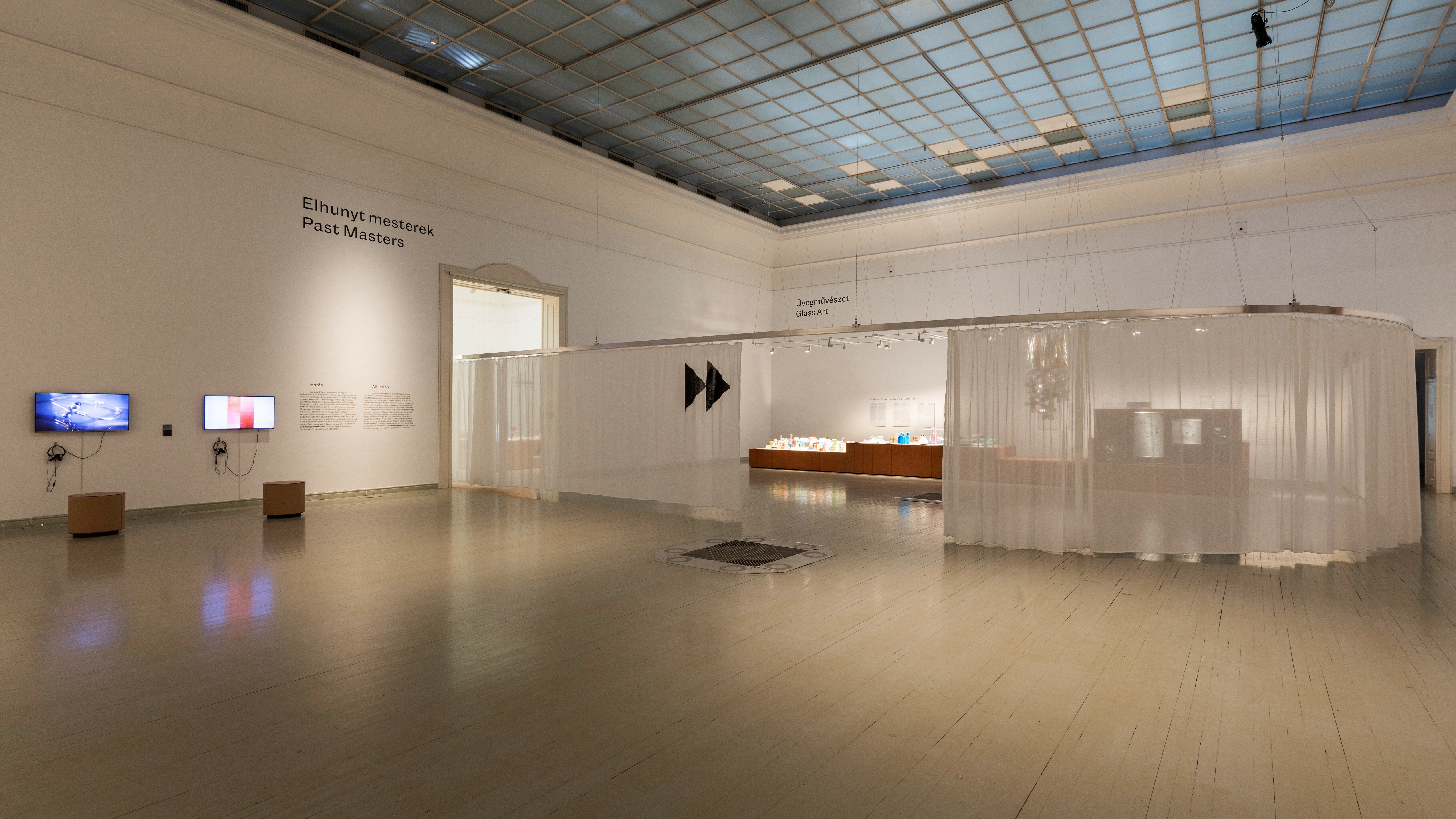 „A használt anyagokkal a kiállítás tematikájának kézművességre utaló jellegét is ki szerettük volna fejezni, ezért döntöttünk az égetett kerámia posztamensek és a térbe belógatott, azokat osztó függönyök mellett. A szalonon kiállításra kerülő műtárgyak sokszínűsége miatt alapvetés volt egy neutrális posztamensrendszer megtervezése, mely egyszerre képes összefogóan kezelni az összes különböző műtárgyat. Így került kiválasztásra a nagyméretű üreges vázkerámia falazóblokk, amelyből vágás, faragás nélkül készült el az összes posztamens” – mondta el Szabó Levente, tervező.
