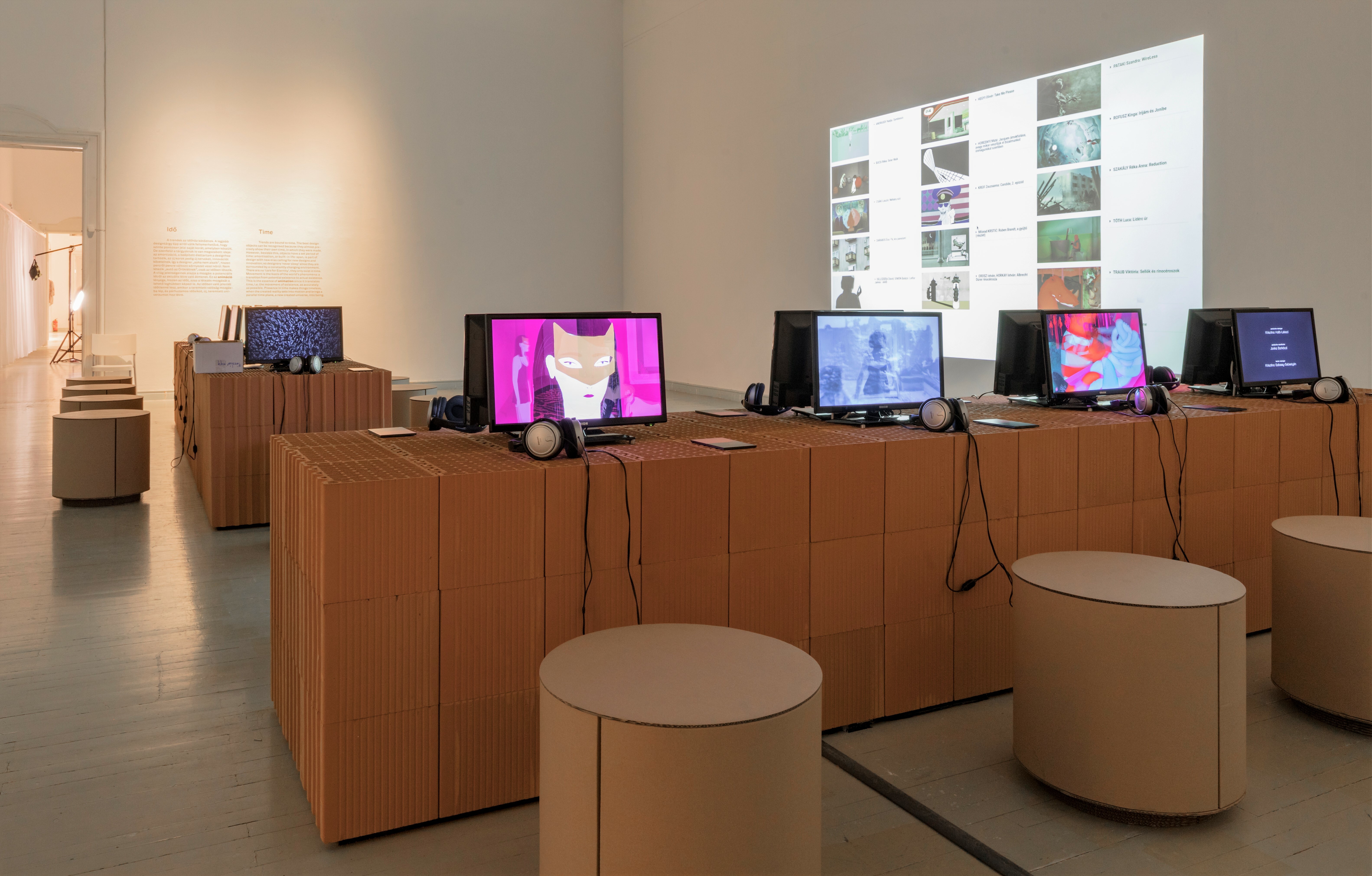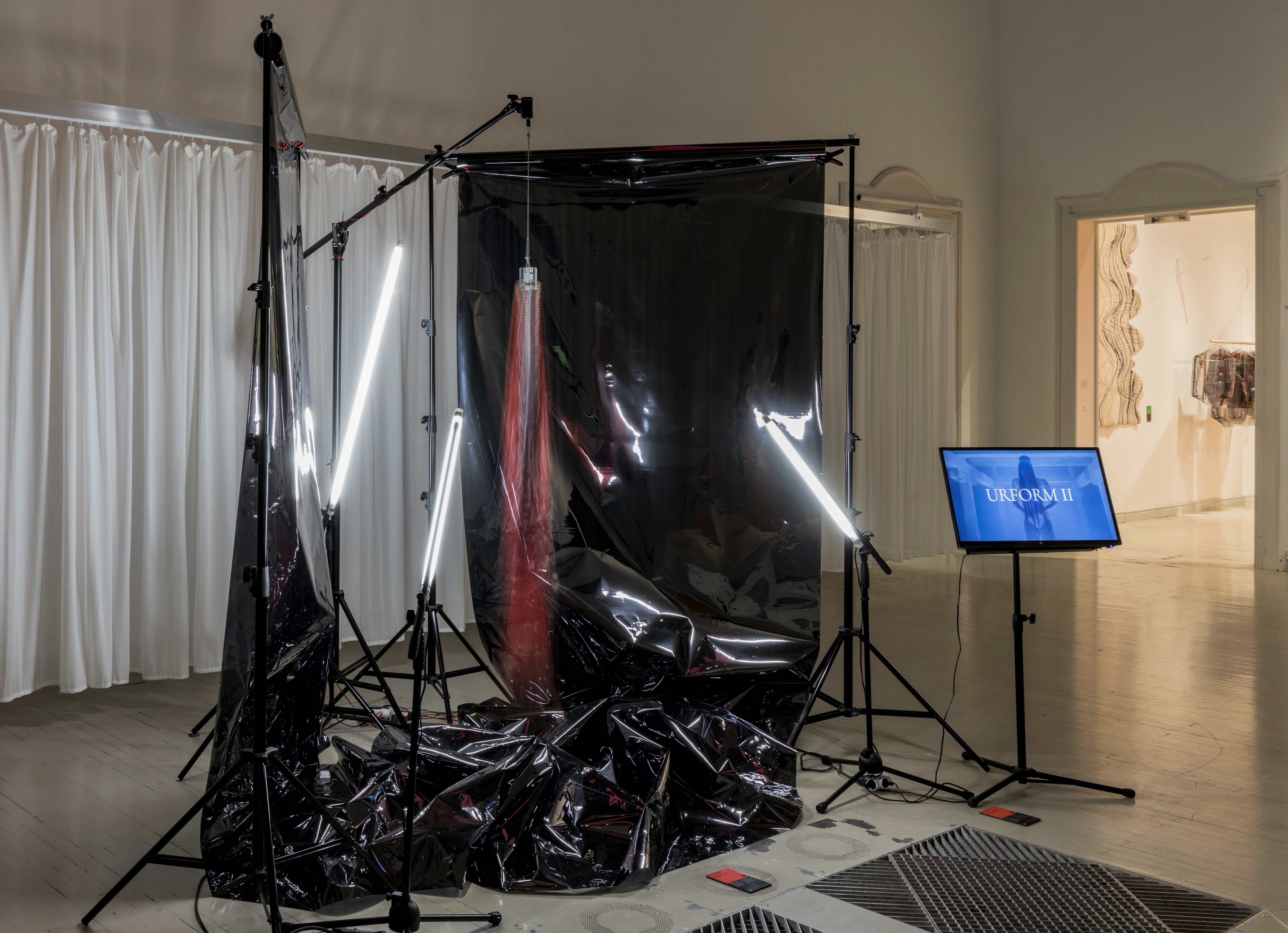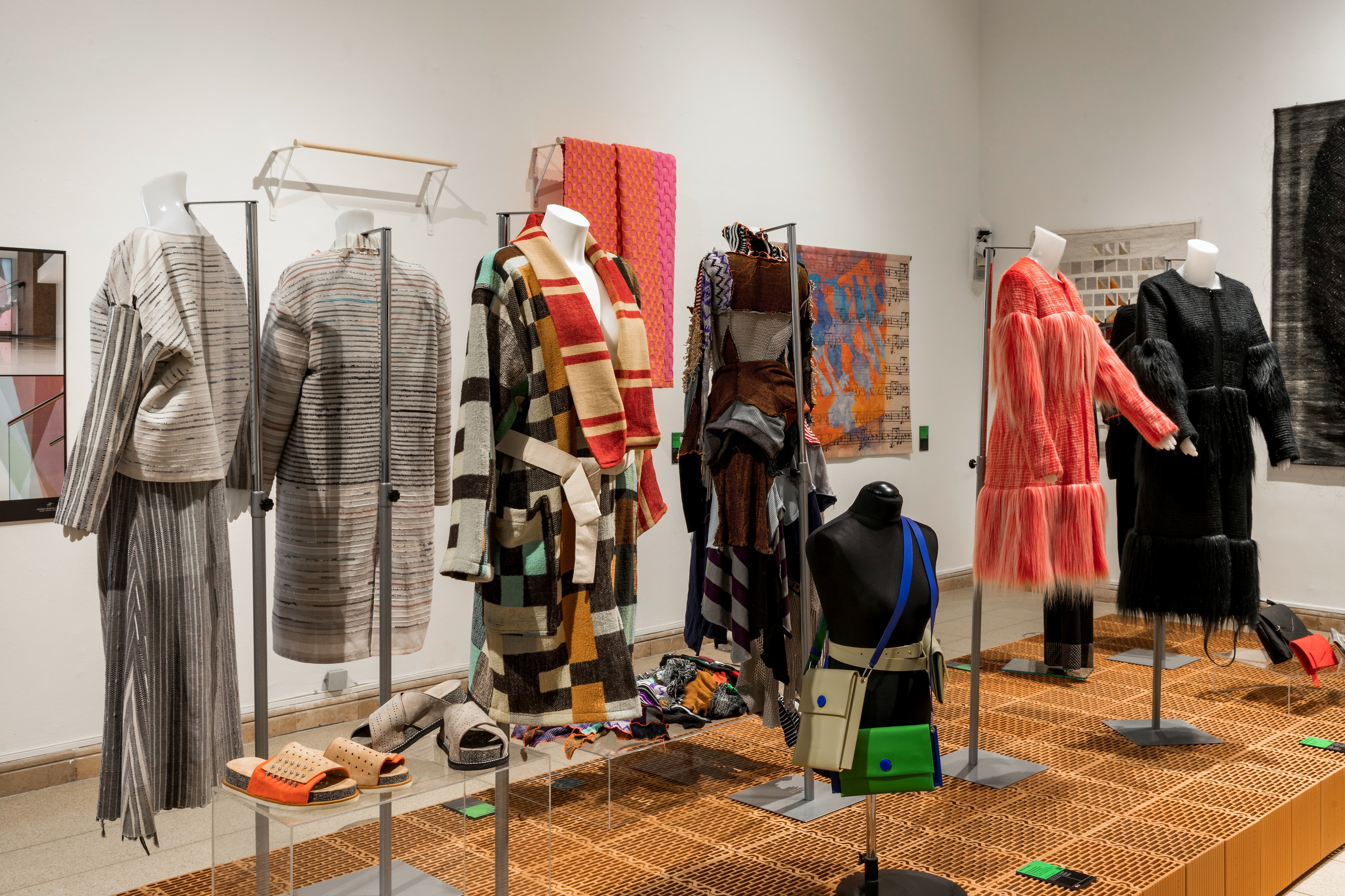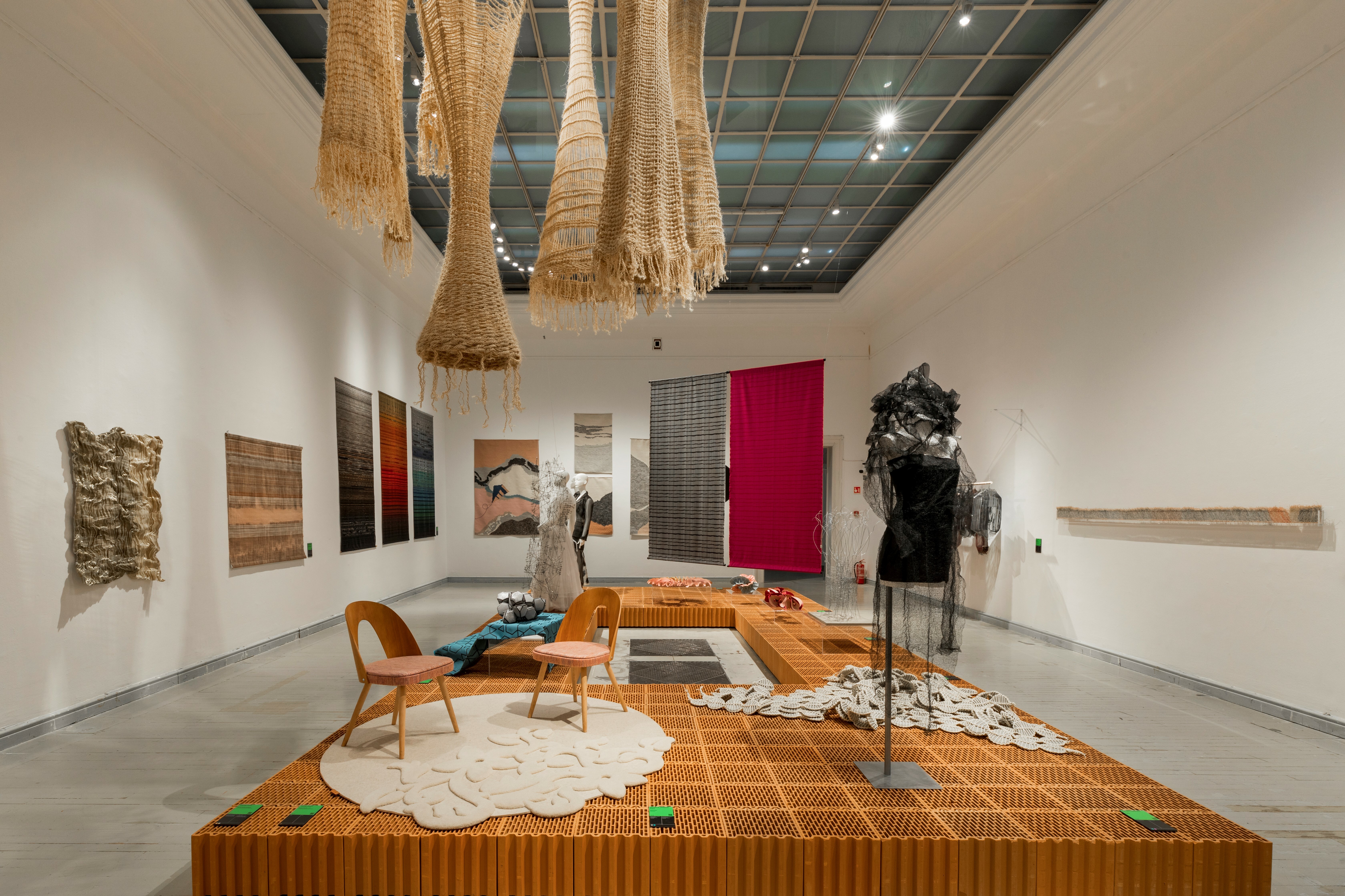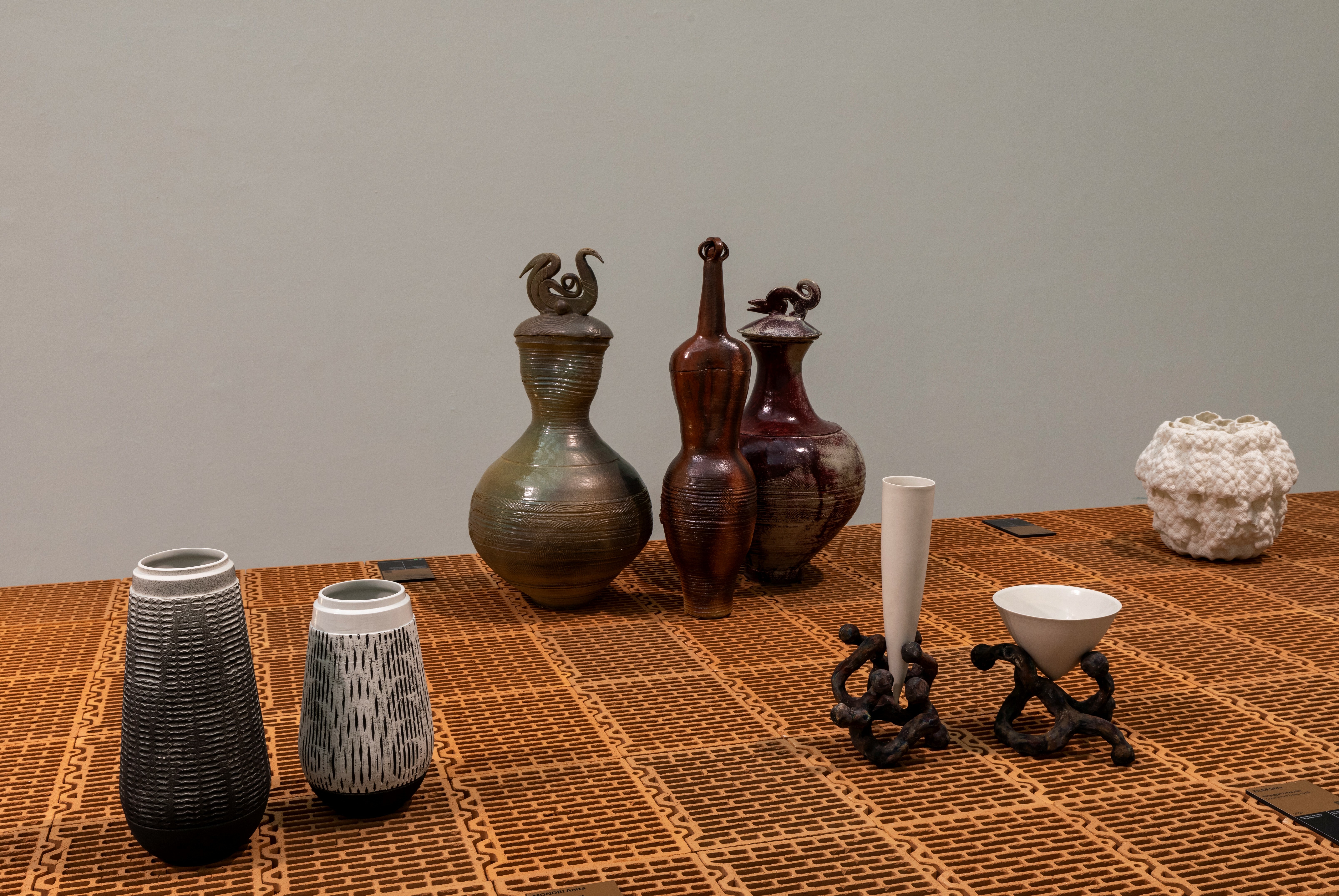 „A használt anyagokkal a kiállítás tematikájának kézművességre utaló jellegét is ki szerettük volna fejezni, ezért döntöttünk az égetett kerámia posztamensek és a térbe belógatott, azokat osztó függönyök mellett. A szalonon kiállításra kerülő műtárgyak sokszínűsége miatt alapvetés volt egy neutrális posztamensrendszer megtervezése, mely egyszerre képes összefogóan kezelni az összes különböző műtárgyat. Így került kiválasztásra a nagyméretű üreges vázkerámia falazóblokk, amelyből vágás, faragás nélkül készült el az összes posztamens” – mondta el Szabó Levente, tervező.