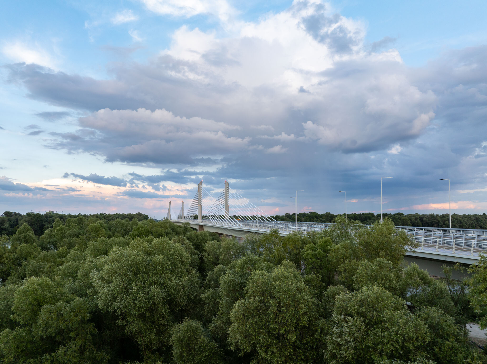 Az Építési és Közlekedési Minisztérium csütörtökön lezárult beruházásában egy 946,2 méter hosszúságú, 10 támaszú építmény jött létre, amelynek kivitelezése 2021 júniusában rajtolt el. Lapunk folyamatosan követte a projektet, így azt is megírtuk, amikor 2021 októberében bekerült a mederbe az első kéregelem, majd azt is, amikor egy évre rá elkezdődött a híd szabadszerelése. Arra is külön cikket szántunk, hogy bemutassuk, hogyan használták a PERI egyedi tervezésű zsaluzókocsijait a feszített-függesztett mederhíd szabad szereléses módszerrel lezajlott építkezéséhez.