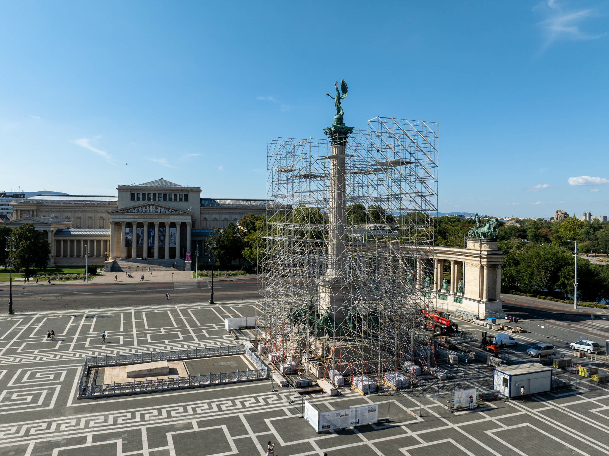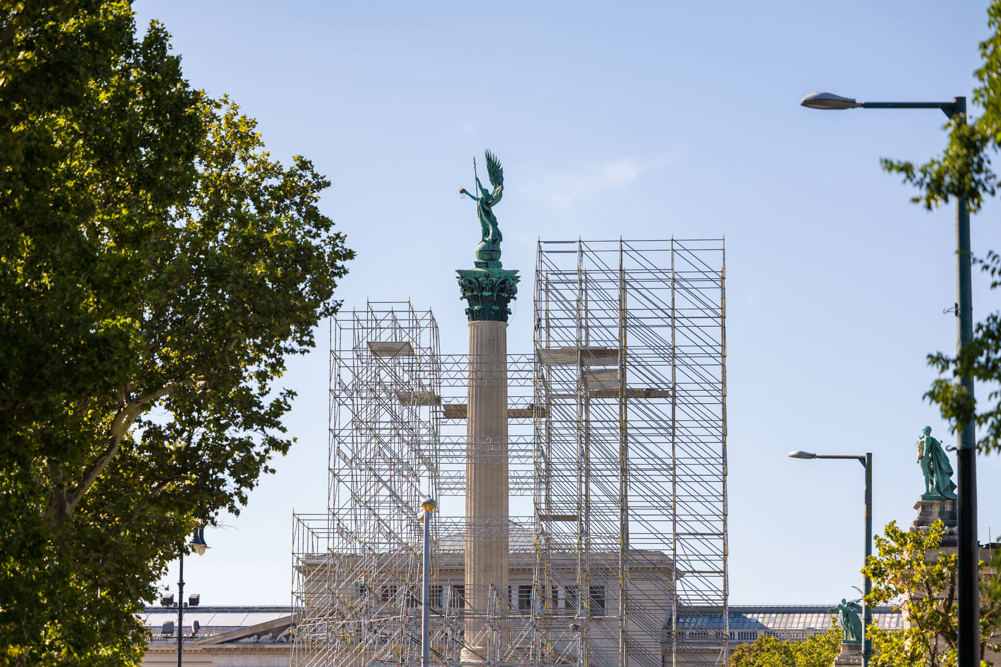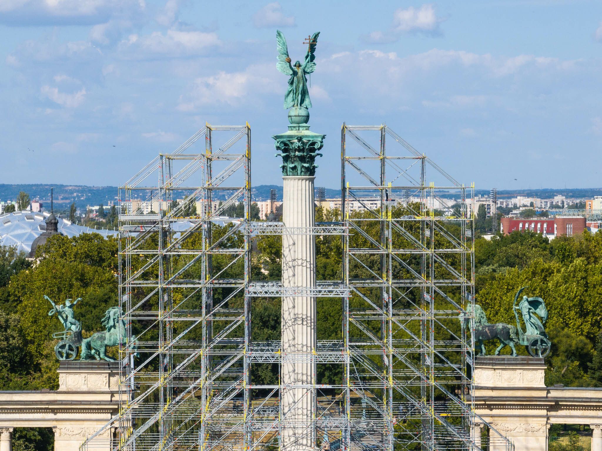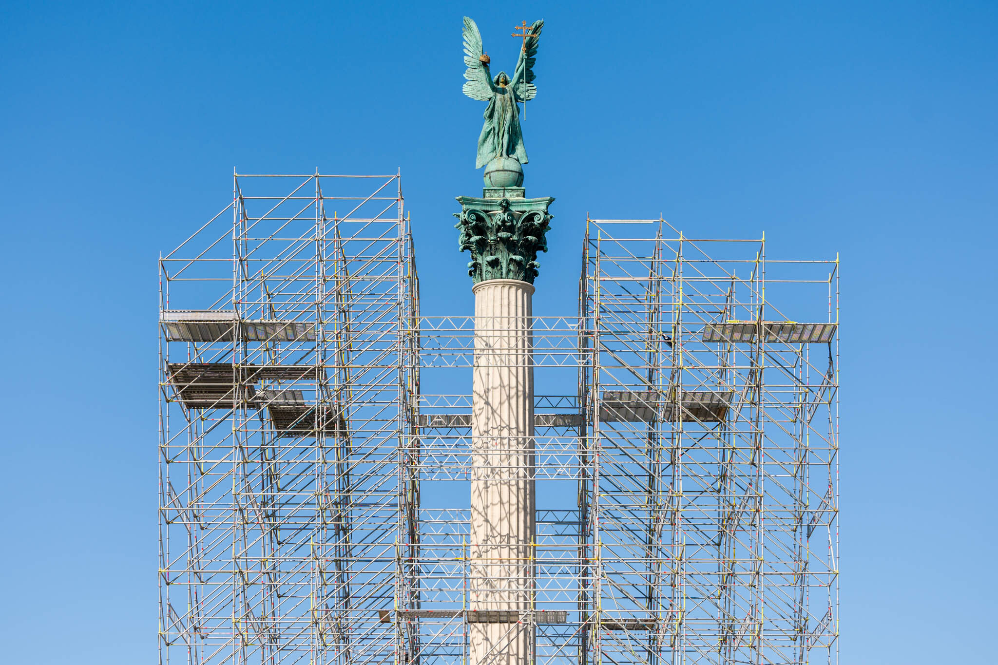 A Hősök terének monumentális központi figuráját először veszik le 36 méter magas díszoszlopáról, amelyhez Layher állványzatot vontak Gábriel köré.