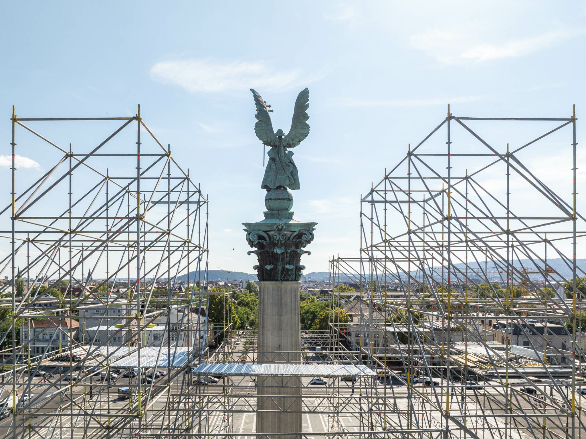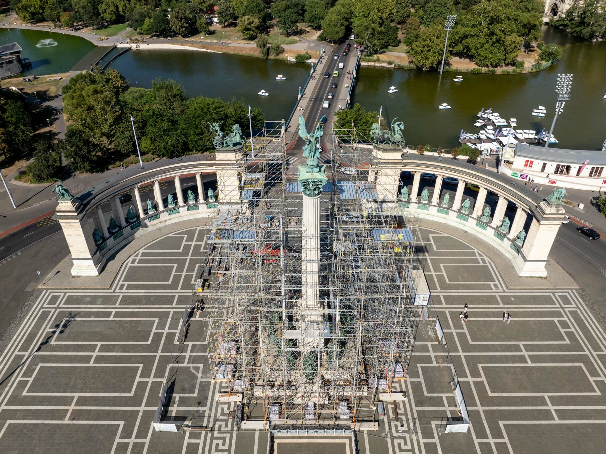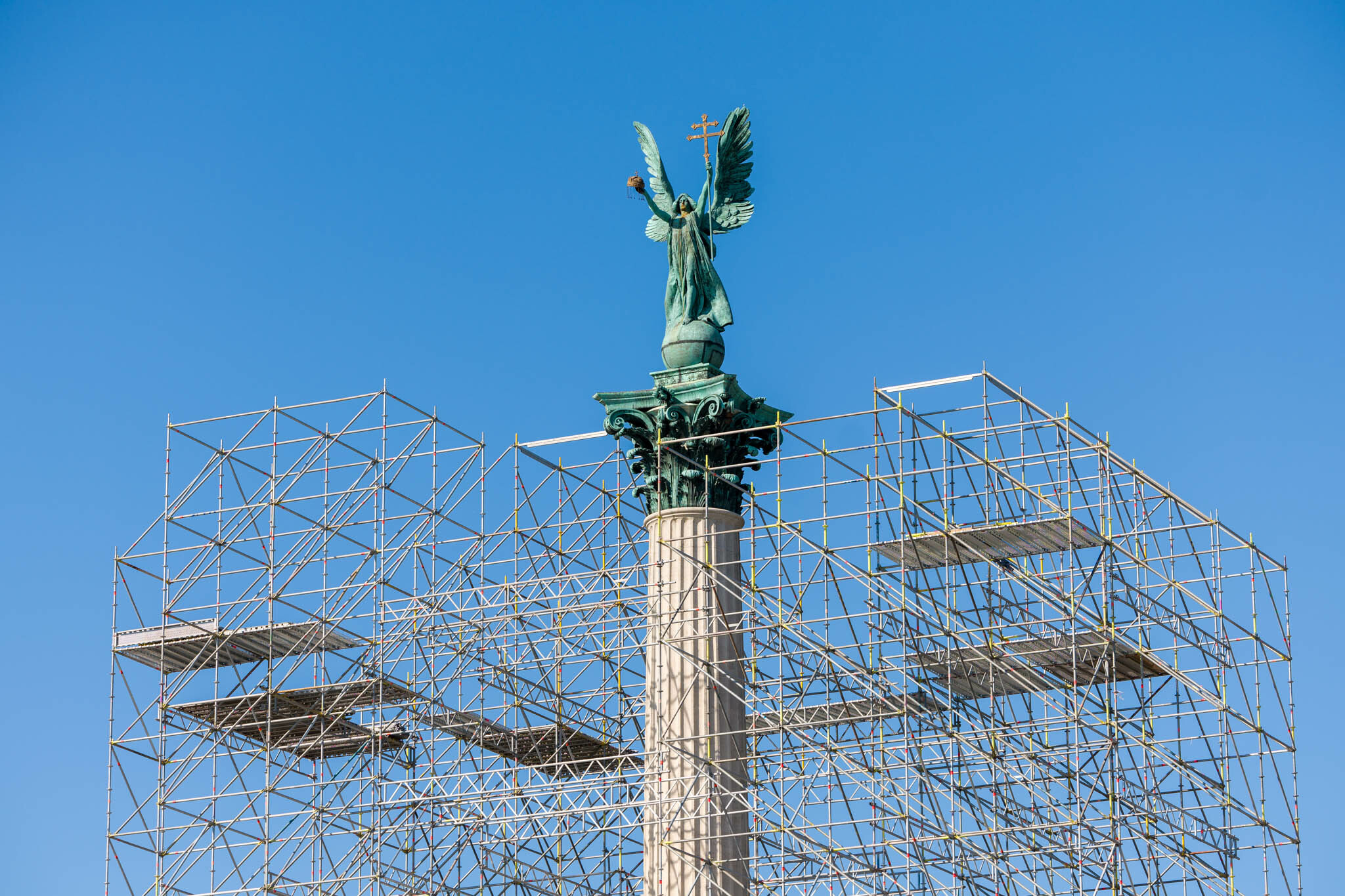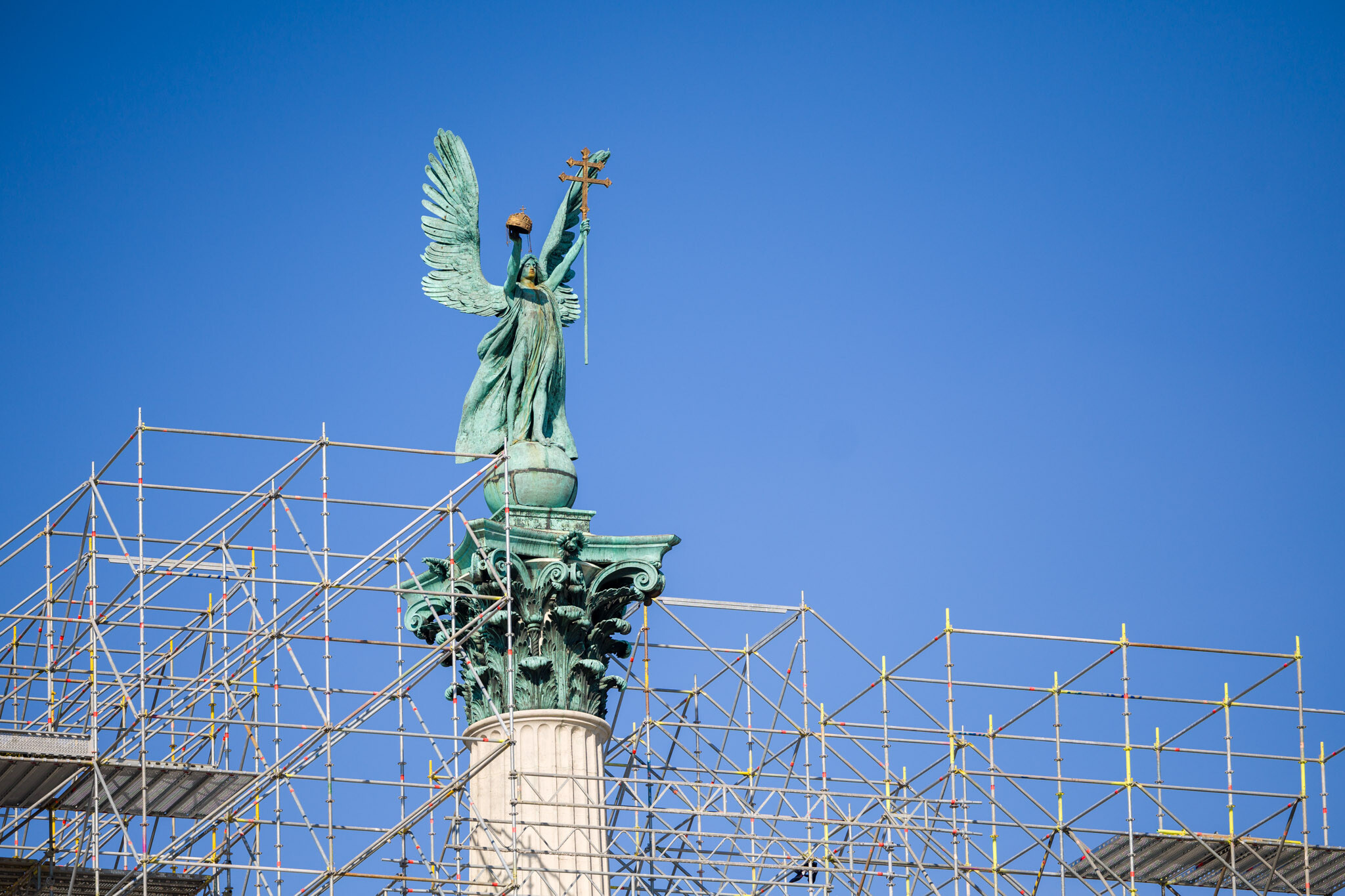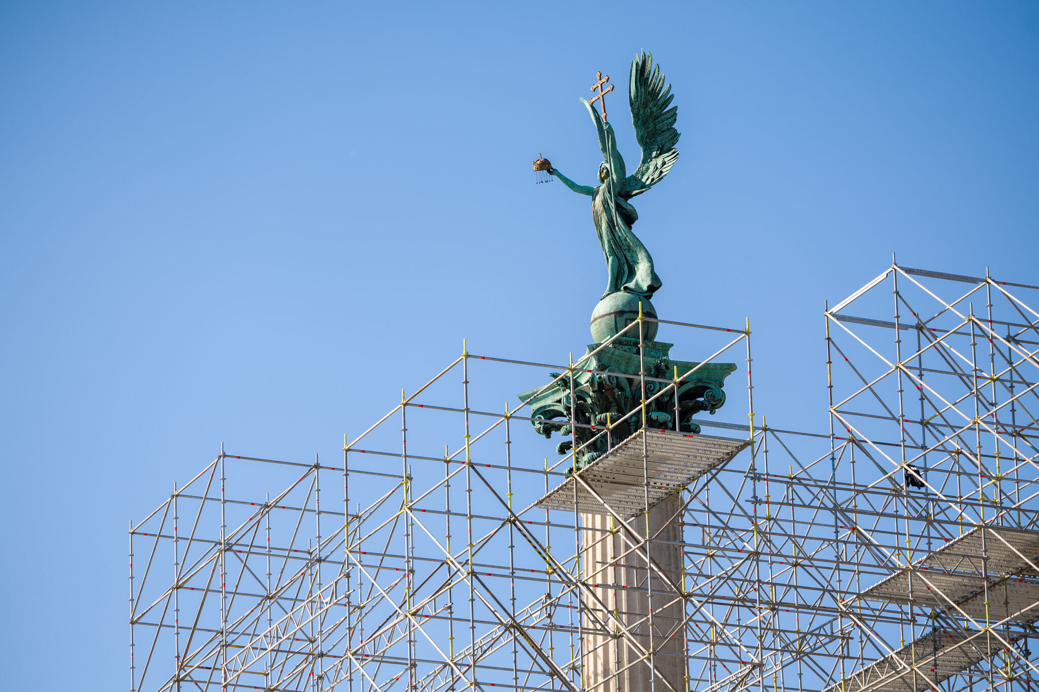A Hősök terének monumentális központi figuráját először veszik le 36 méter magas díszoszlopáról, amelyhez Layher állványzatot vontak Gábriel köré.
