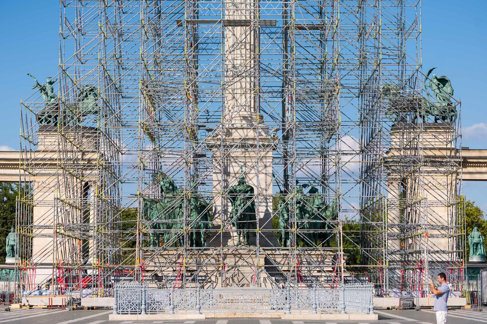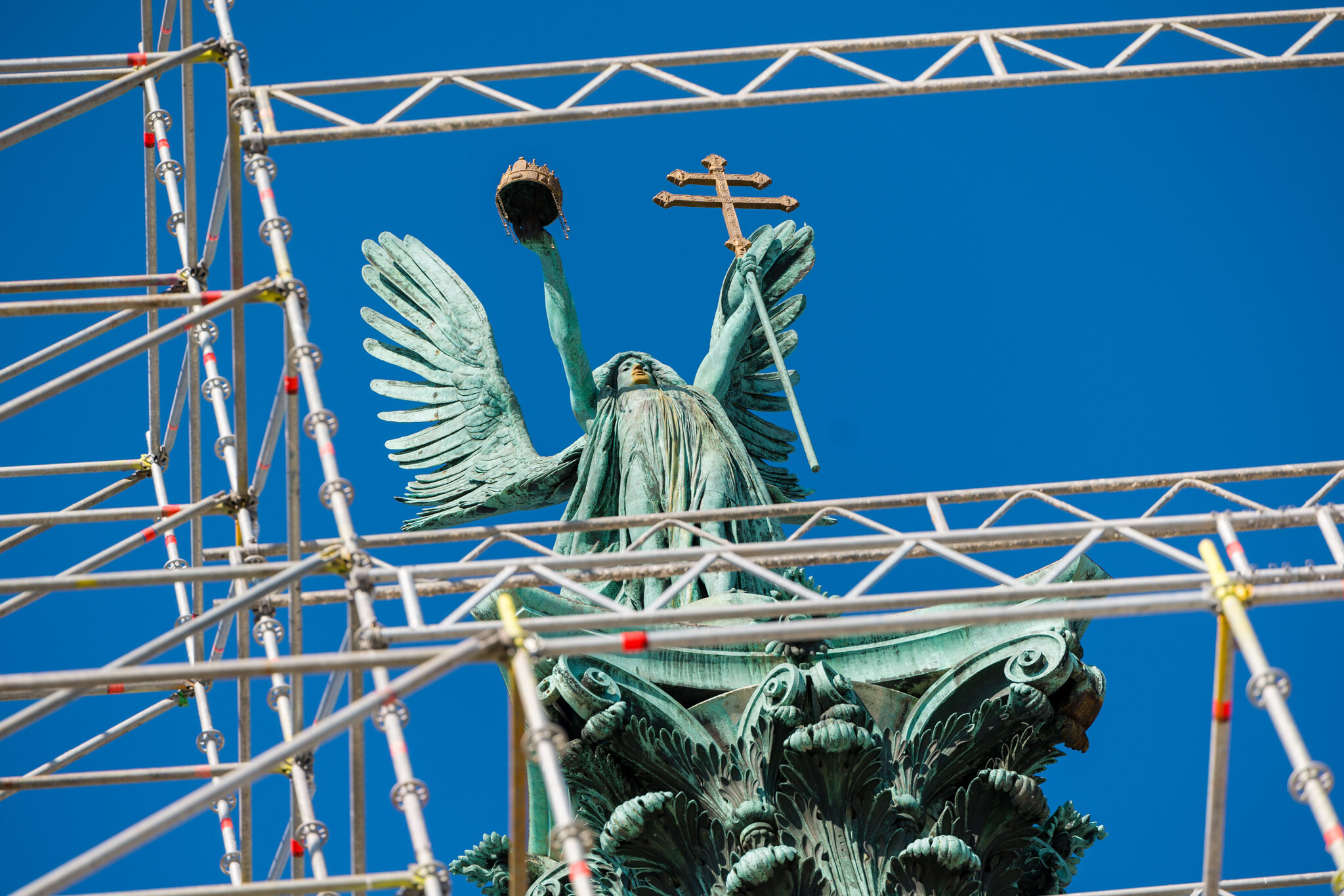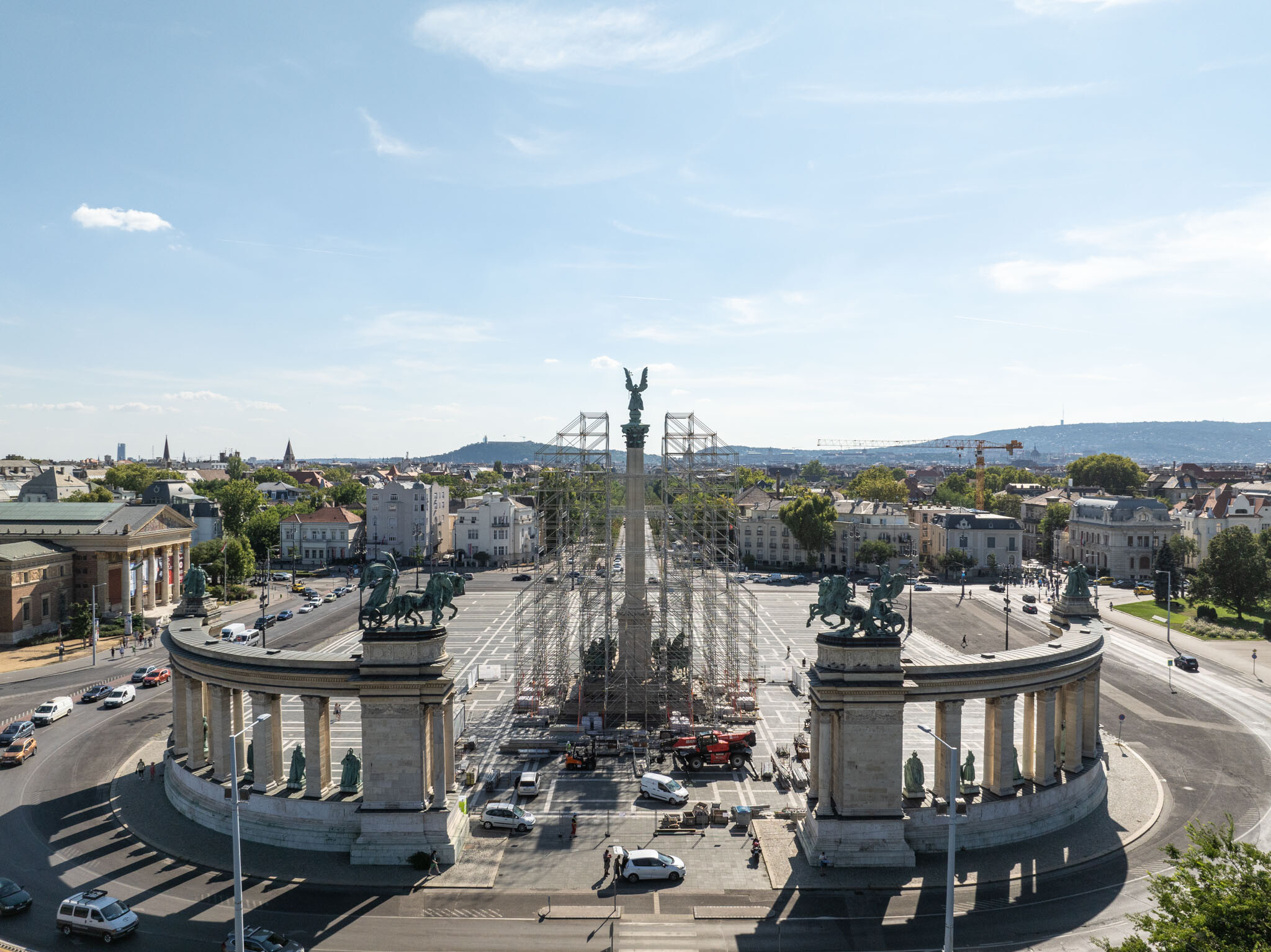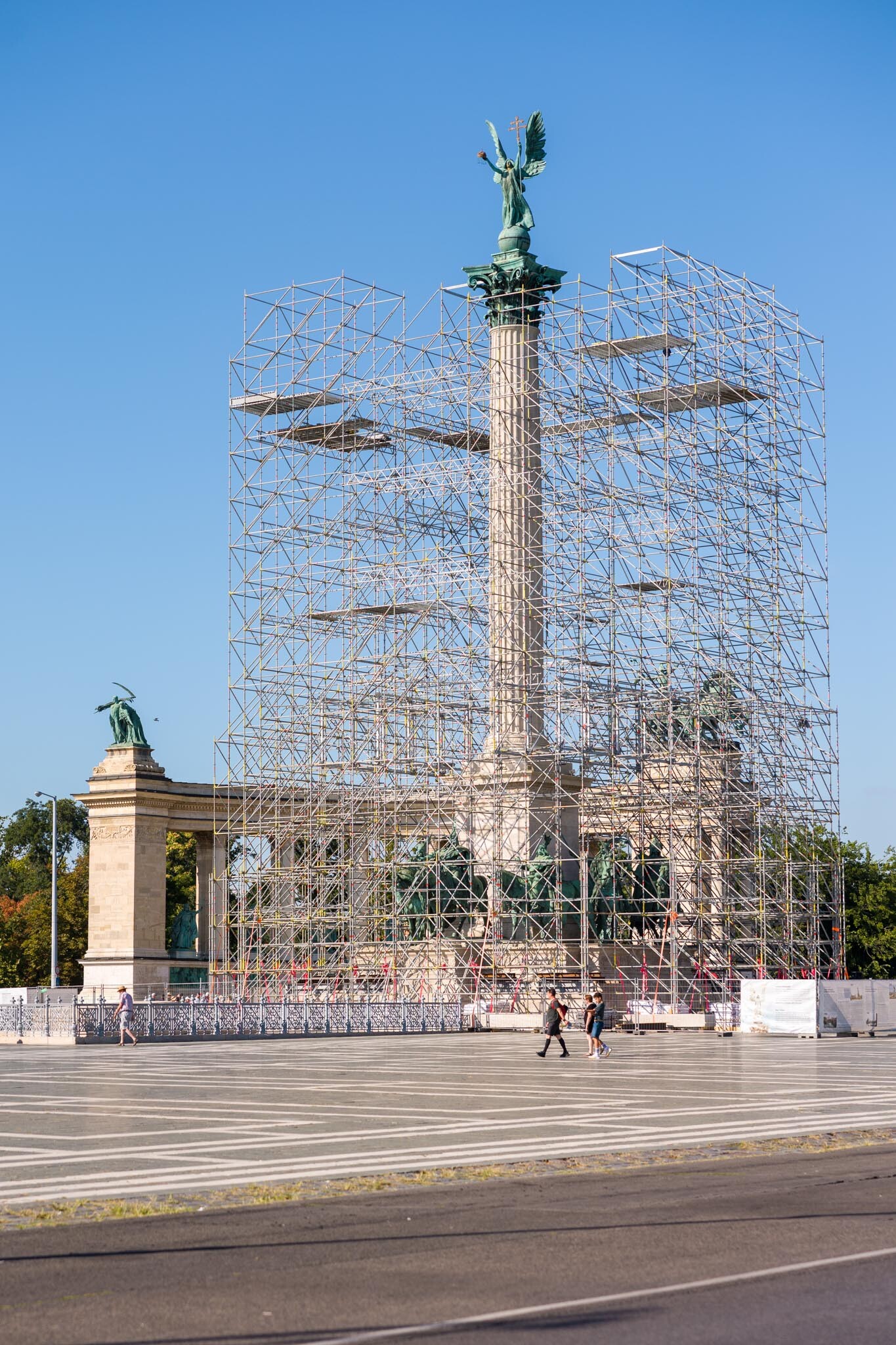 A Hősök terének monumentális központi figuráját először veszik le 36 méter magas díszoszlopáról, amelyhez Layher állványzatot vontak Gábriel köré.