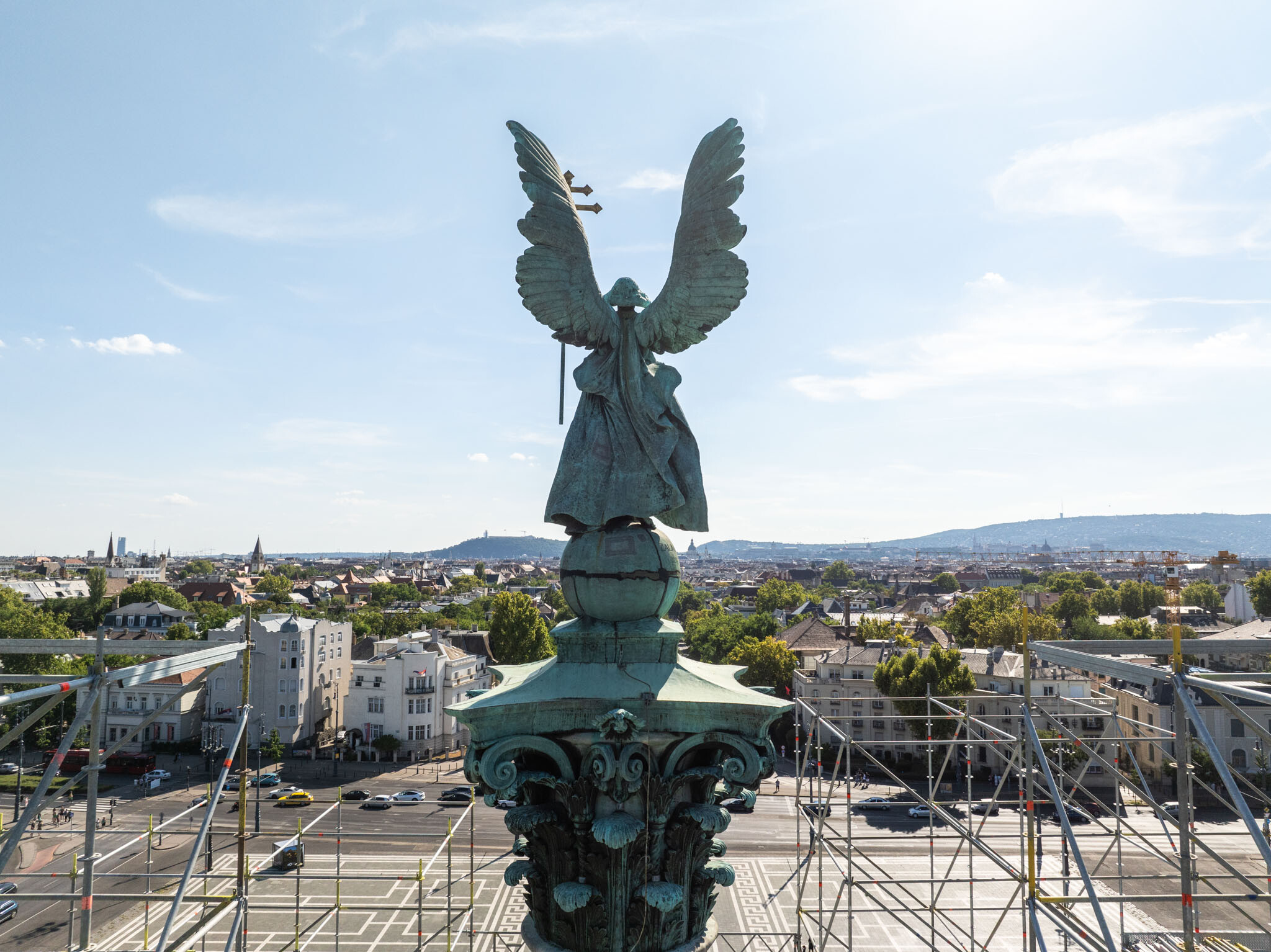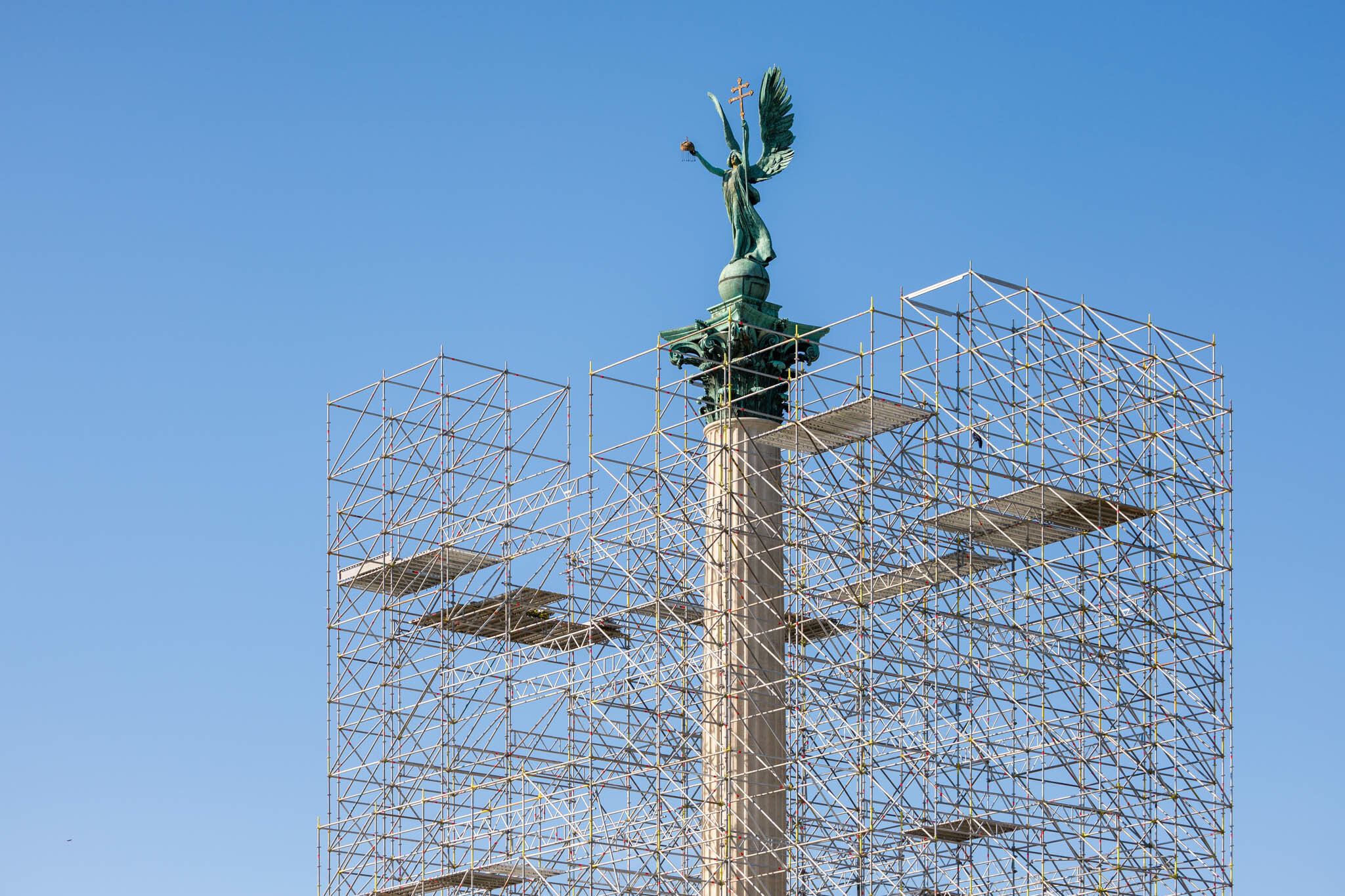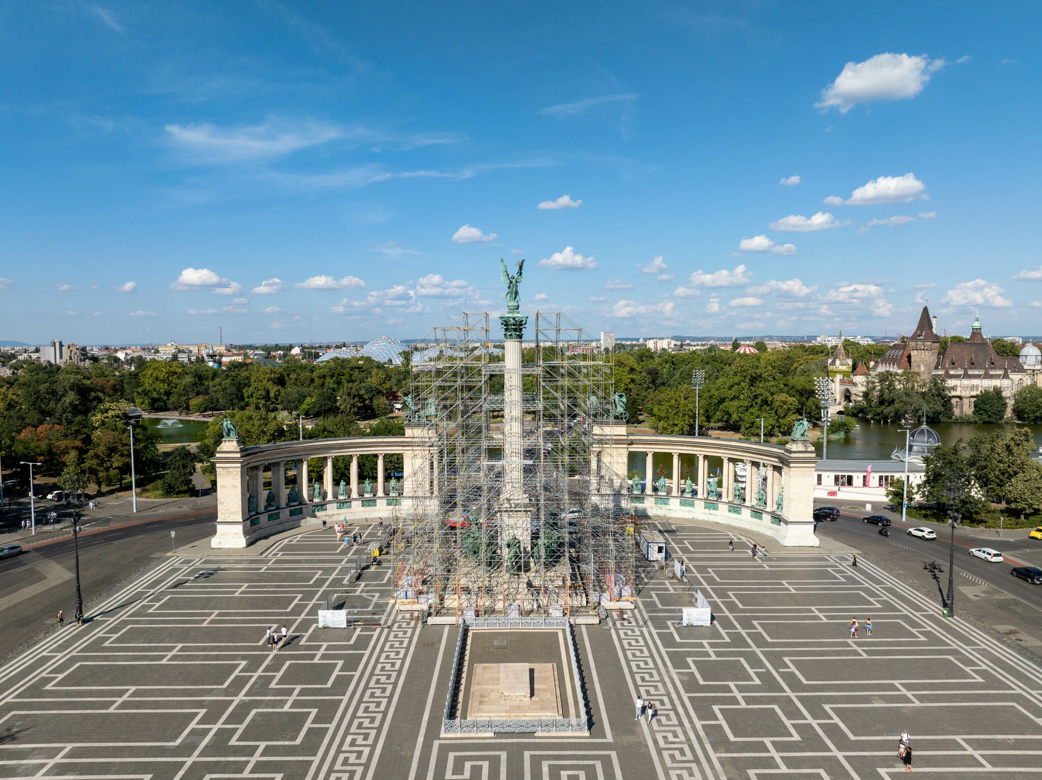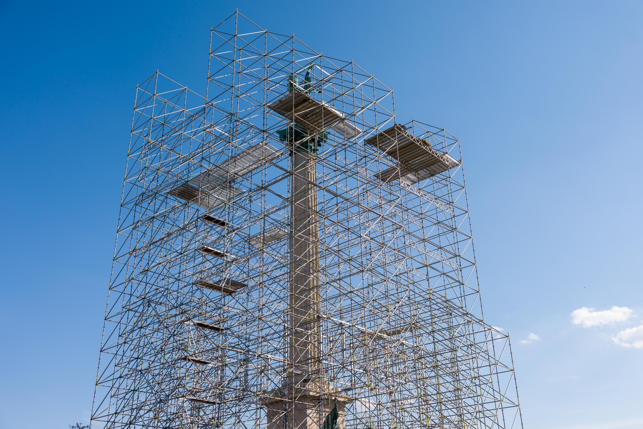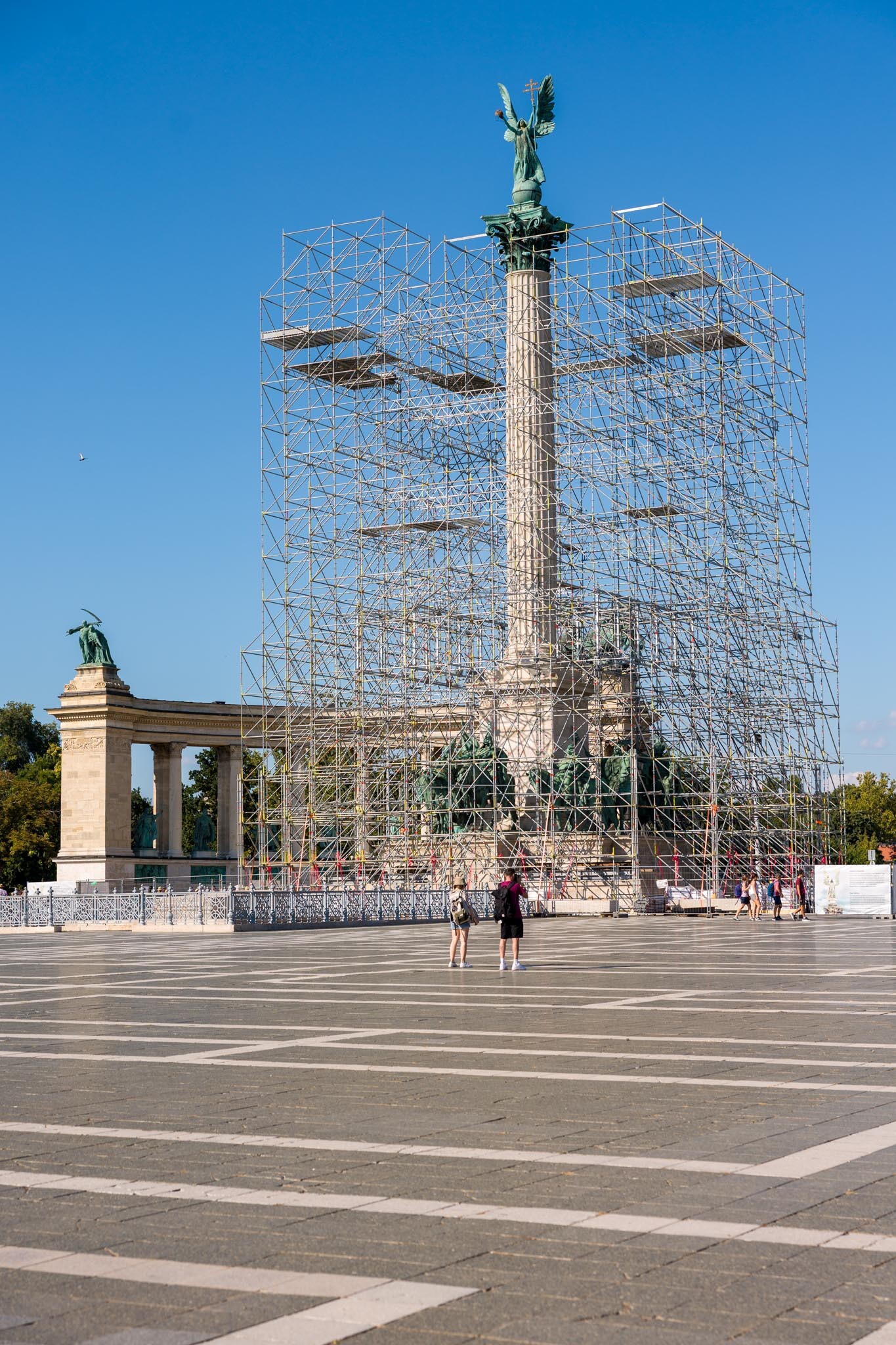 A Hősök terének monumentális központi figuráját először veszik le 36 méter magas díszoszlopáról, amelyhez Layher állványzatot vontak Gábriel köré.