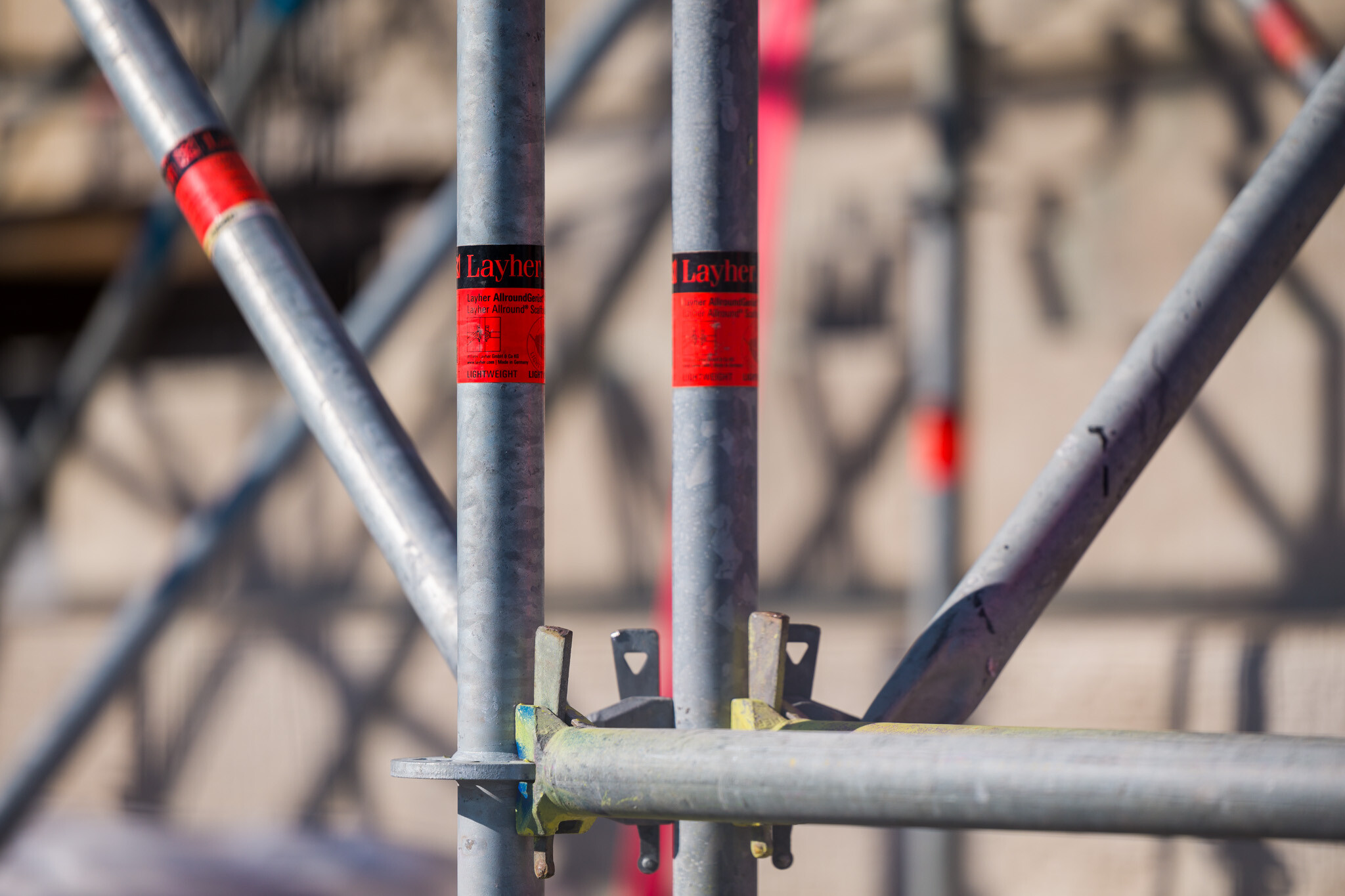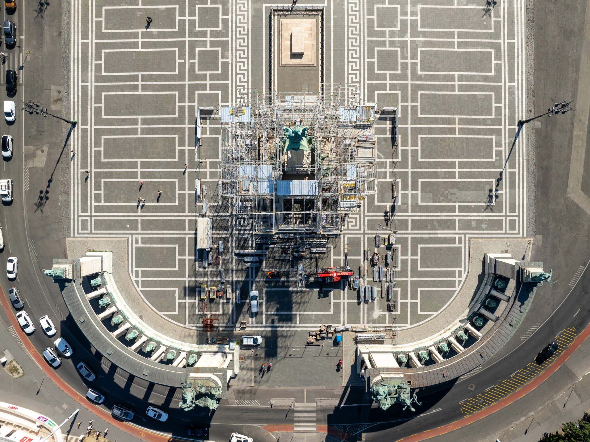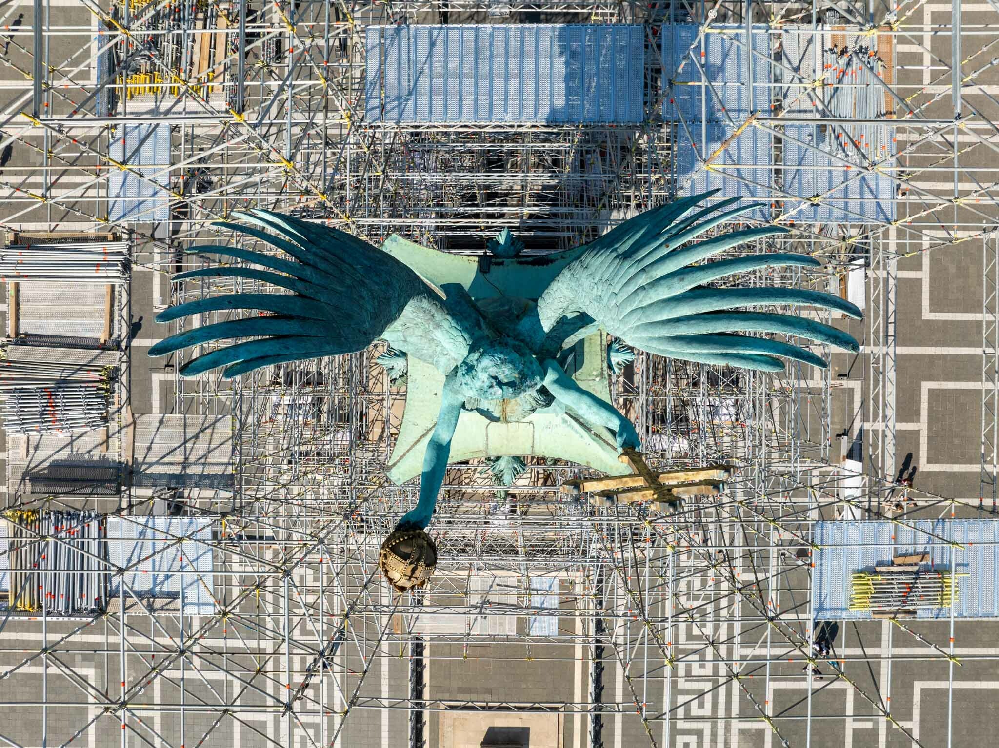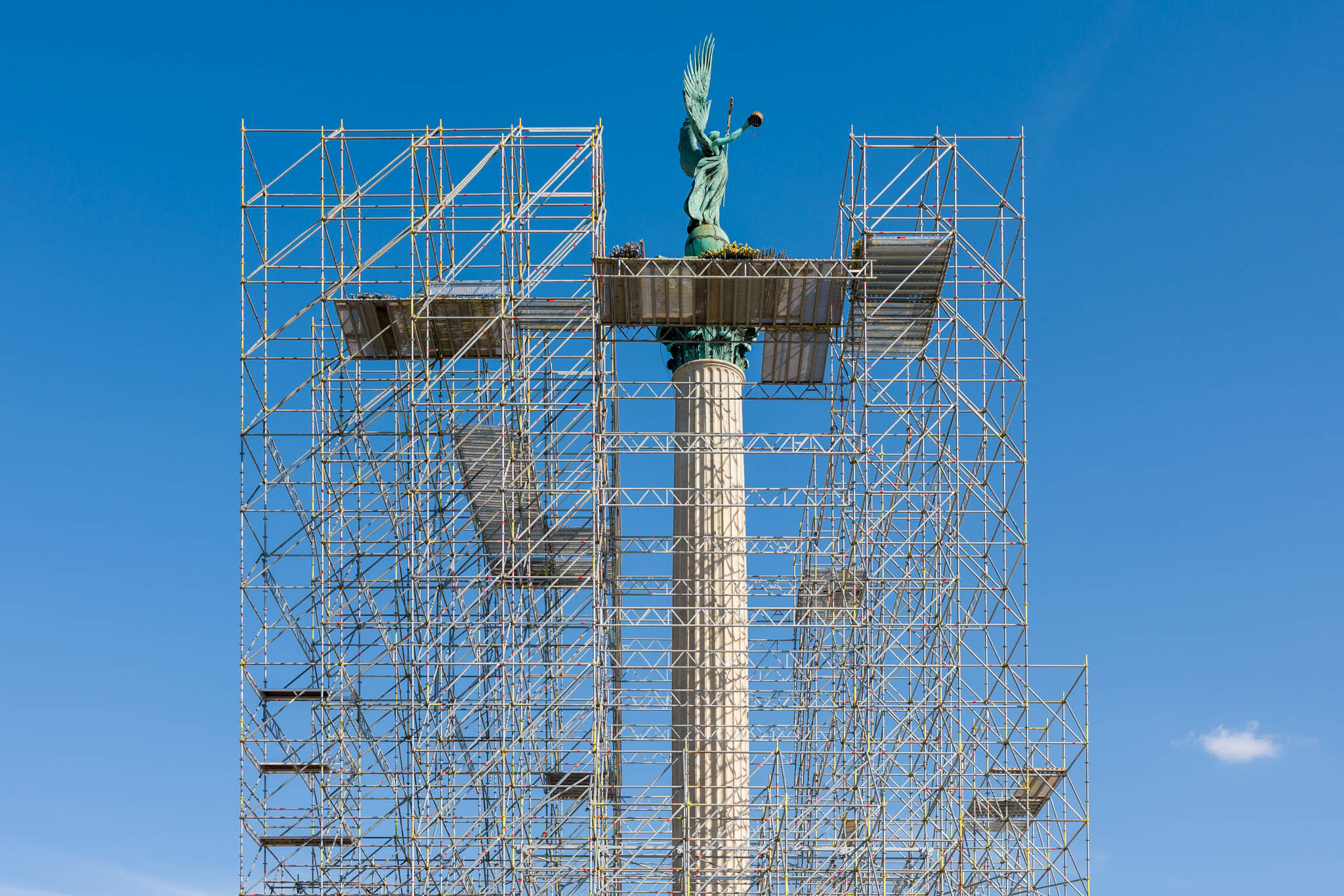 A Hősök terének monumentális központi figuráját először veszik le 36 méter magas díszoszlopáról, amelyhez Layher állványzatot vontak Gábriel köré.
