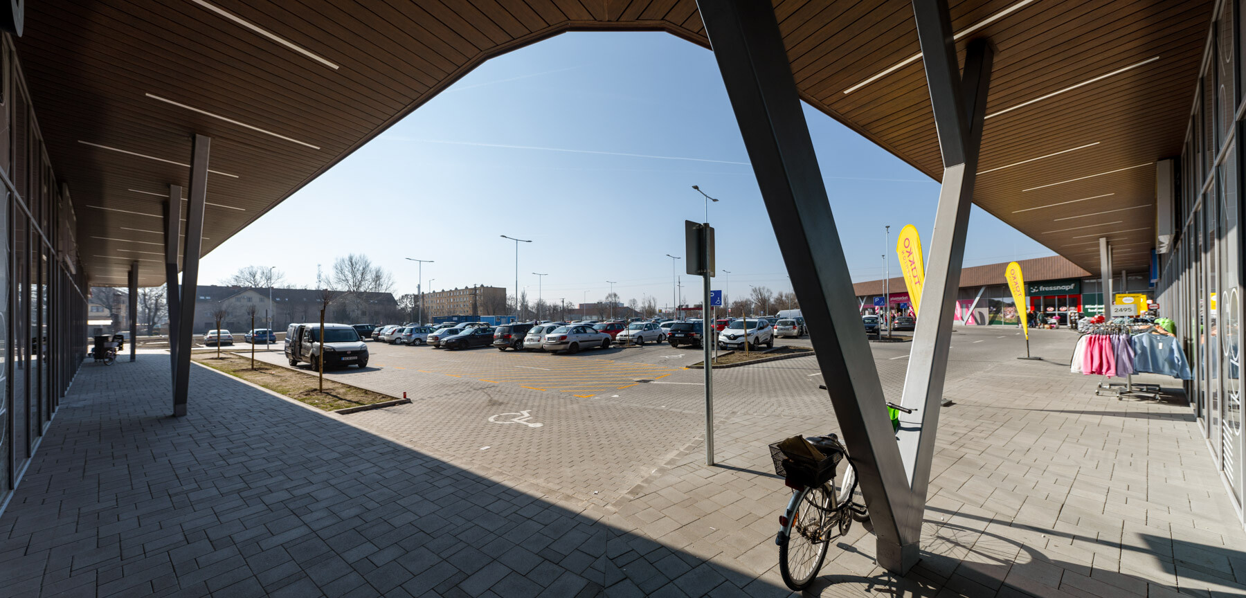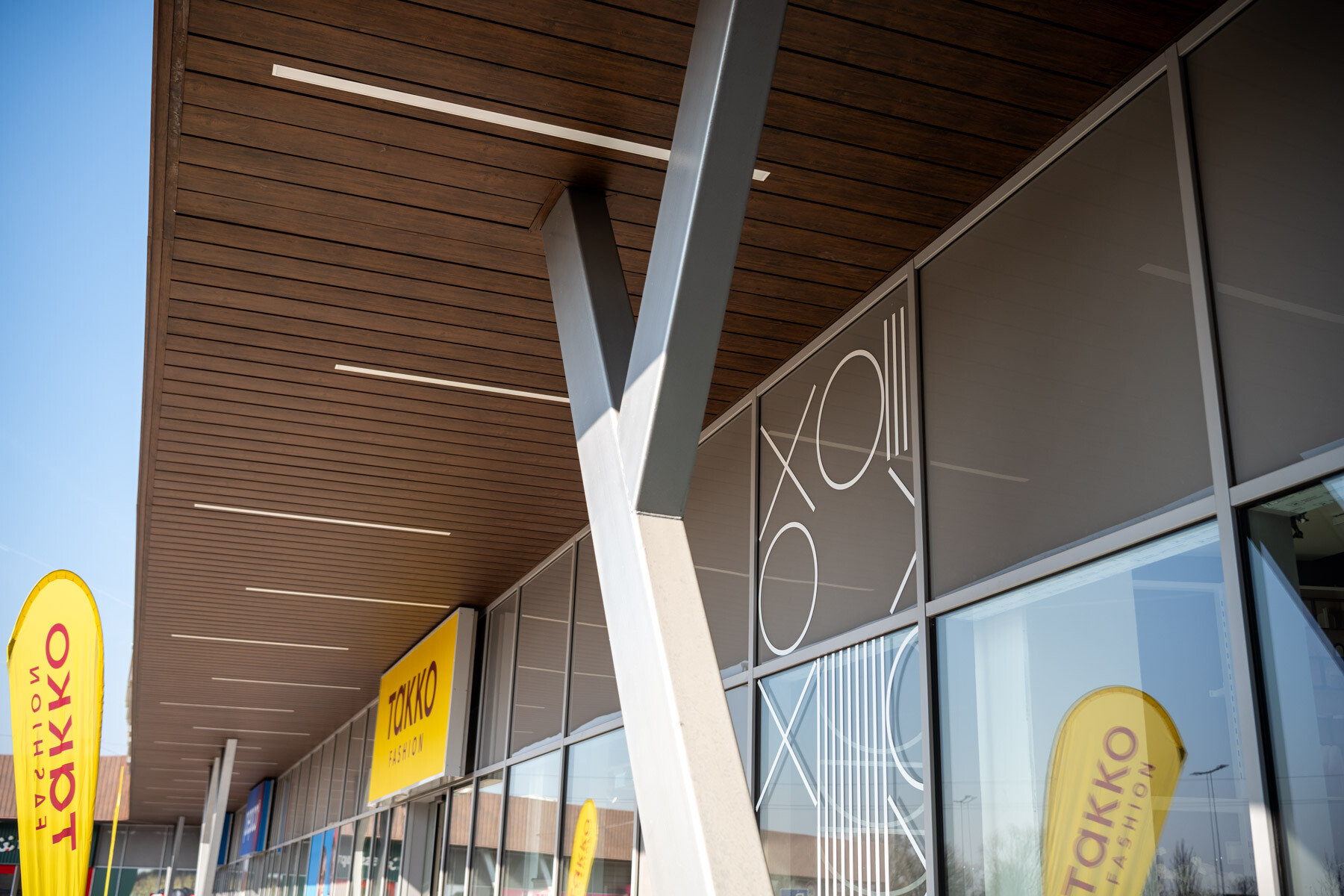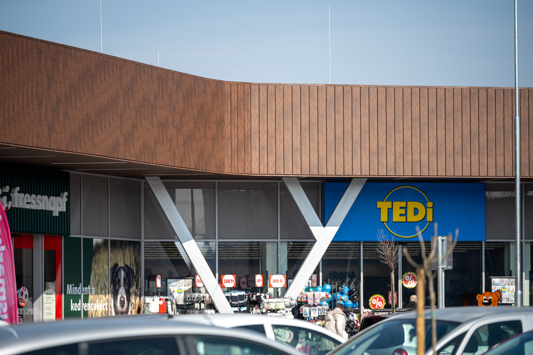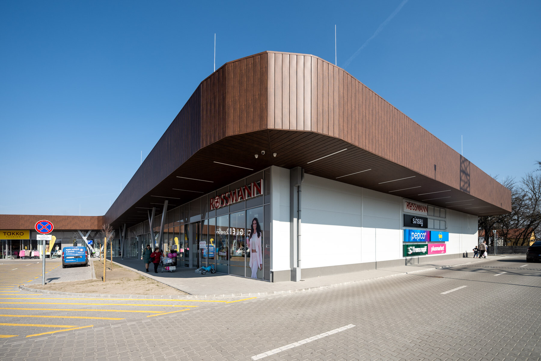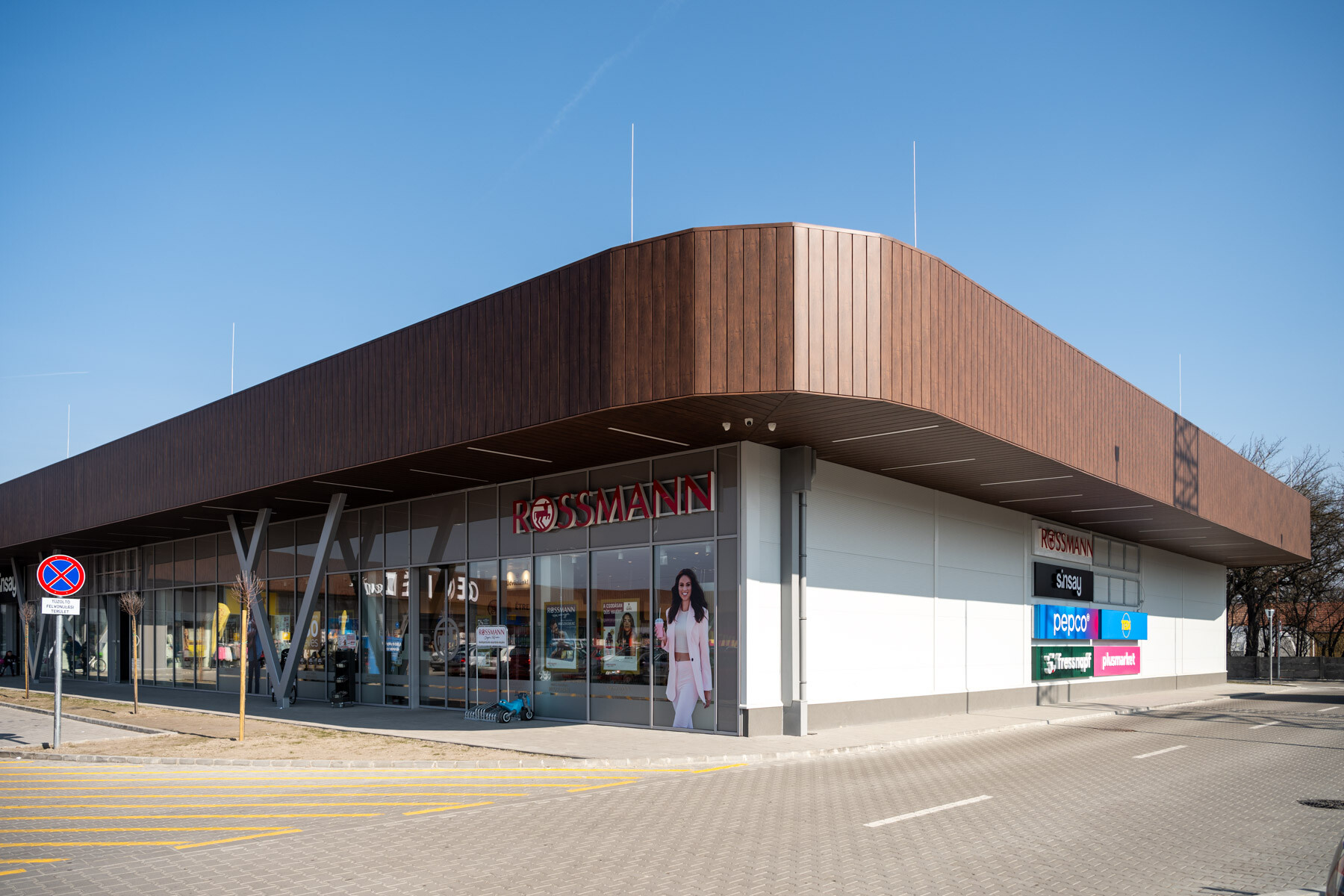 Közel 600 m2 alumínium függönyfalat telepítettek a 4.815 m2 hasznos alapterületű bevásárlóközpont vásárlói bejáratainak homlokzatán, míg a többi felület 10 cm-es Kingspan burkolatot kapott. Megszakítás nélkül fut körbe az épületen a konzolos rögzítésű, 2 méter magas homlokzatú előtető változó kinyúlással, aminek álmennyezete és homlokzata az Orha Művek Zrt. által gyártott OMClad sávos, famintás acéllemez-burkolatot kapott.