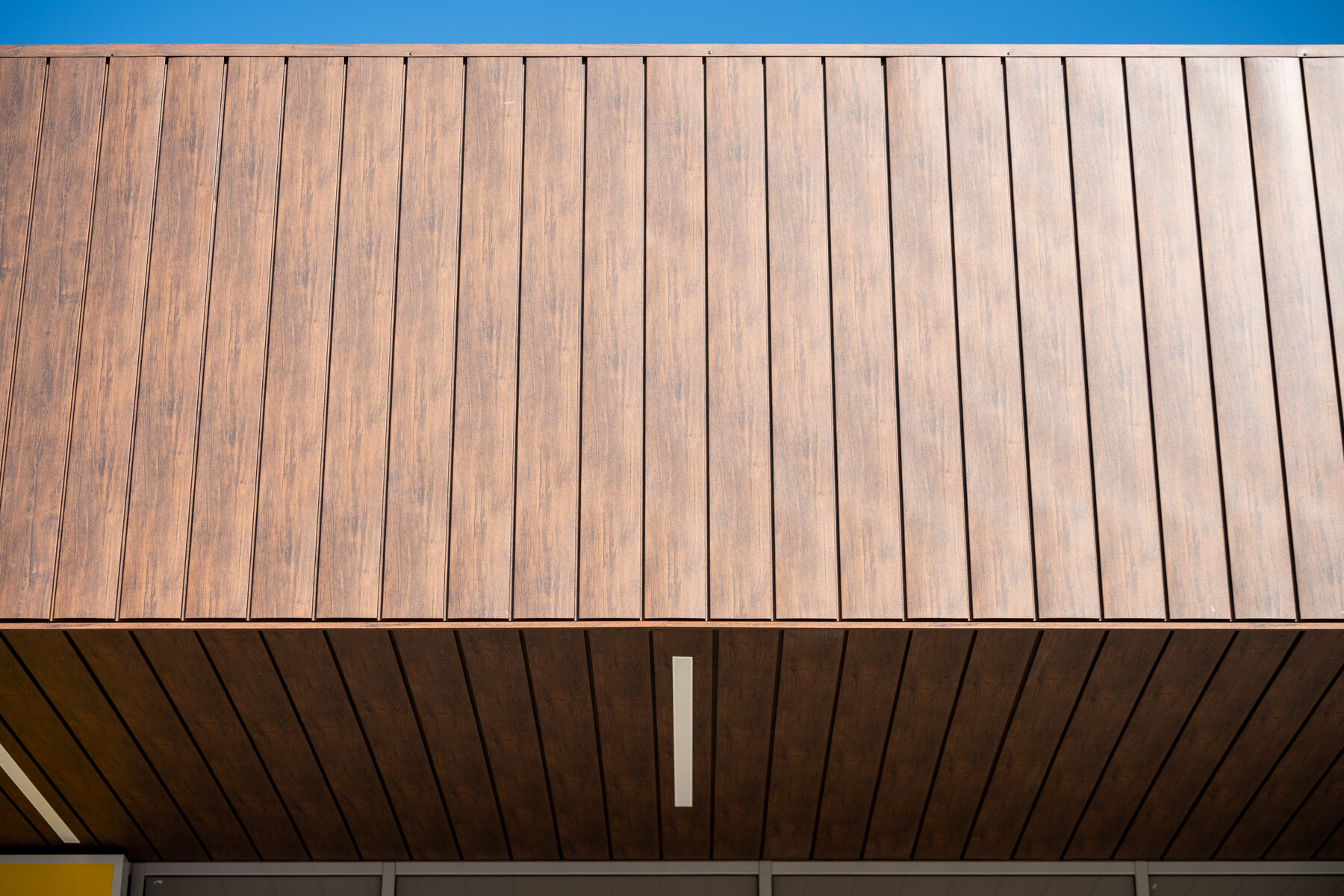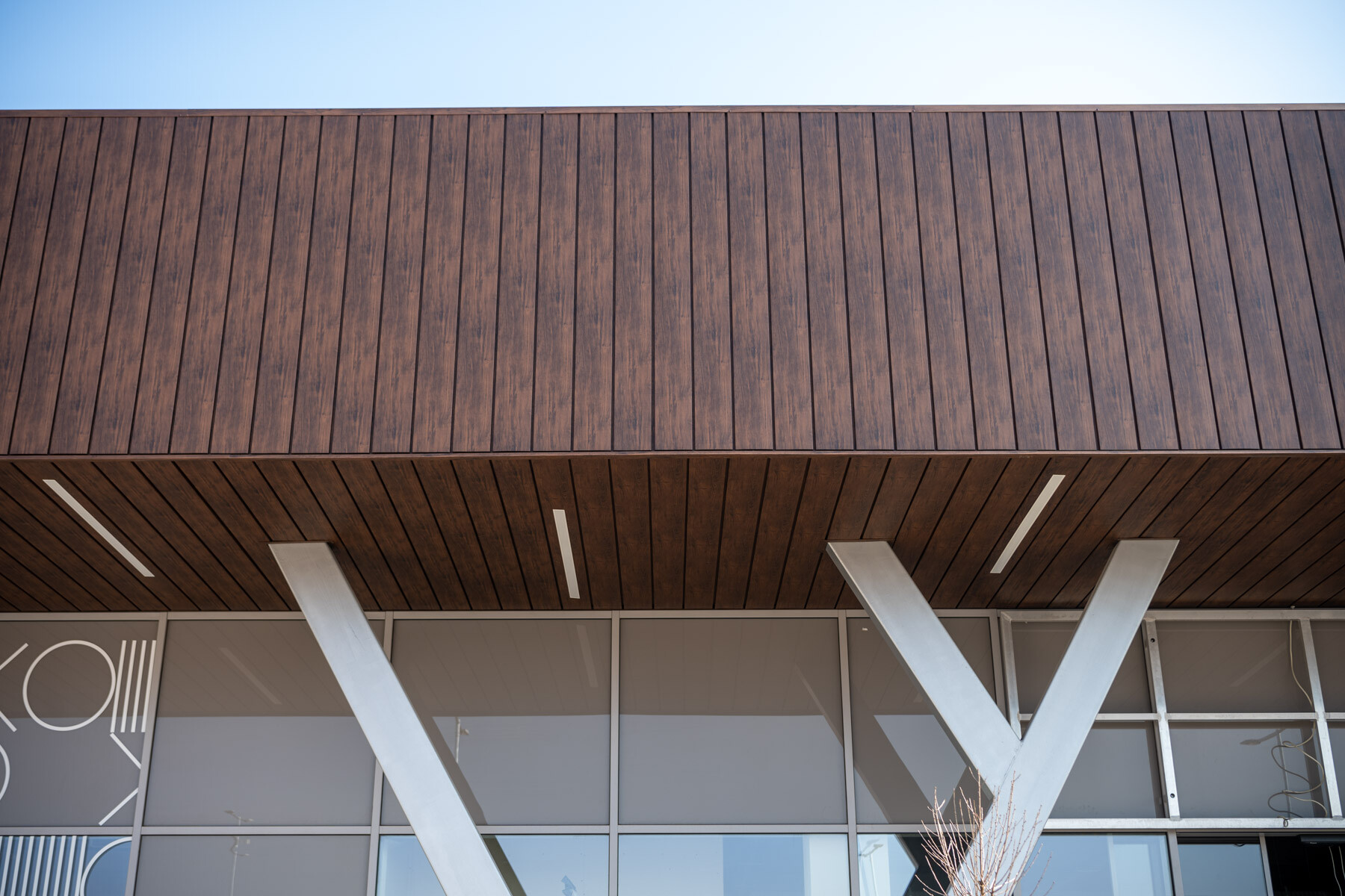 Végül 185 mm-es modulszélességgel, illetve 15 mm-es fugaopcióval gyártották le a burkolatot 0,5 mm vastag acéllemezből, dió színben. Hozzávetőleg 1700 m2 burkolati anyagot szállítottak az építkezésre a kapcsolódó szegésekkel együtt, amelyeket emelt horganyrétegű acélprofilokra rögzített a kivitelező az építés során.