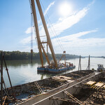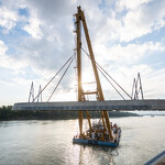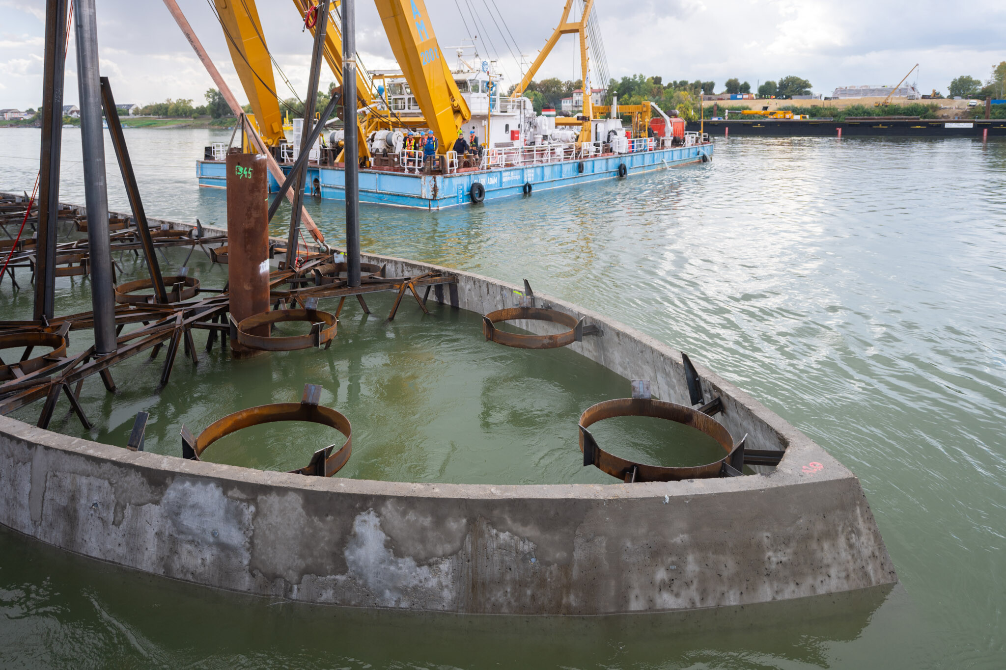Összesen hat kéregelemet helyeznek egymásra a folyóban a Duna Aszfalt Zrt. kivitelezésében épülő mohácsi híd mederpillérének építésekor. Egy hazánkban először alkalmazott technológia milliméter pontosságot biztosít az első kéregelem beállításához.
