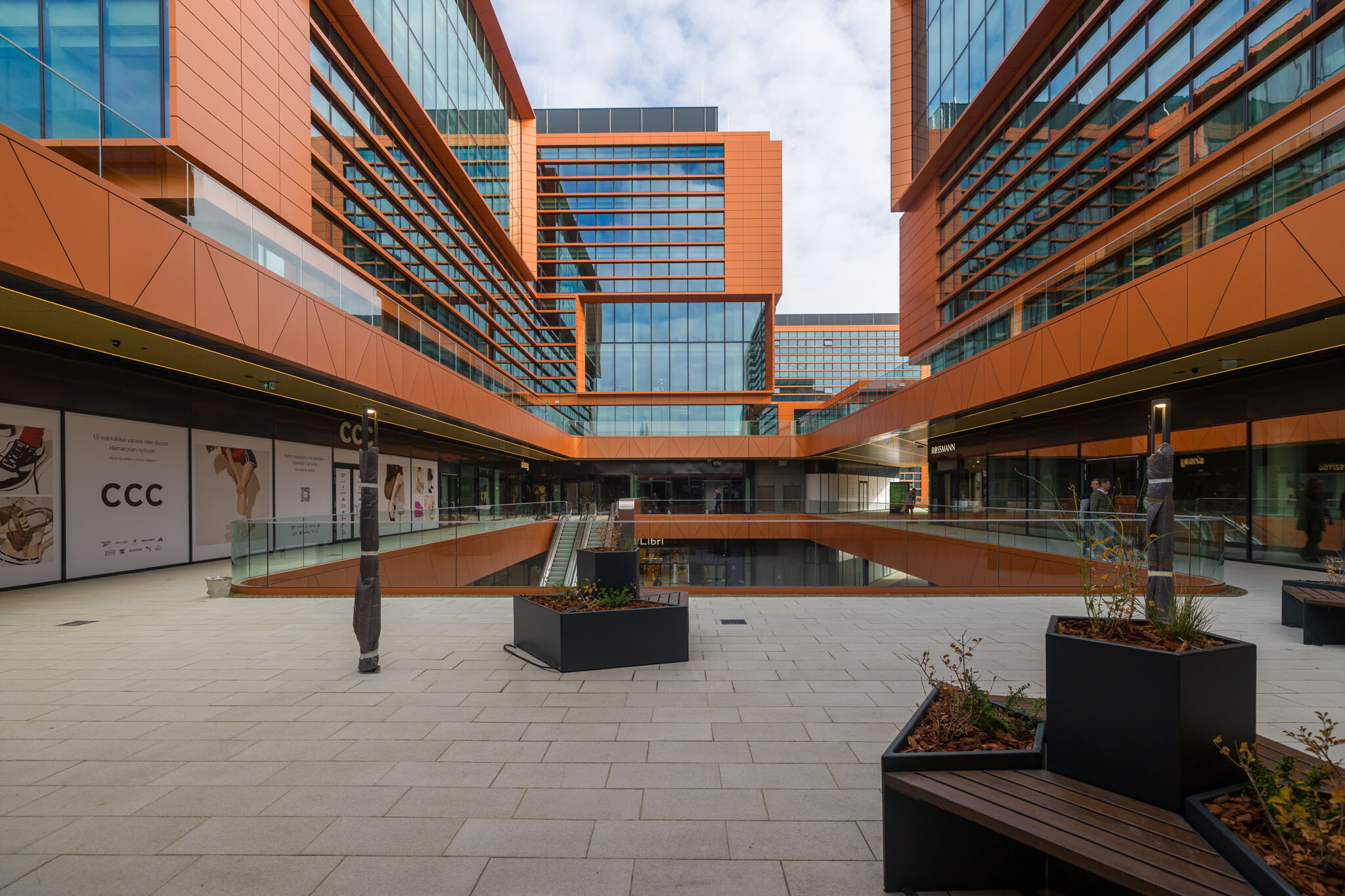 Ahogy azt korábbi cikkünkben is jeleztük, a beruházásban nem egy fedett, plázaszerű épület jött létre, hanem egy street-mall (földszintes üzletekből álló, nem fedett üzletközpont – a szerk.) és egy hagyományos bevásárlóközpont keveréke. Ennek megfelelően egy nyitott központi teret képező belső udvar köré rendeződnek a szolgáltatók üzlethelyiségei.