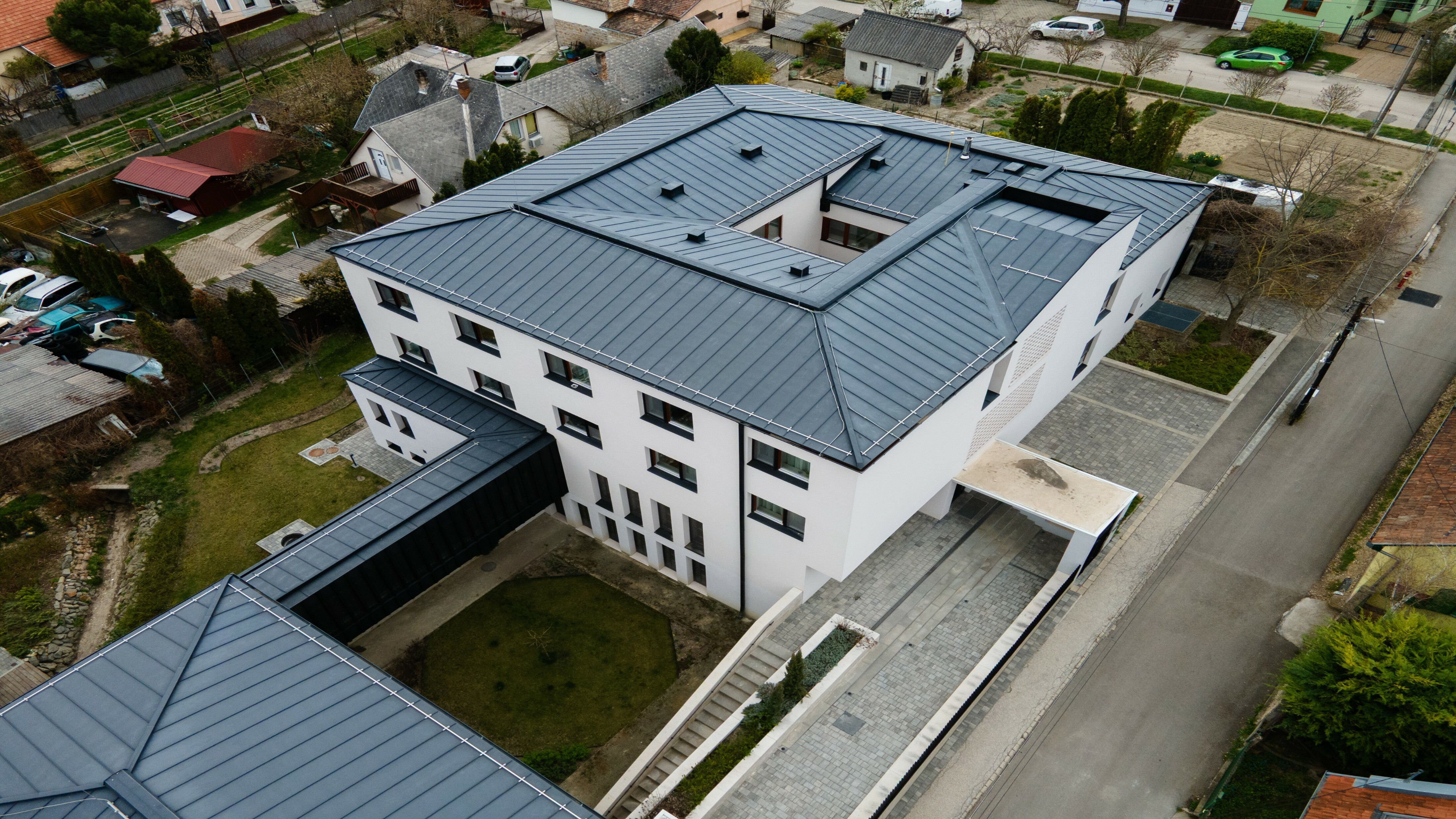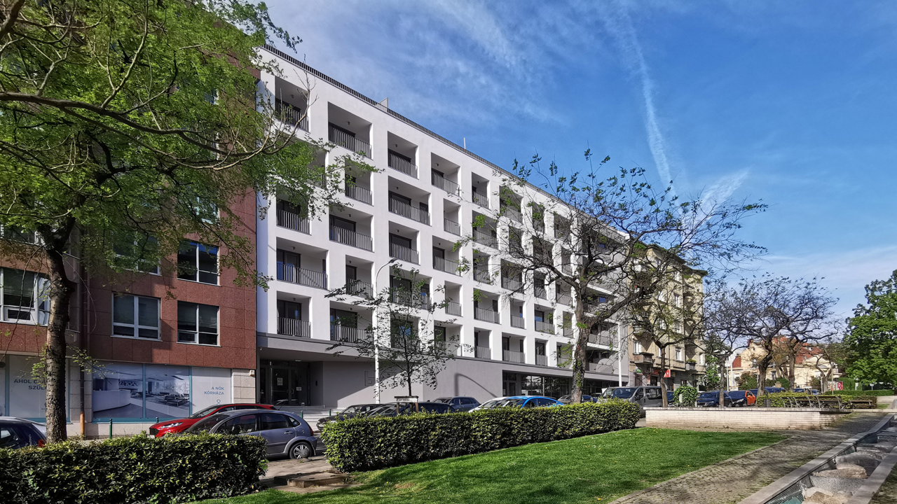 Az egykor üresen álló telekre korábban Makovecz Imre is tervezett házat. A most megvalósult L alakú épülettömb a Királyhágó tér zártsorú és a Németvölgyi út szabadon álló beépítését köti össze, így hidat képez a két városi szövet között A 31 lakásos épület igazi értéke tágas, zöld belső udvarával, közösségi tereivel, háromszintes mélygarázsával visszafogott funkcionális megjelenésével nem a látványosságában, hanem az élhetőségeben és a használhatóságában rejlik, melyben a lakók élhető csendes otthonra találnak.