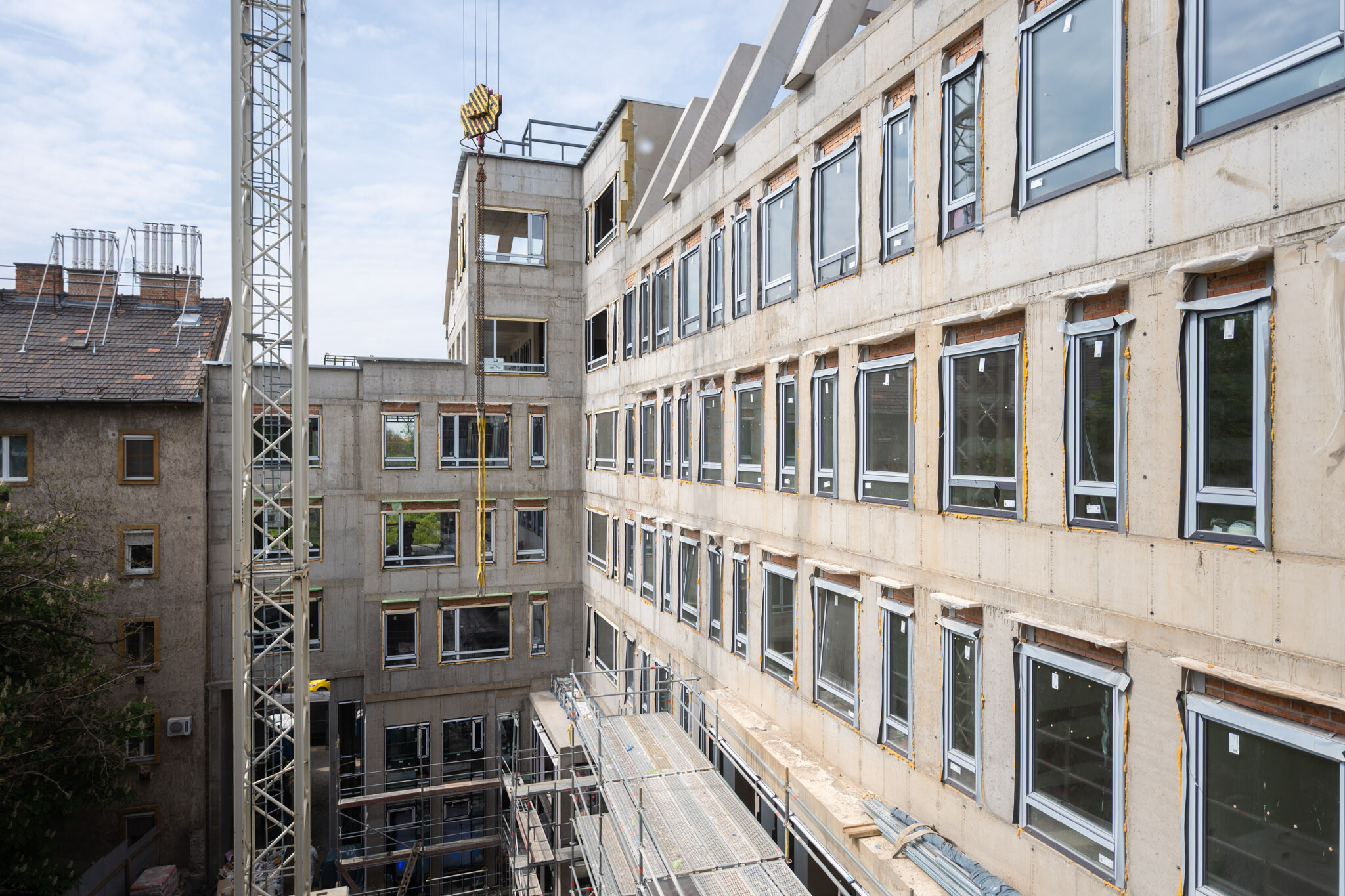 Külön szakmai odafigyelést igényelt a szomszédos, több mint százéves épületek állékonyságának megóvása is, különösen az alapozási munkák során. A kivitelezés teljes időtartama alatt folyamatos, napi szintű logisztikai és szervezési feladatokat kell megoldani, beleértve a közterület-használat optimalizálását és a helyszíni anyagmozgatást is.