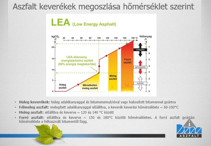 A világszabadalommal védett LEA eljárással történő aszfaltgyártás jelentős, akár 50 % energia megtakarítást tesz lehetővé, és párhuzamosan 50-60 %-kal csökken a szénmonoxid kibocsátás, amely jelentősen hozzájárul az üvegházhatás csökkenéséhez. Az eljárás lehetőséget biztosít a felmart aszfalt különböző, LEA típusú aszfaltkeverékekben történő újrahasznosítására is.