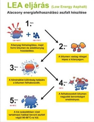 A világszabadalommal védett LEA eljárással történő aszfaltgyártás jelentős, akár 50 % energiamegtakarítást tesz lehetővé.