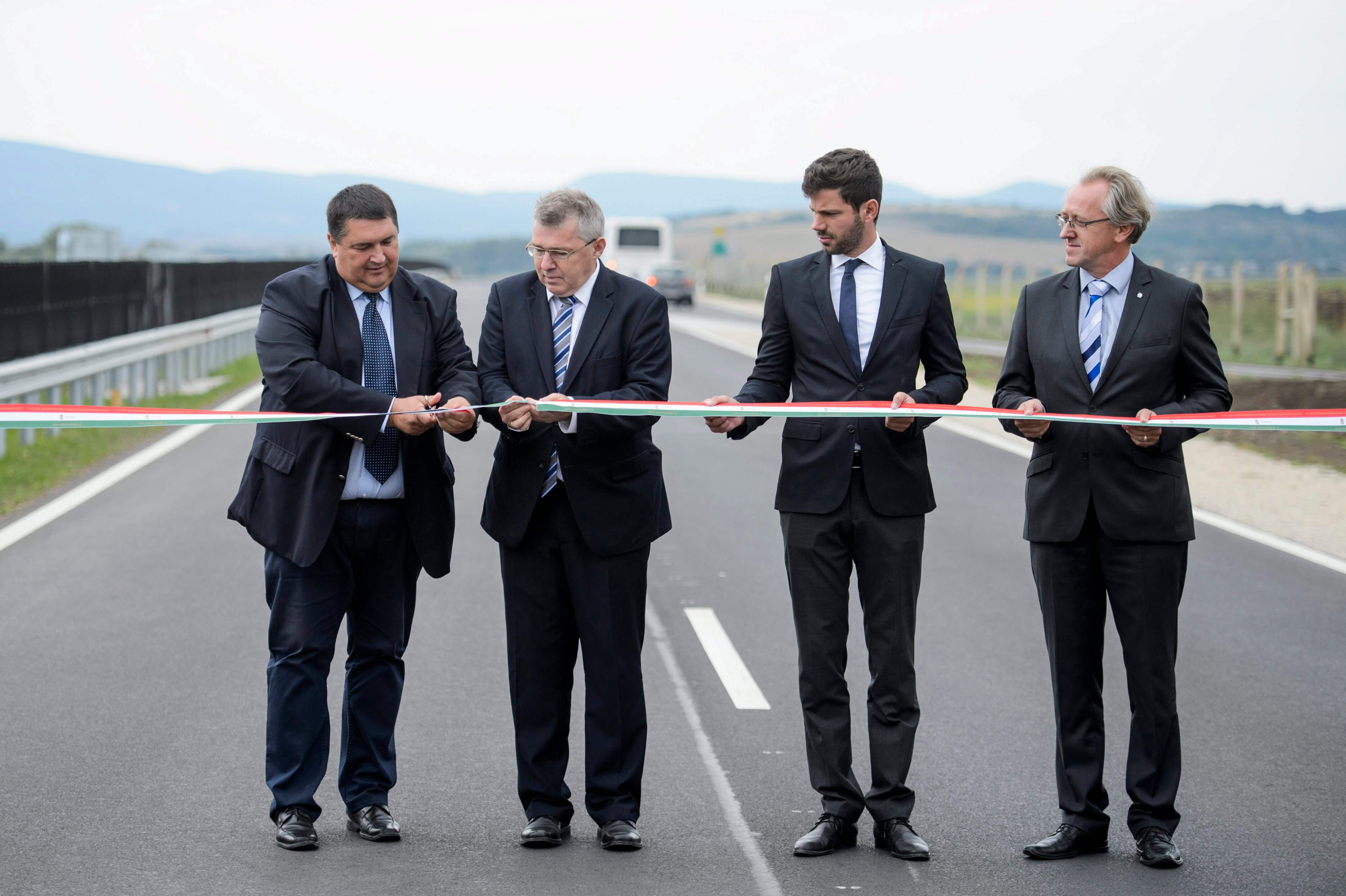 Szurdokpüspöki, 2015. szeptember 10. Becsó Zsolt, a kelet-nógrádi térség fideszes országgyűlési képviselője, Szabó Zsolt, a hevesi térség fideszes országgyűlési képviselője, a Nemzeti Fejlesztési Minisztérium fejlesztés- és klímapolitikáért, valamint kiemelt közszolgáltatásokért felelős államtitkára, Loppert Dániel, a Nemzeti Infrastruktúra Fejlesztő Zrt. kommunikációs igazgatója és Hegyi Zoltán, a Swietelsky Magyarország Kft. ügyvezetője (b-j) a 21. sz. főút felújított szakaszainak átadási ünnepségén Szurdokpüspöki közelében 2015. szeptember 10-én. MTI Fotó: Komka Péter