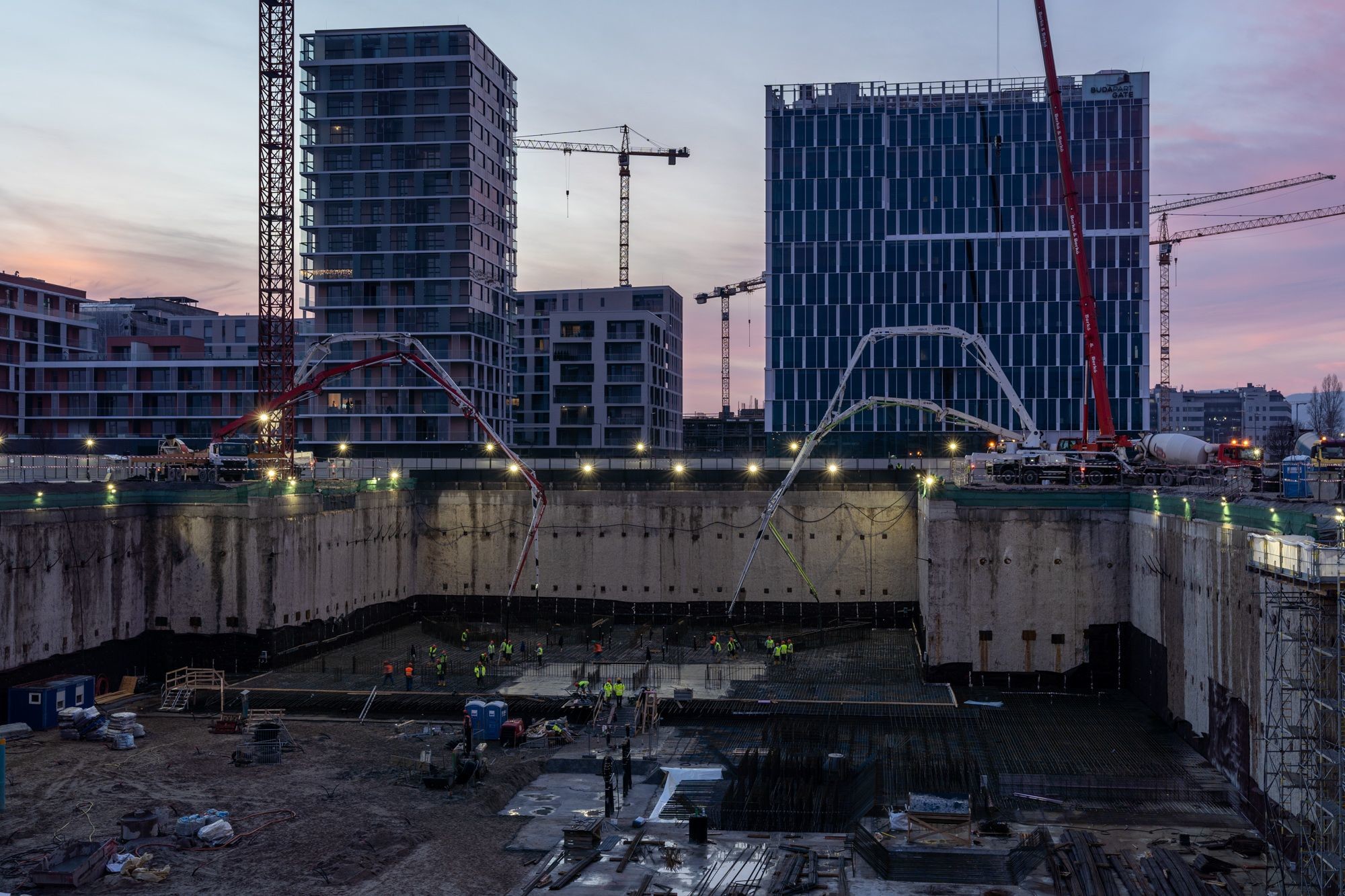 A kivitelezés során az első jelentős műszaki mérföldkövet az alaplemez betonozása jelentette. A betonozási feladat során a 4.500 m3 volumenű alaplemez egy ütemben, négy betonpumpával, 45 órás folyamatos betonozással, 626 mixerforduló segítségével épült meg, négy műszakban összesen 50 fő műszaki irányító vezetésével.