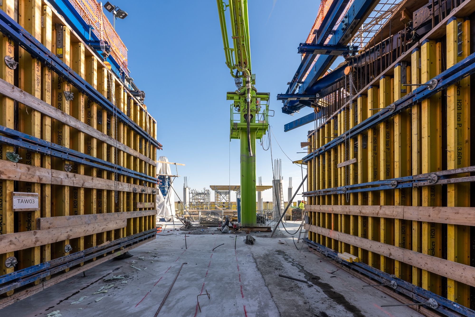 Az egyenként 200 tonna súlyú, Doka SKE50 és SKE100 típusú, 24-24 hidraulikával mozgatott automata kúszórendszerek előszerelését, telepítését és működtetését a Moratus Kft. saját műszaki és fizikai állományával végezte a Doka magyar és osztrák szerelésvezetői segítségével.