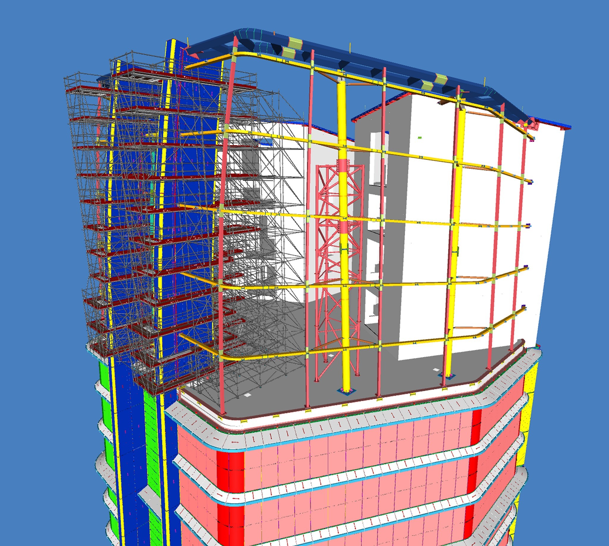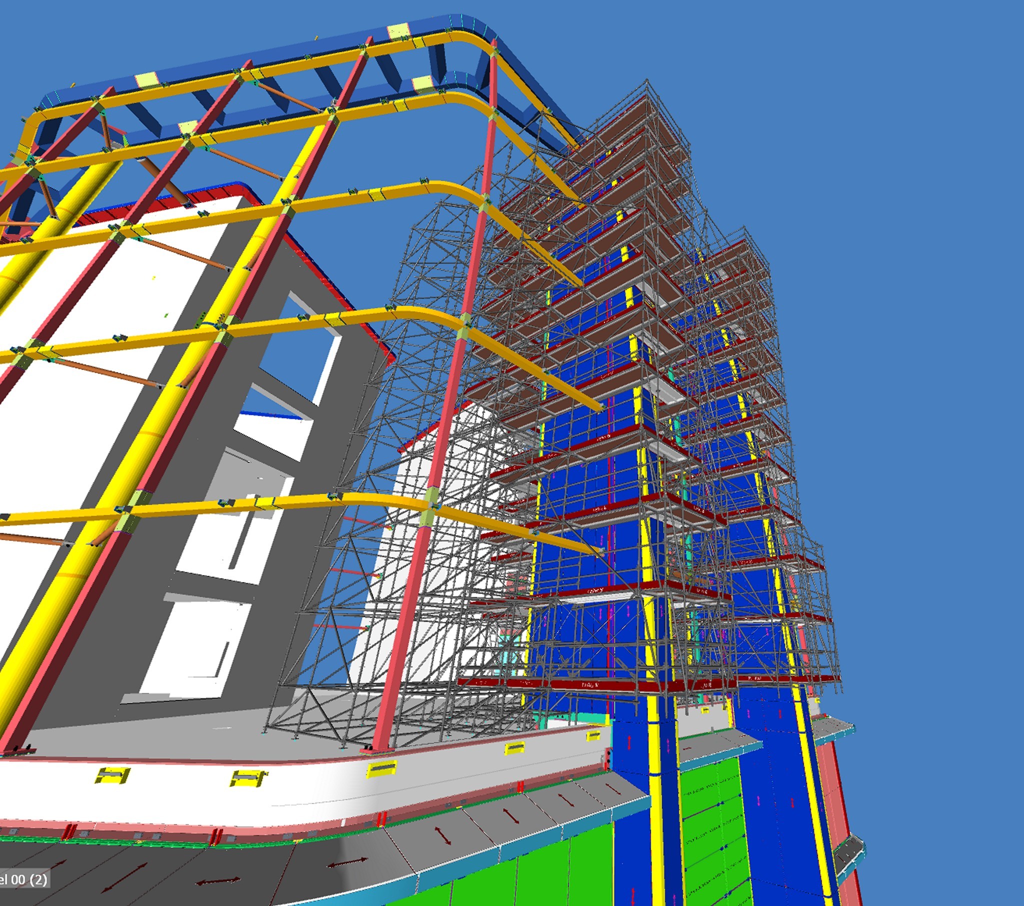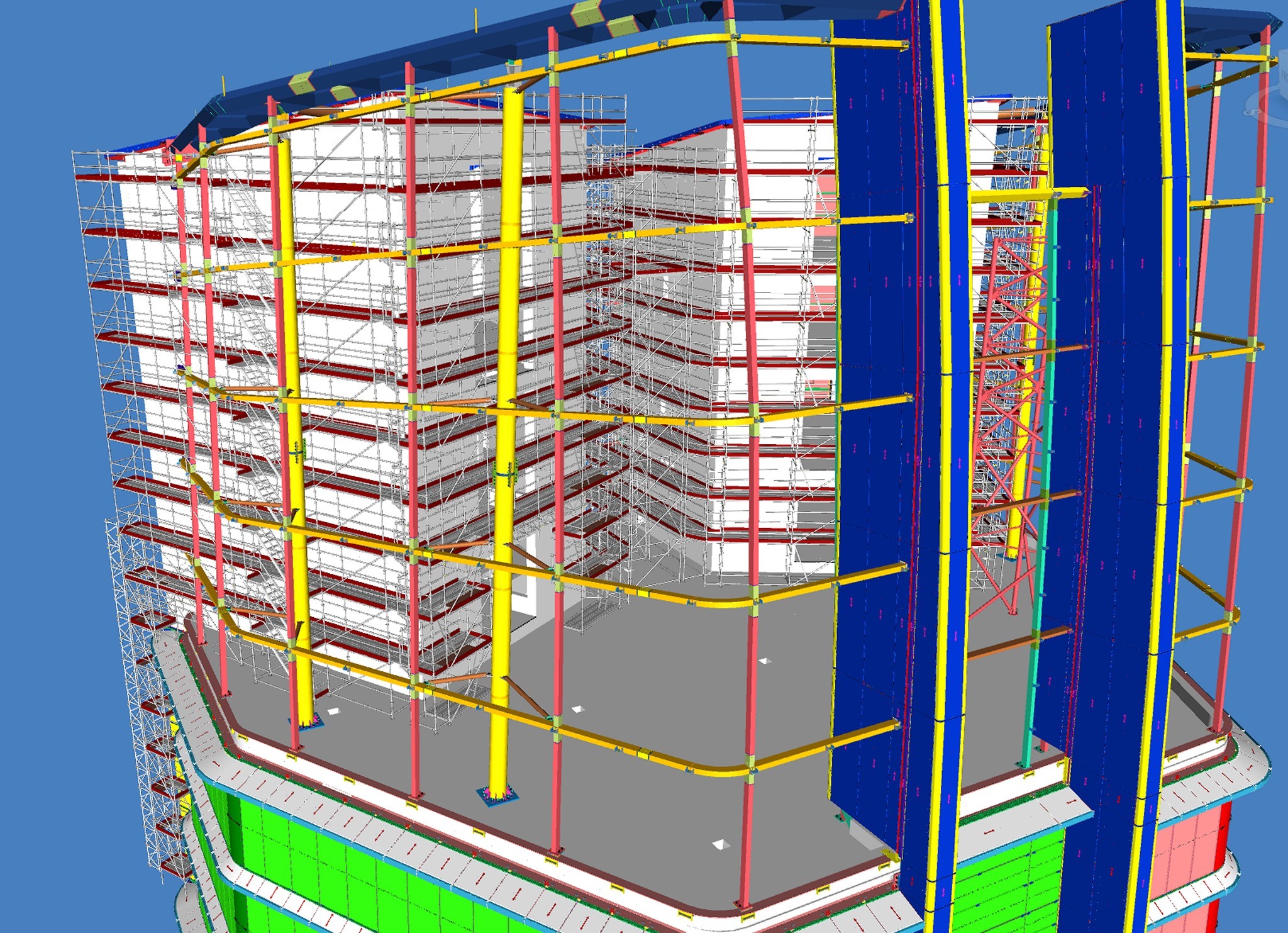 A tervezők rendelkezésére állt az épület BIM modellje, erre készítették el a 3D állványtervet. Több fontos szempontot kellett szem előtt tartani már a tervezési fázisban. Többek között azt a tényt, hogy az épület homlokzati síkjából jelentősen kinyúlik az állvány egy része, így itt hatványozottan számolni kellett a felmerülő szélteherrel. Emellett az épület vasbeton és acélszerkezeti elemeinek geometriája követelt meg olyan állványmegoldásokat, amelyek teljes mértékben alkalmazkodnak a kötött lehetőségekhez.