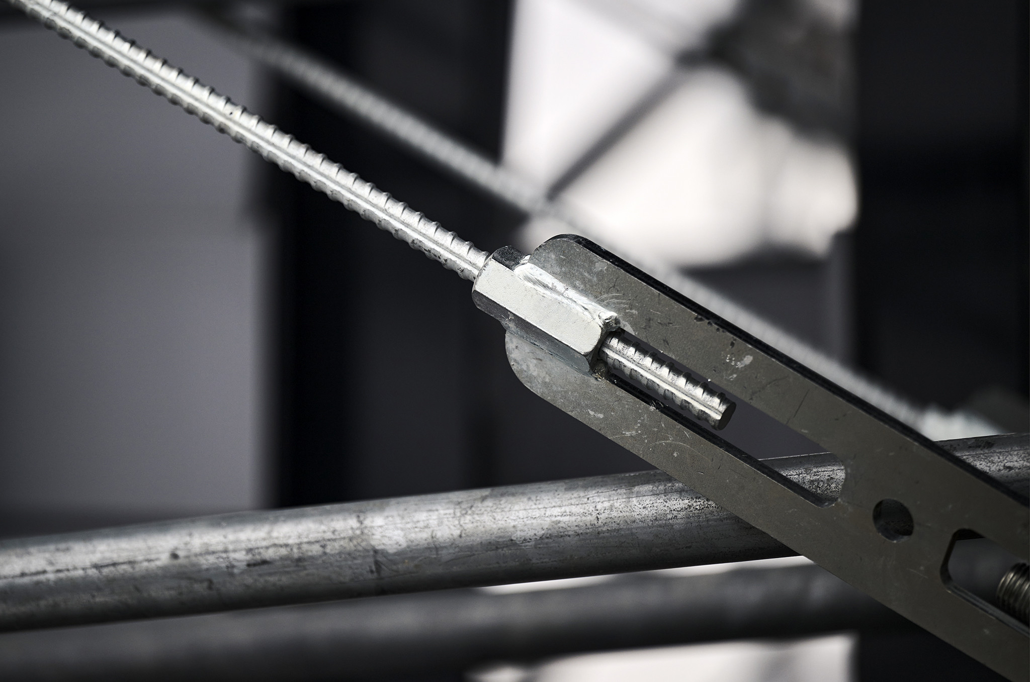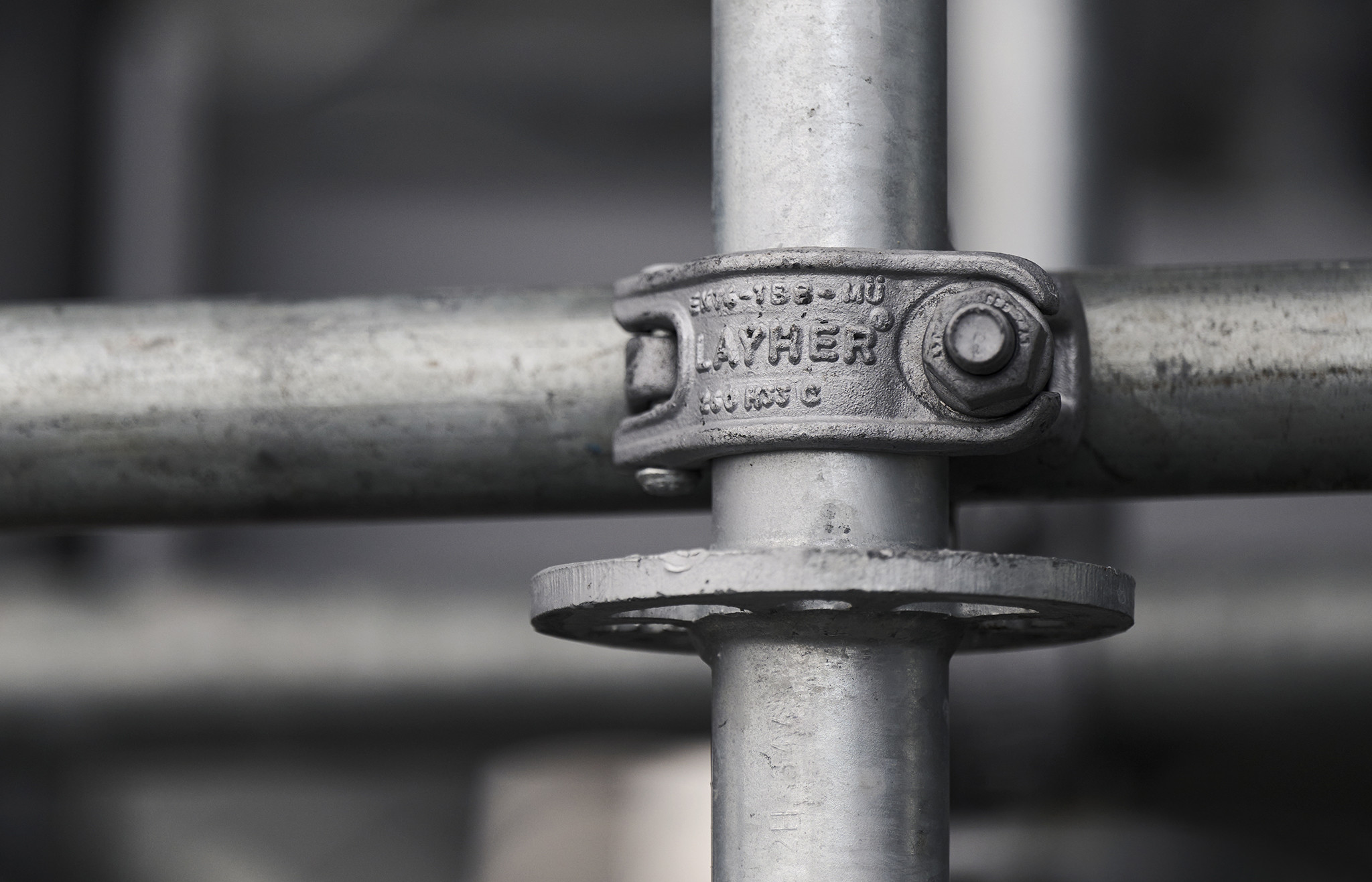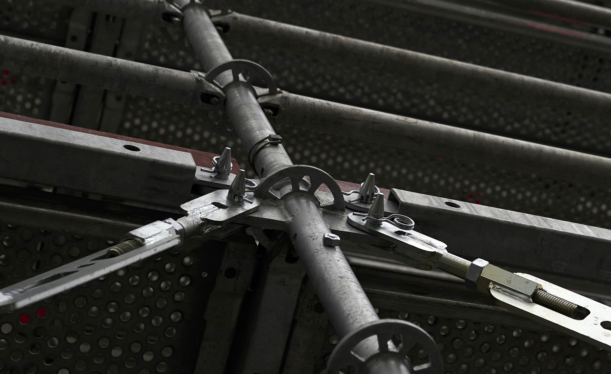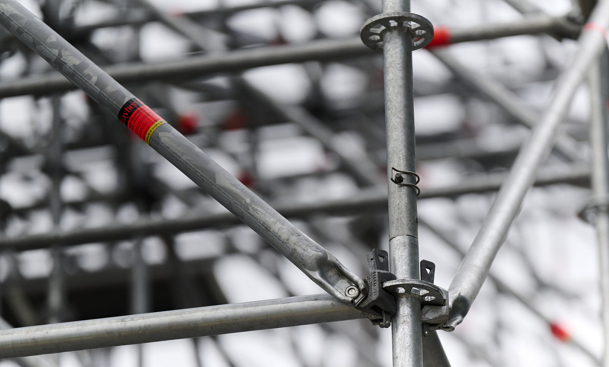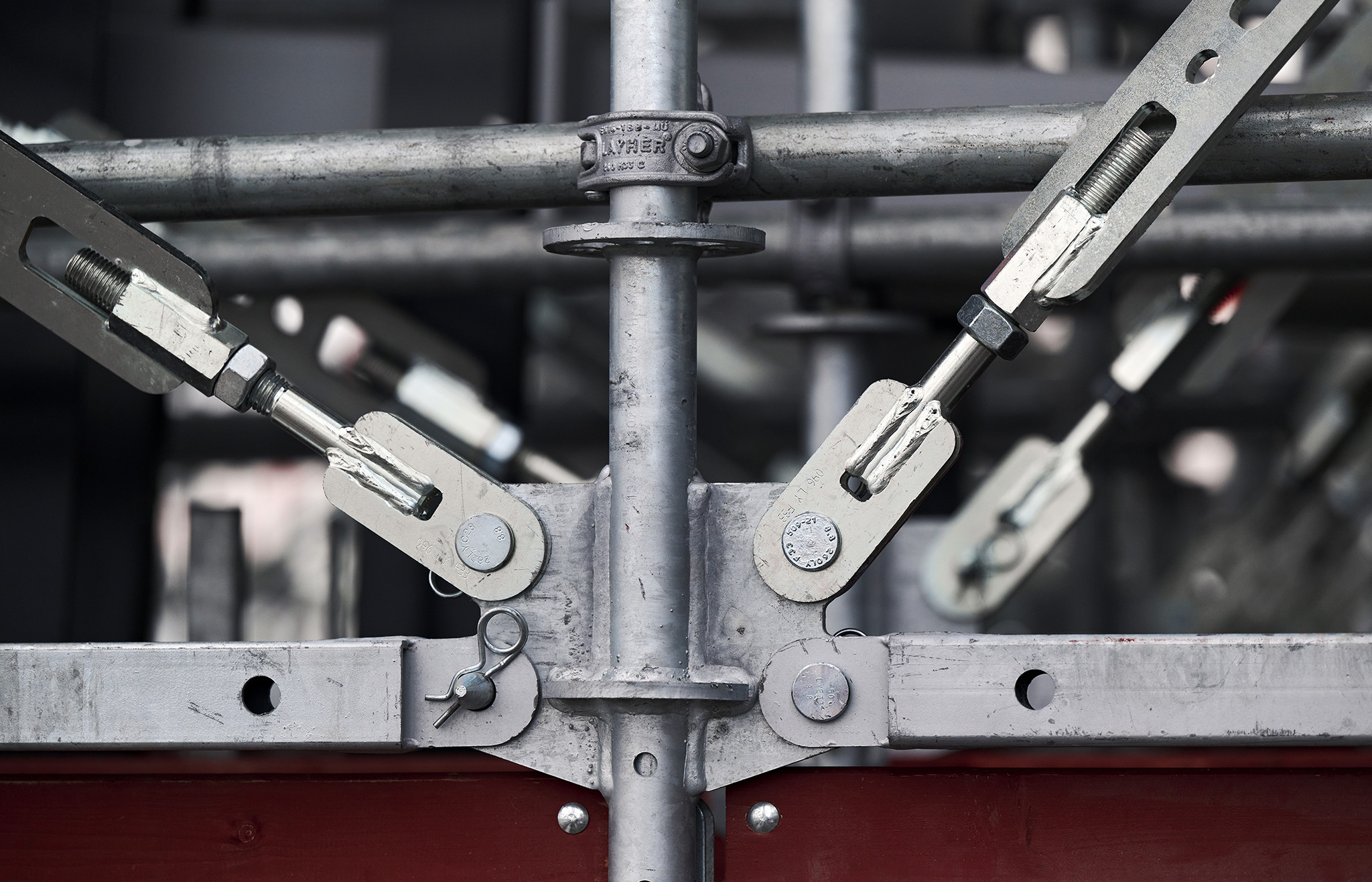 A részben „levegőben lógó” állványzat biztonságos rögzítését a nagy teherbírású Allround FW elemekkel oldották meg. Tóth Patrik kiemelte, hogy a 10 darab konzolos kialakítású FW tartó közel 20 tonna súlyt tart meg 5 méteres kinyúlással. A Layher FW rendszer elemei nagy fesztávú áthidalások és nagy teherbírást igénylő szerkezetek tervezése esetén praktikusak, mert így rendszeren belül könnyen és gyorsan megoldhatók az ilyen jellegű feladatok.