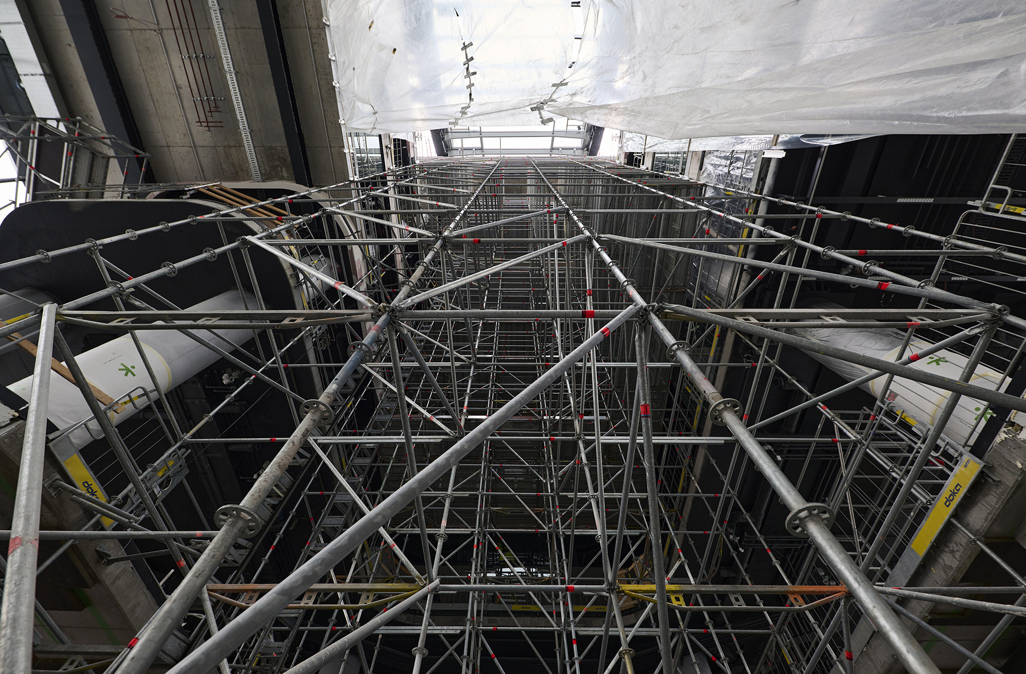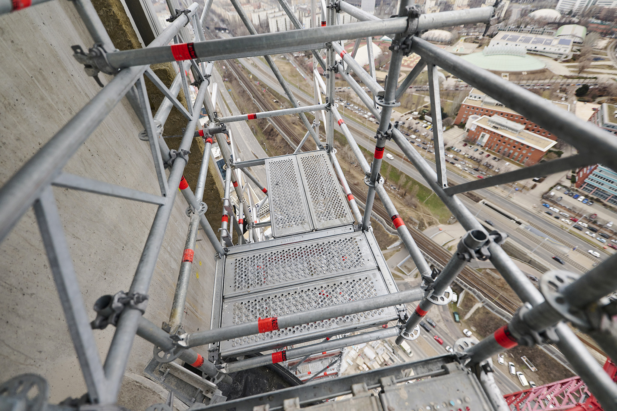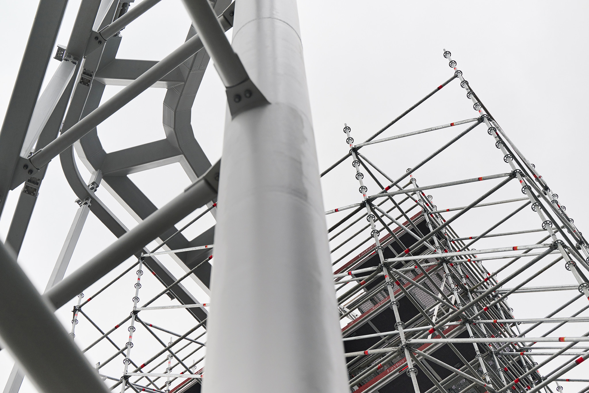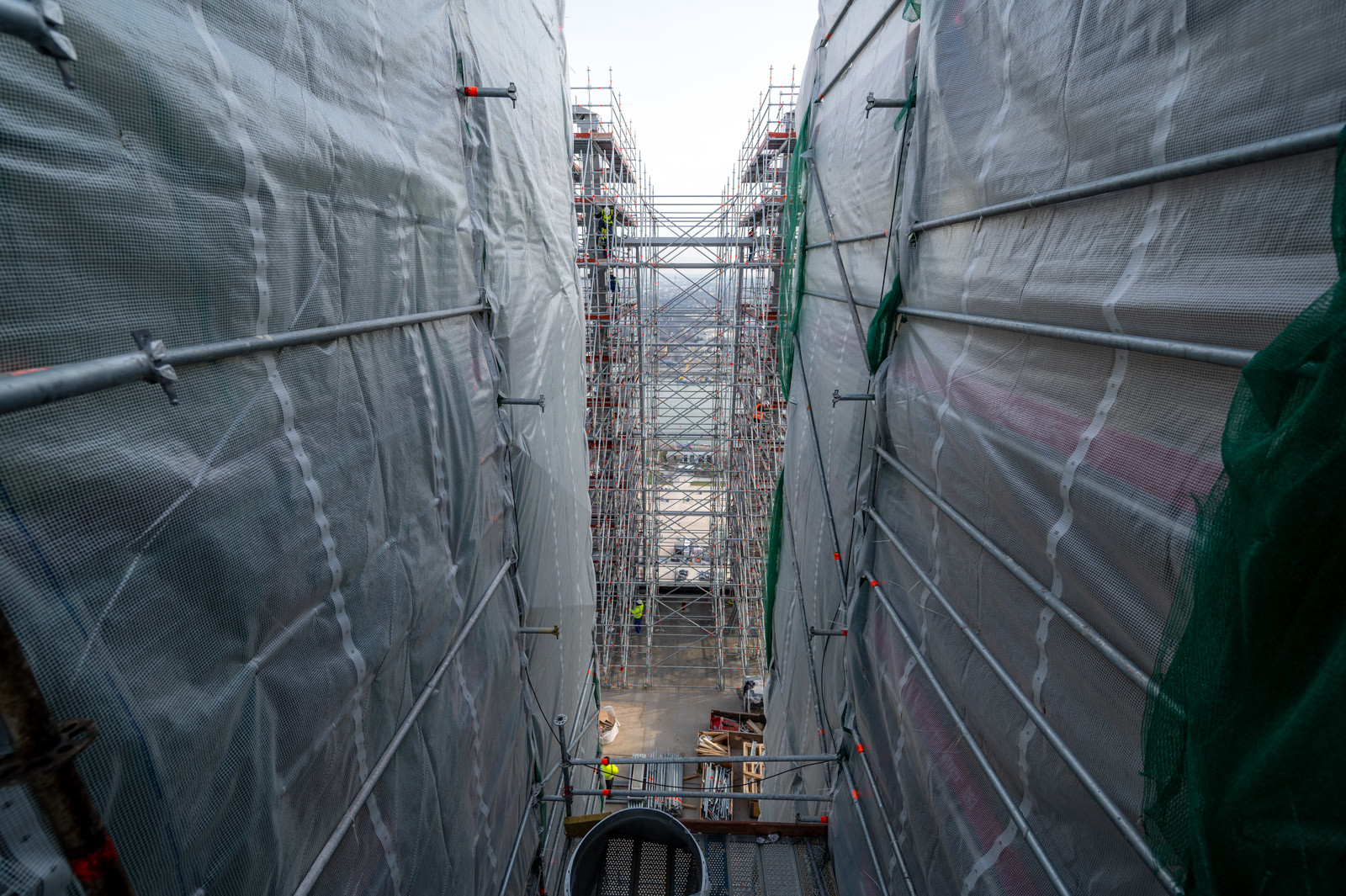 Az állványzat szintén az épület zárófödéméről indult 120 méter magasan, a pillérek ívelt formáját pontosan lekövetve. Fontos szempont volt, hogy a szerkezet minden pontja kényelmesen elérhető legyen az állványzatról, így az épület homlokzatától kifelé nyúló állványtagok a biztonságos munkavégzéshez elengedhetetlen szerepet töltöttek be.