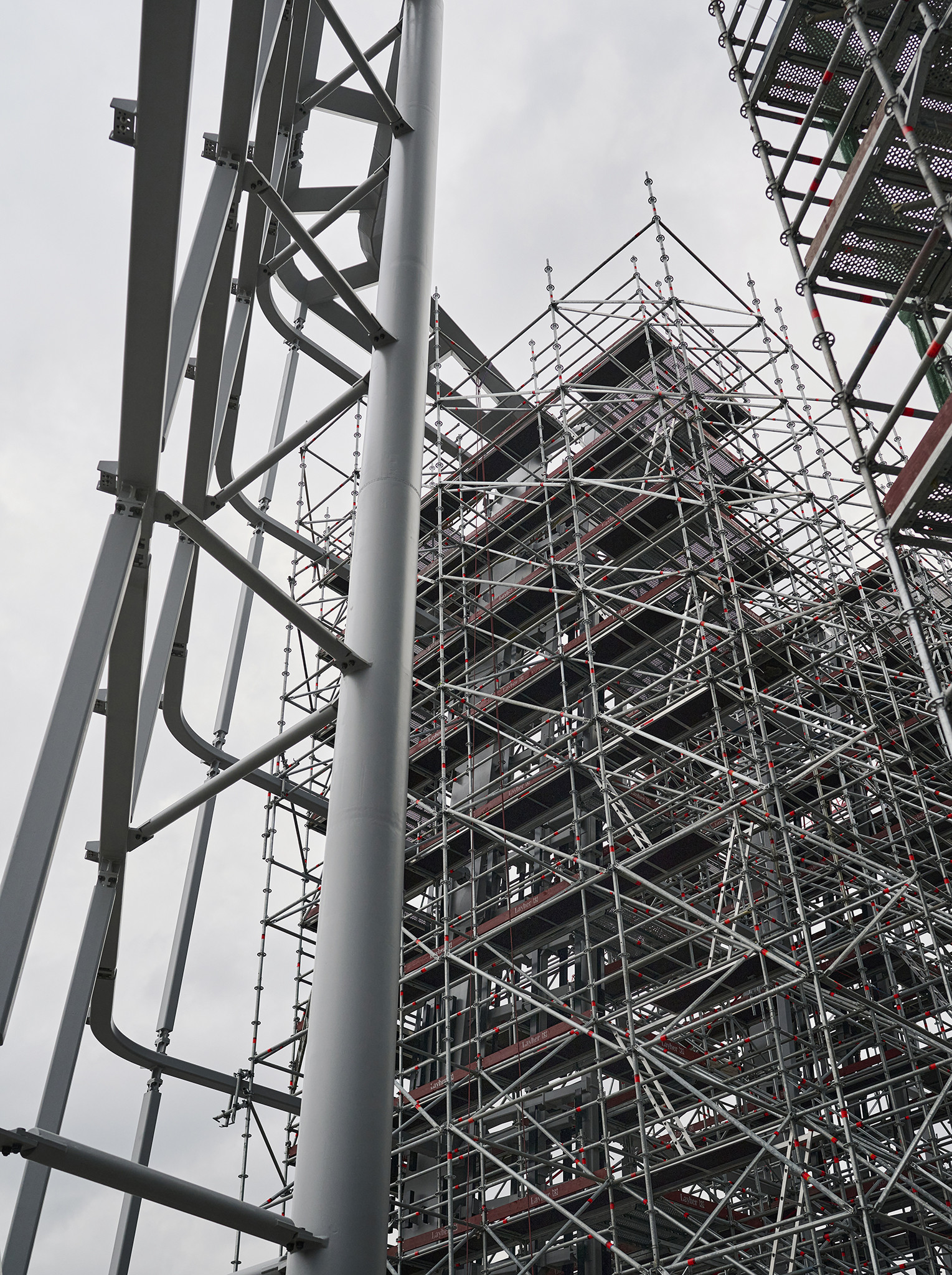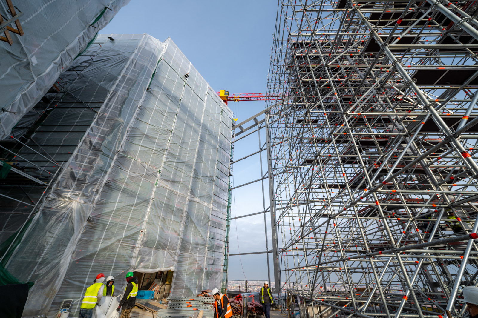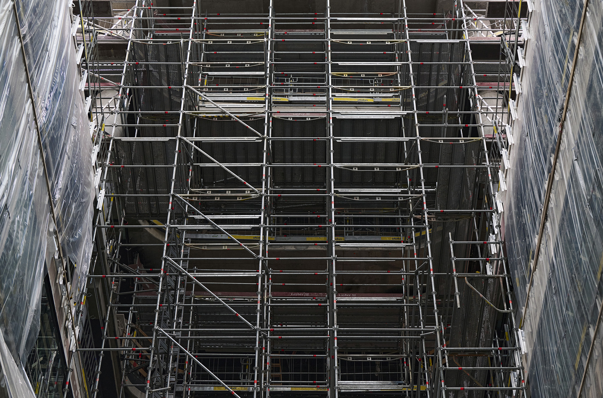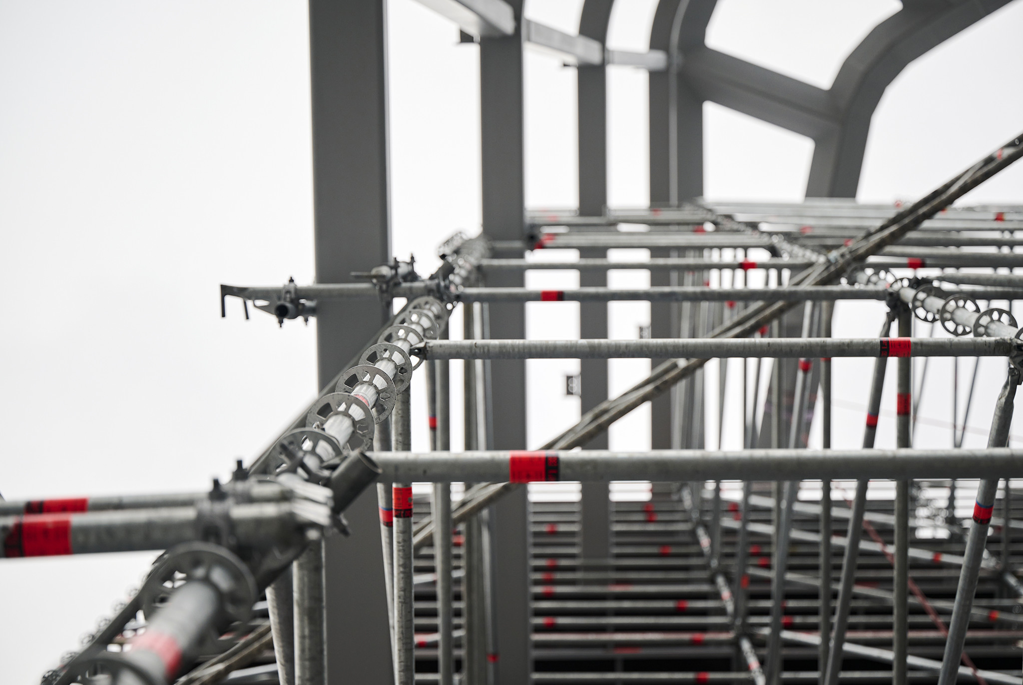 Az állványzat szintén az épület zárófödéméről indult 120 méter magasan, a pillérek ívelt formáját pontosan lekövetve. Fontos szempont volt, hogy a szerkezet minden pontja kényelmesen elérhető legyen az állványzatról, így az épület homlokzatától kifelé nyúló állványtagok a biztonságos munkavégzéshez elengedhetetlen szerepet töltöttek be.