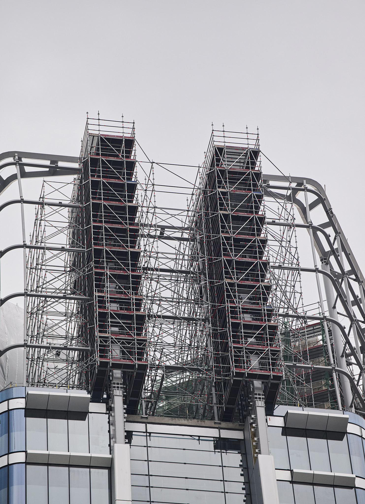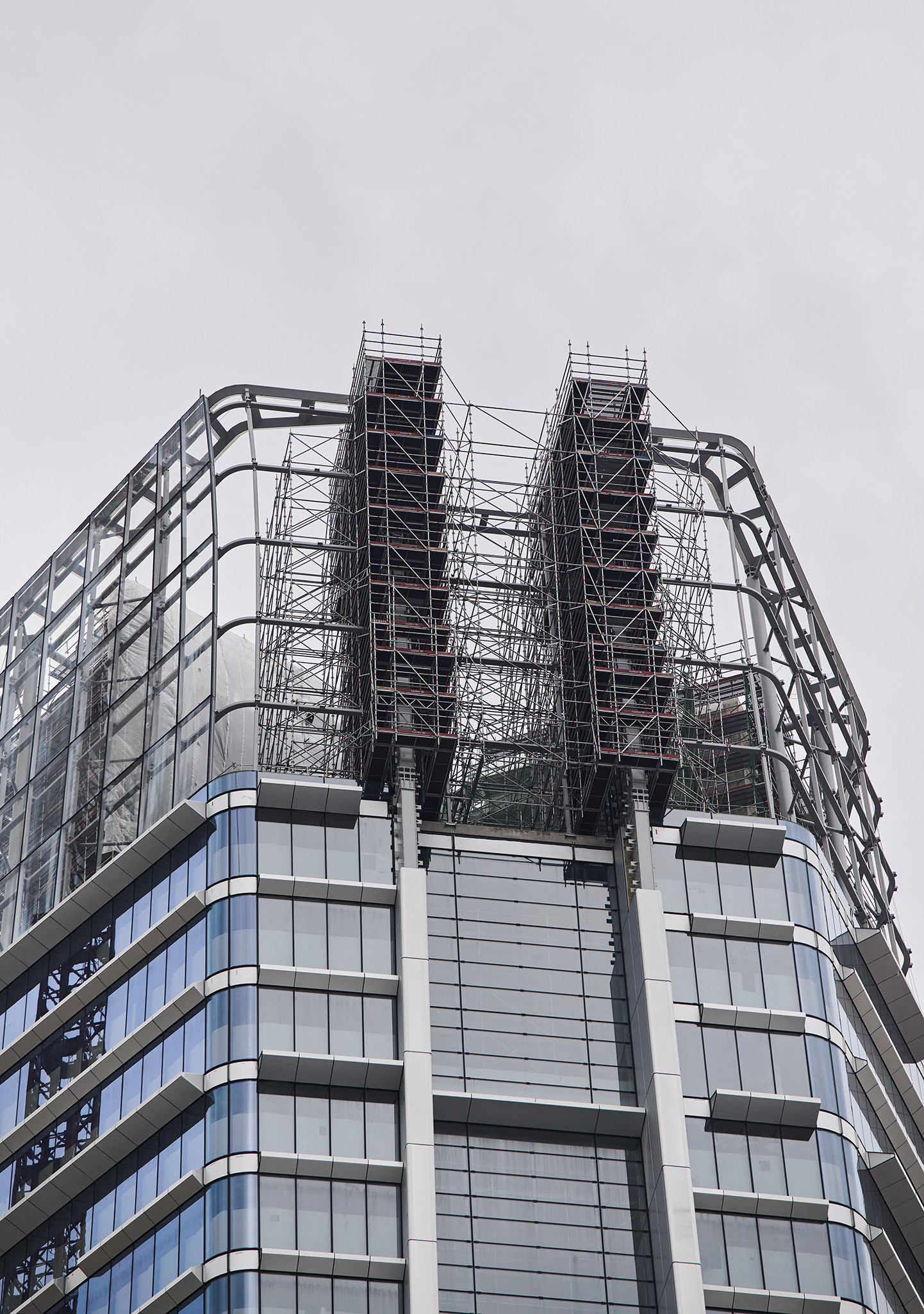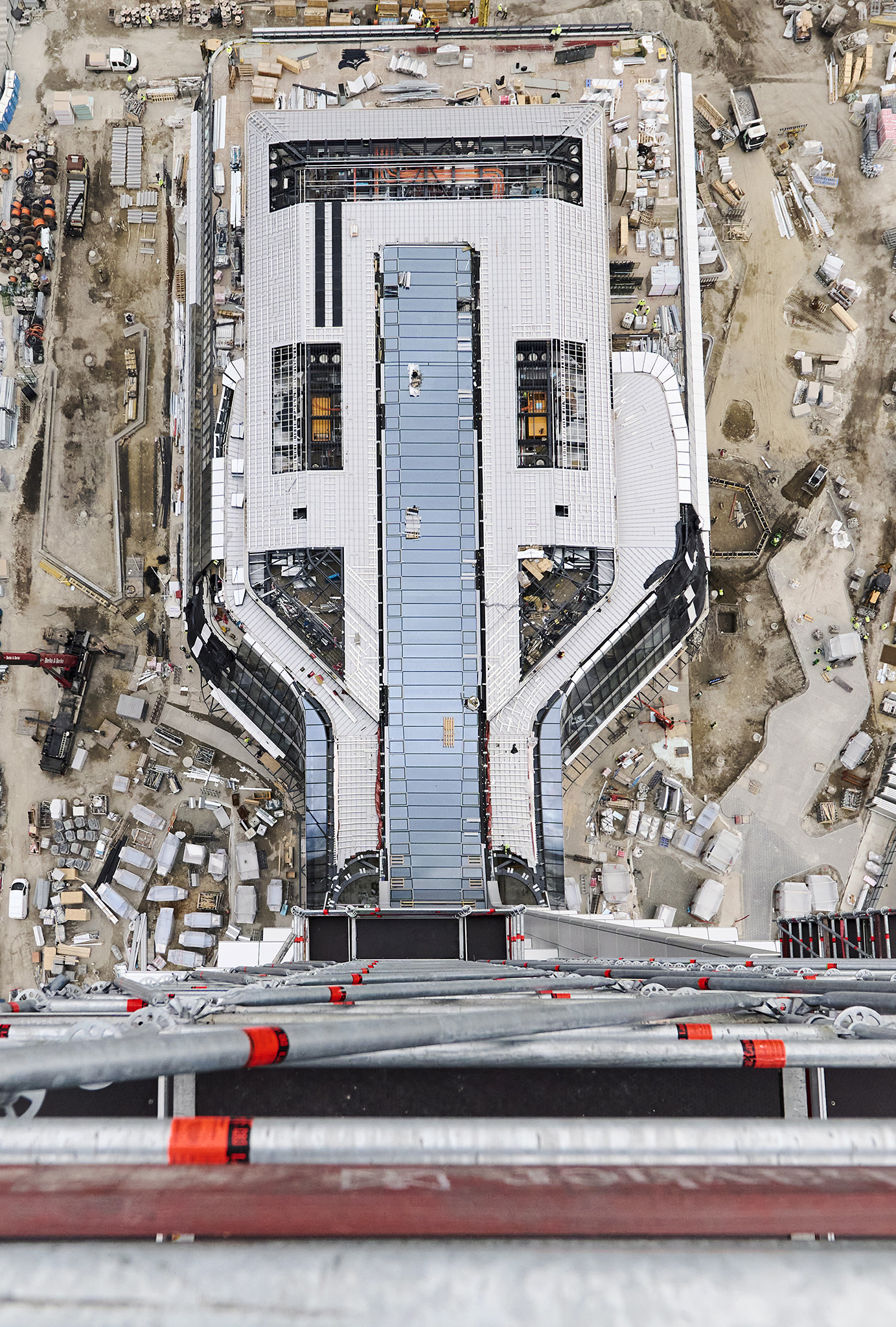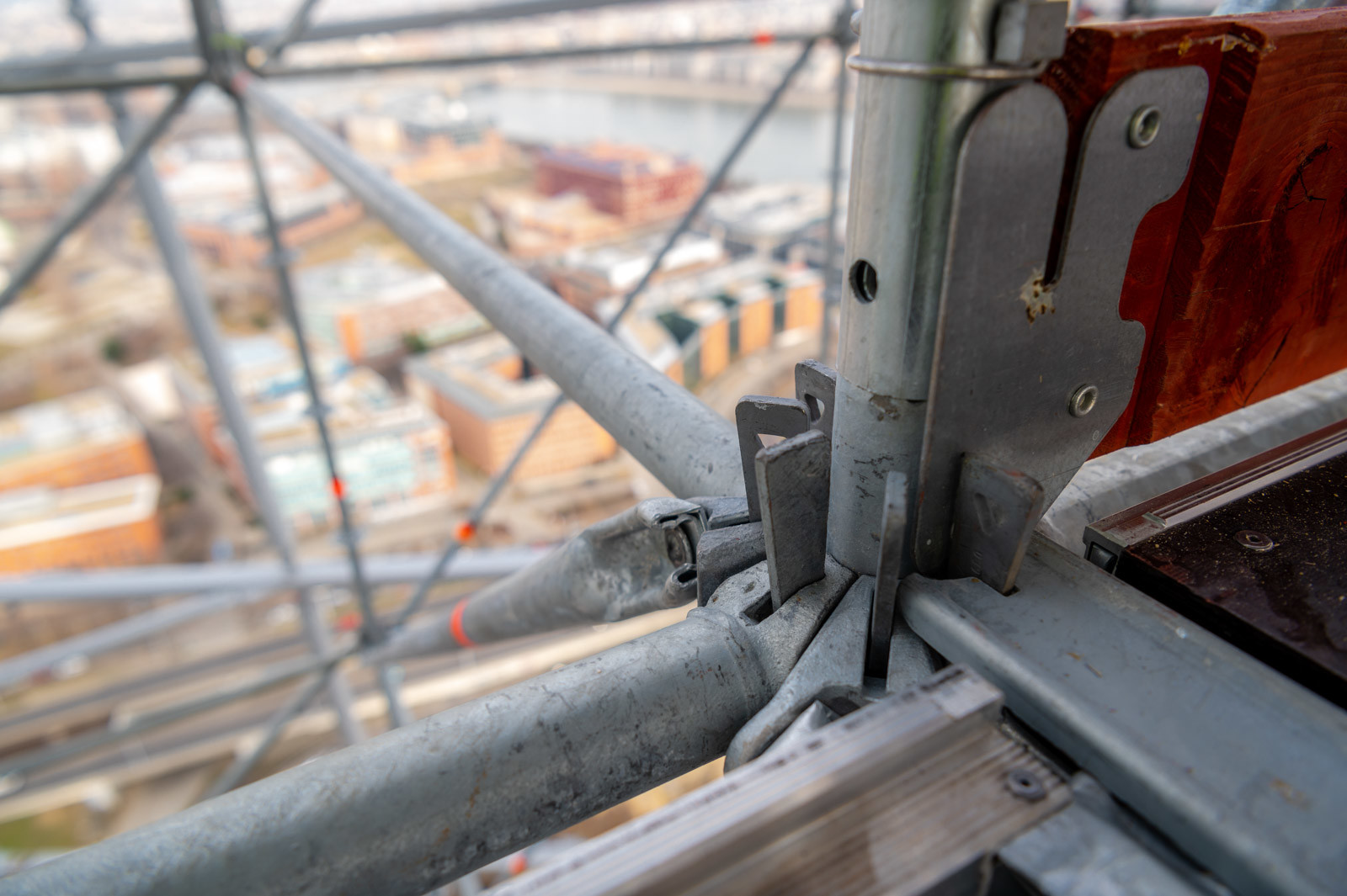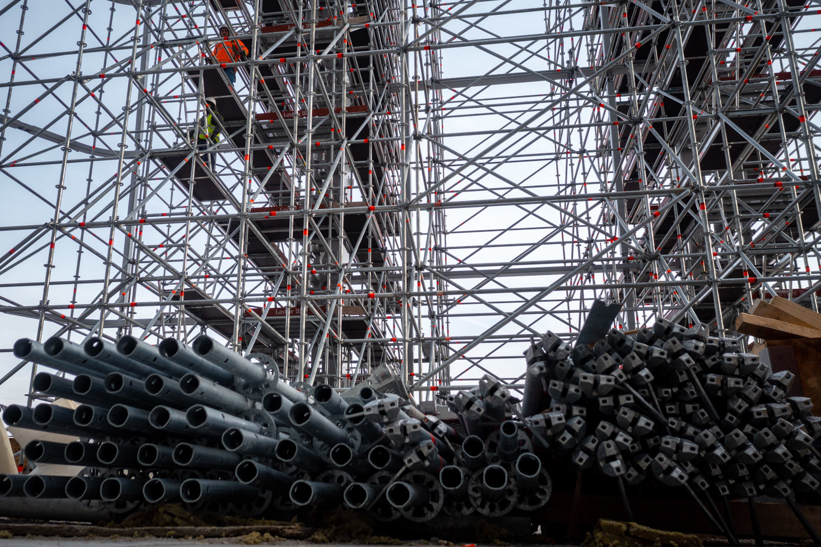 Az állványzat szintén az épület zárófödéméről indult 120 méter magasan, a pillérek ívelt formáját pontosan lekövetve. Fontos szempont volt, hogy a szerkezet minden pontja kényelmesen elérhető legyen az állványzatról, így az épület homlokzatától kifelé nyúló állványtagok a biztonságos munkavégzéshez elengedhetetlen szerepet töltöttek be.