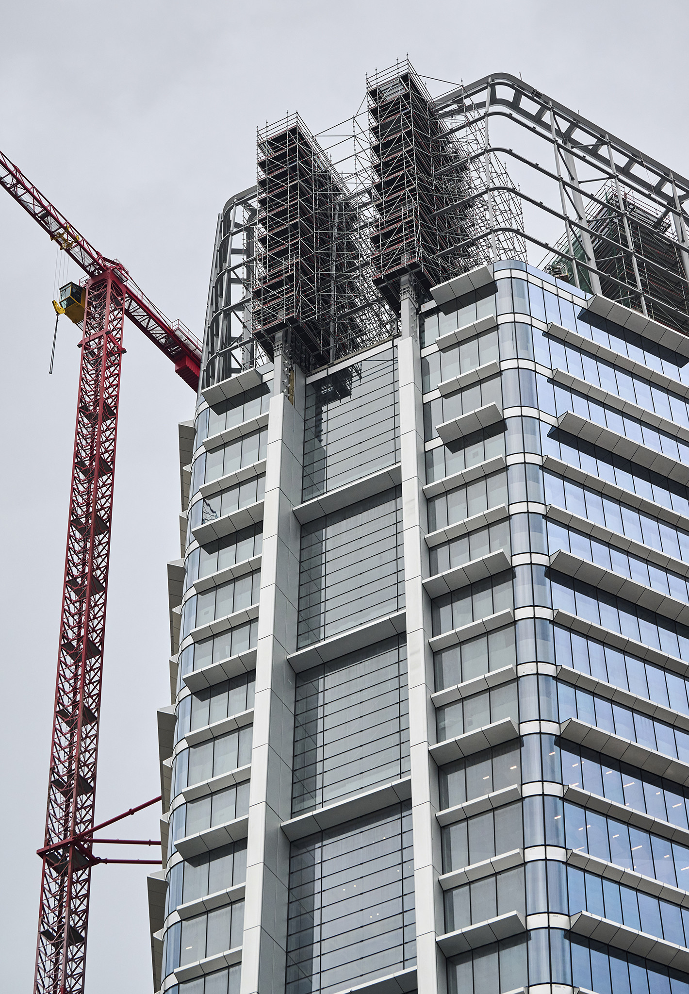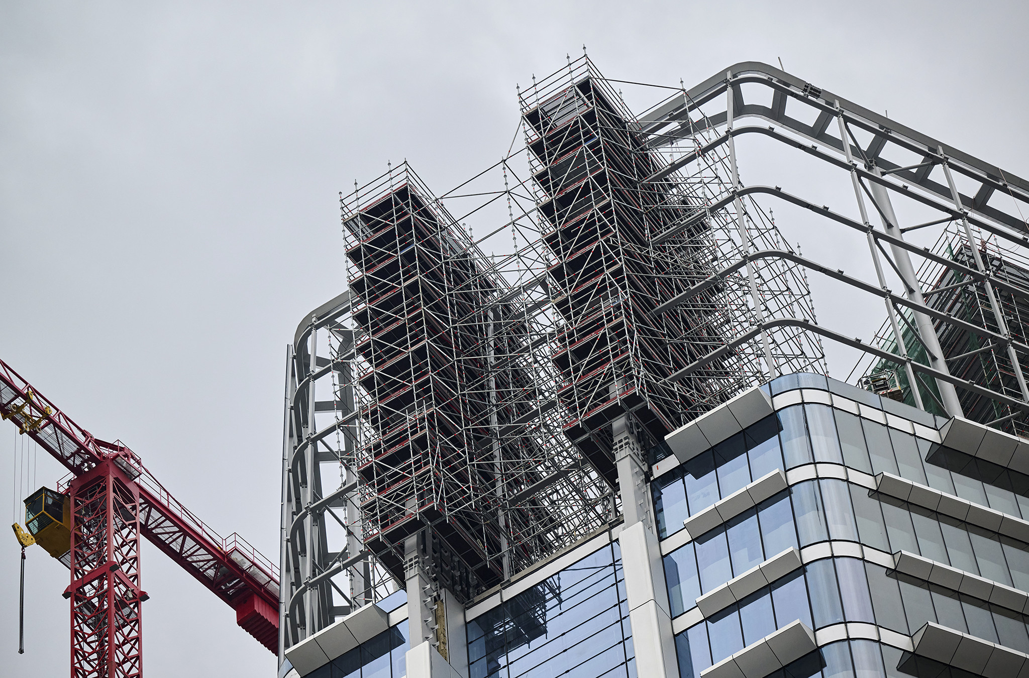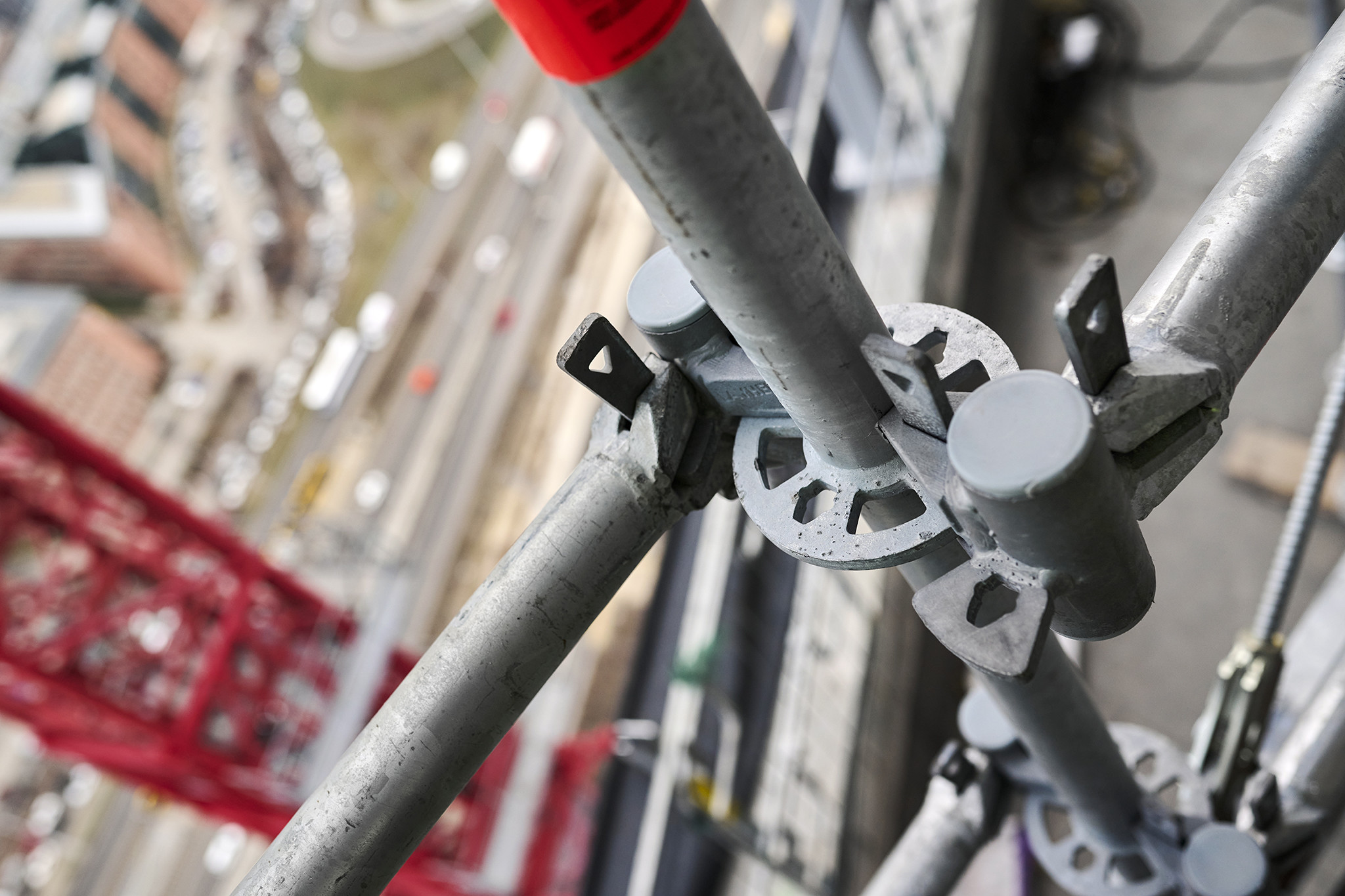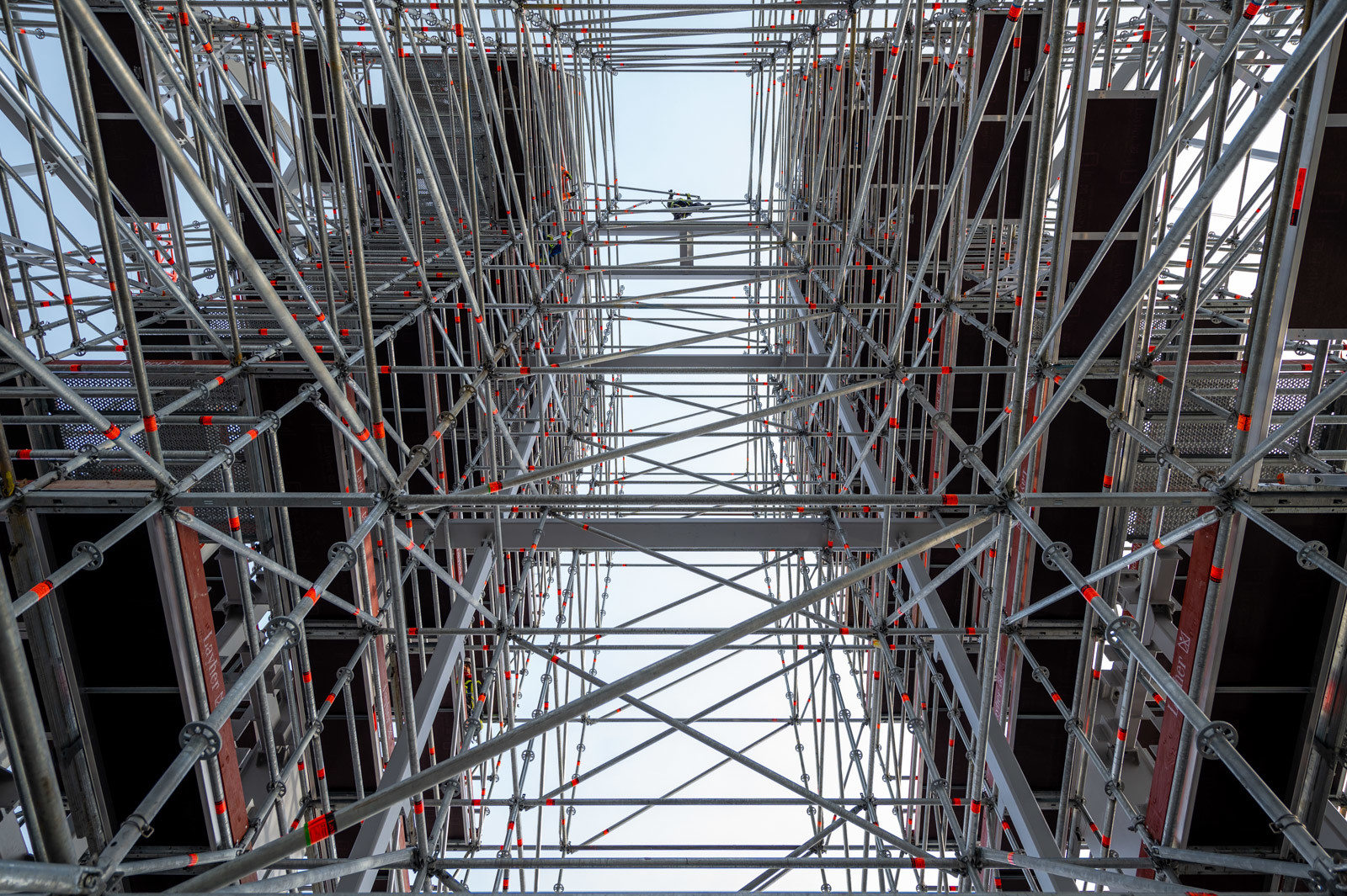 Az állványzat szintén az épület zárófödéméről indult 120 méter magasan, a pillérek ívelt formáját pontosan lekövetve. Fontos szempont volt, hogy a szerkezet minden pontja kényelmesen elérhető legyen az állványzatról, így az épület homlokzatától kifelé nyúló állványtagok a biztonságos munkavégzéshez elengedhetetlen szerepet töltöttek be.