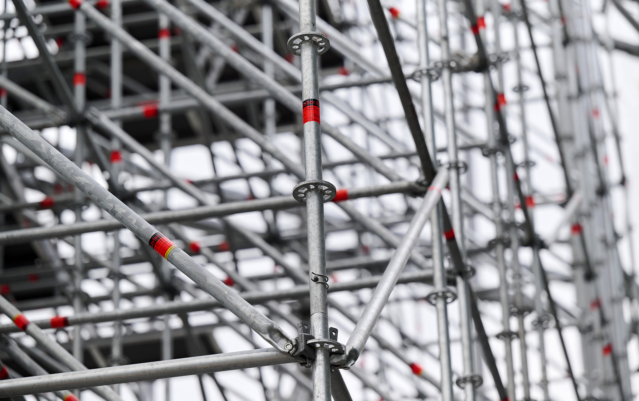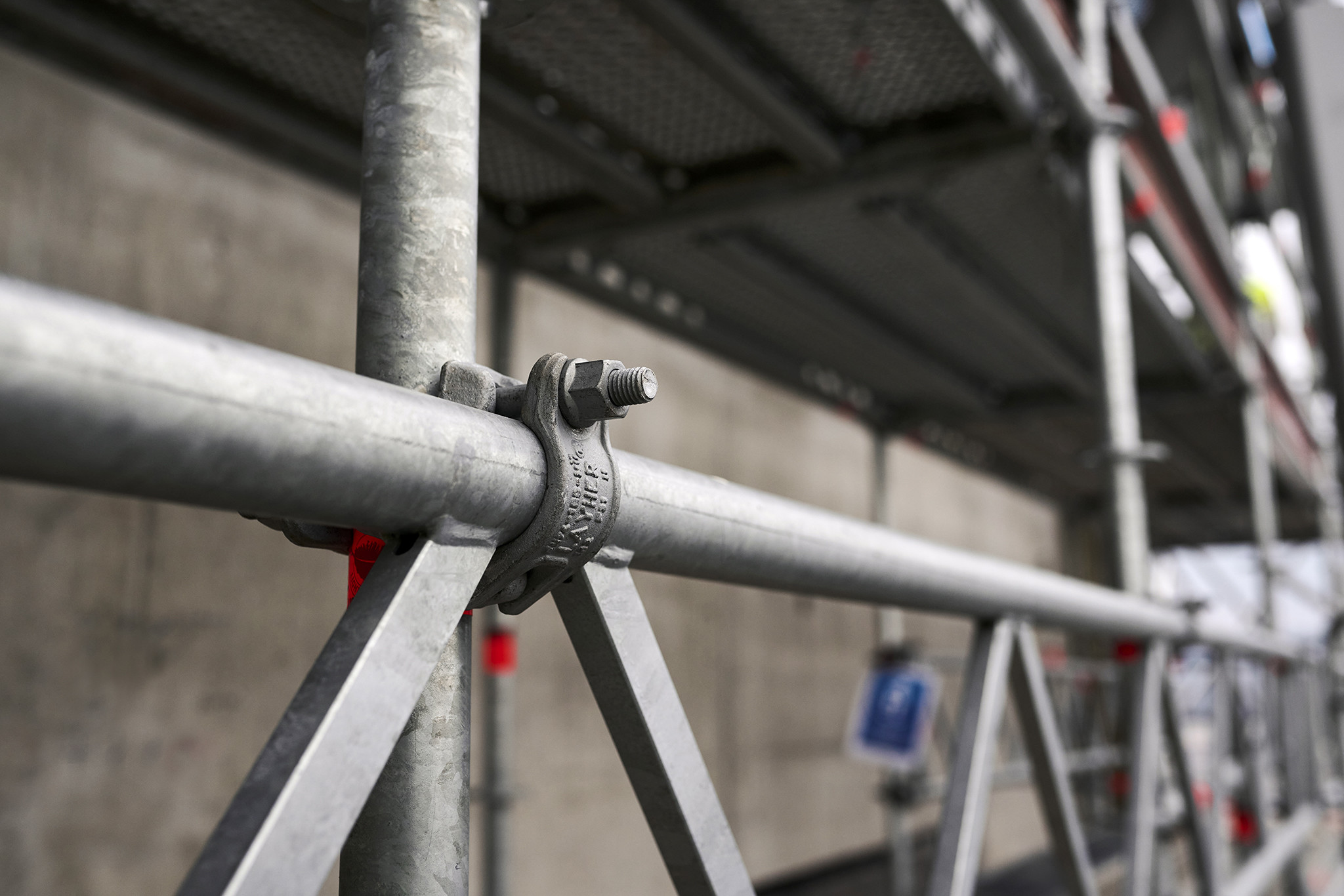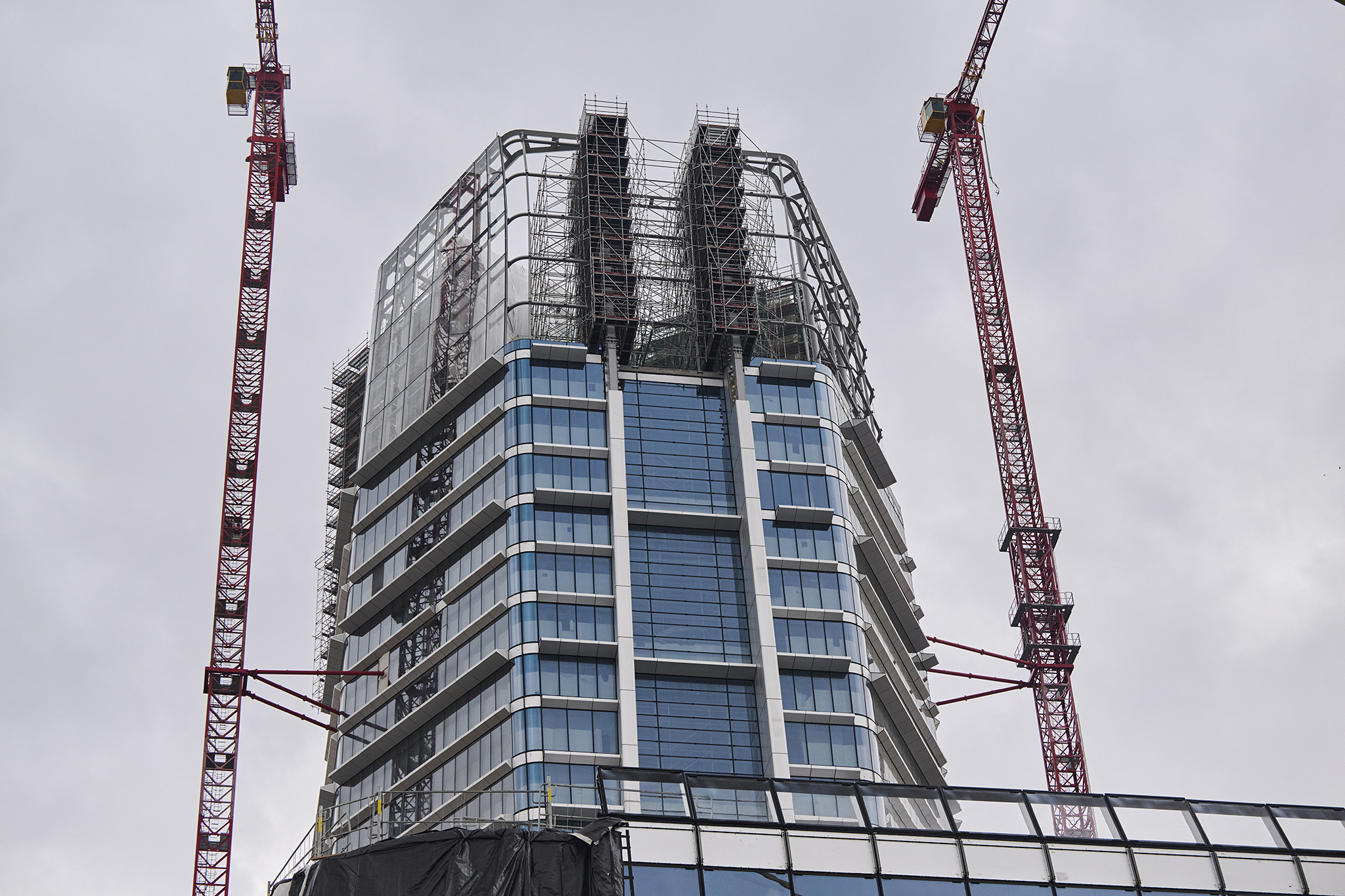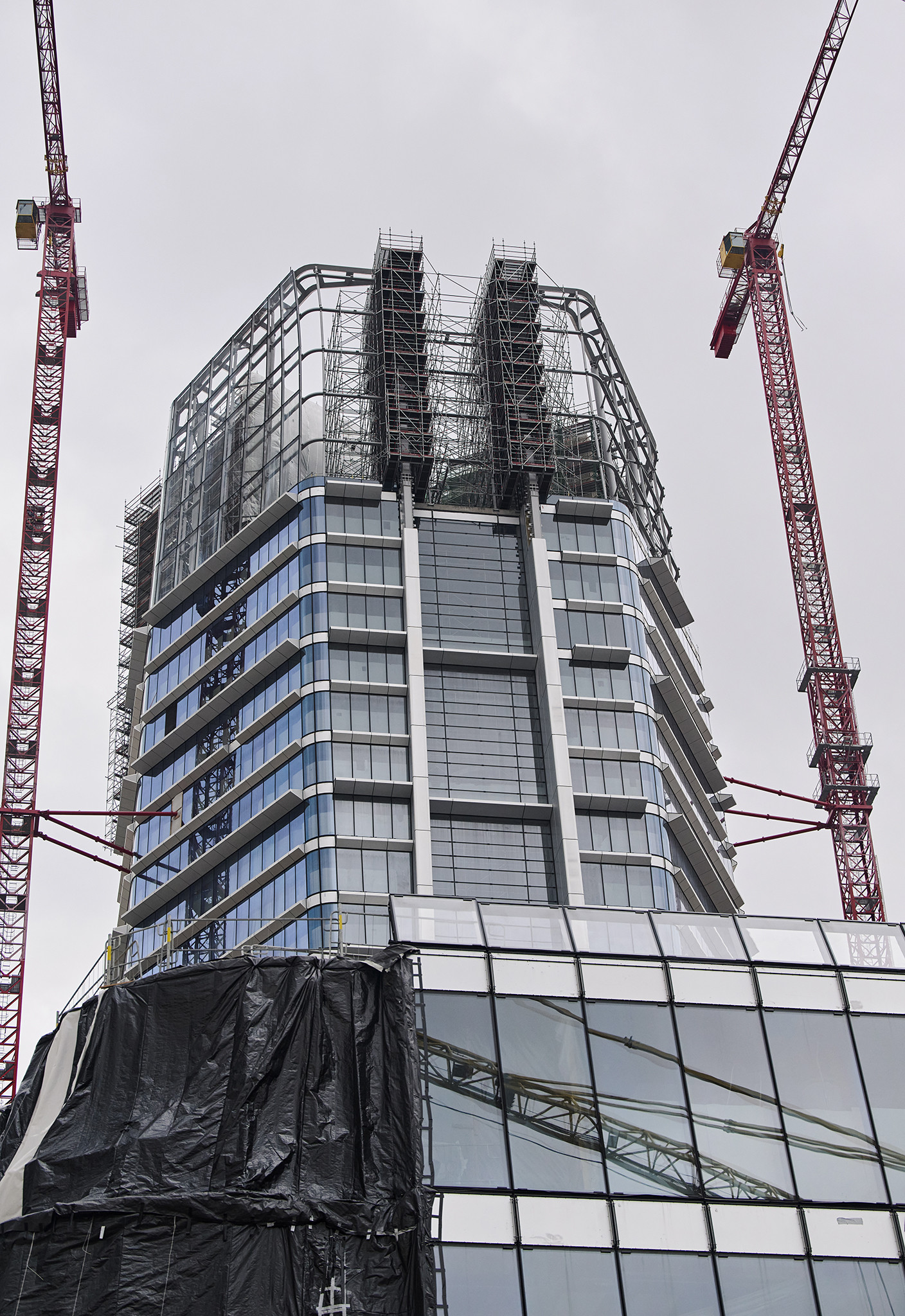 Az állványzat szintén az épület zárófödéméről indult 120 méter magasan, a pillérek ívelt formáját pontosan lekövetve. Fontos szempont volt, hogy a szerkezet minden pontja kényelmesen elérhető legyen az állványzatról, így az épület homlokzatától kifelé nyúló állványtagok a biztonságos munkavégzéshez elengedhetetlen szerepet töltöttek be.