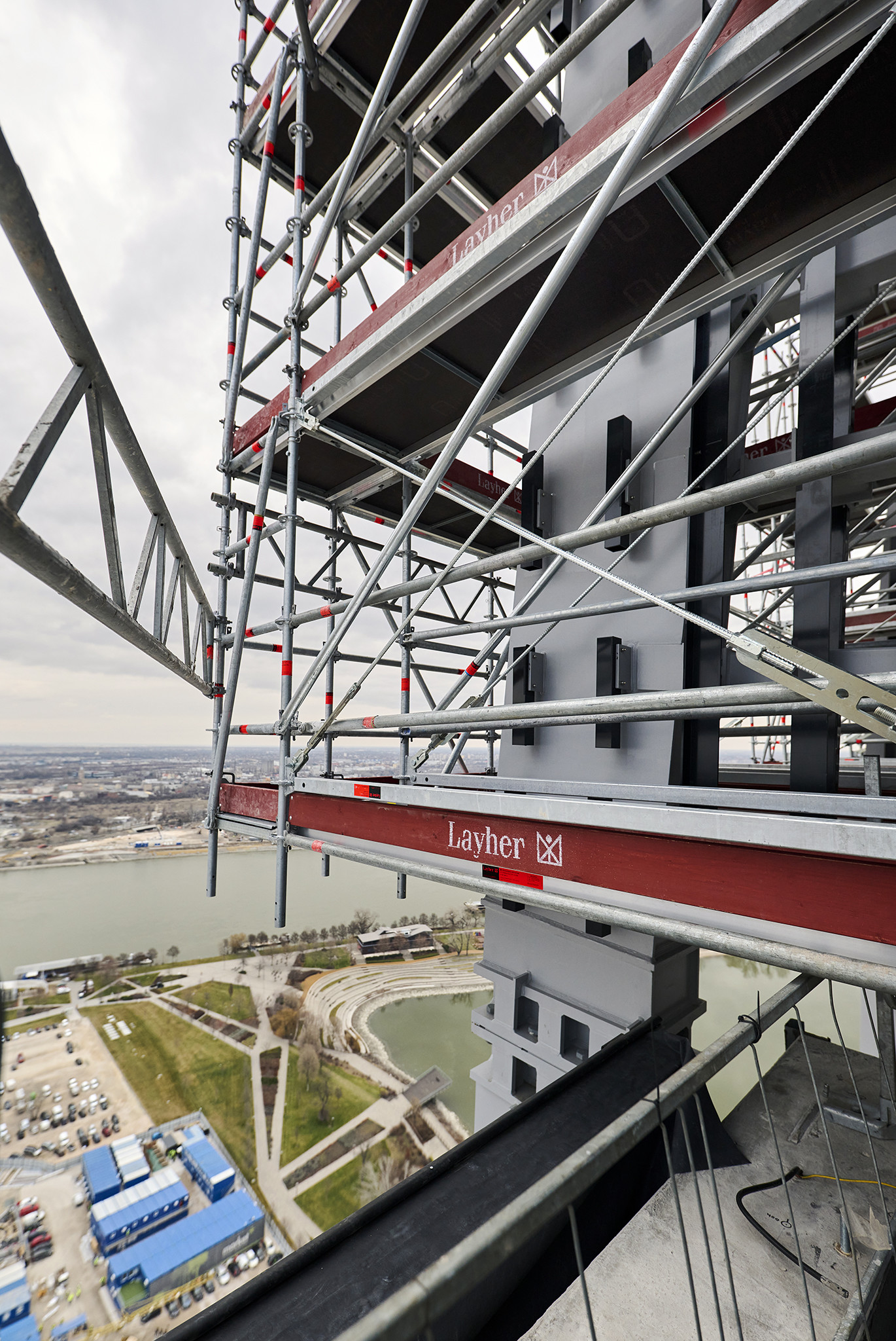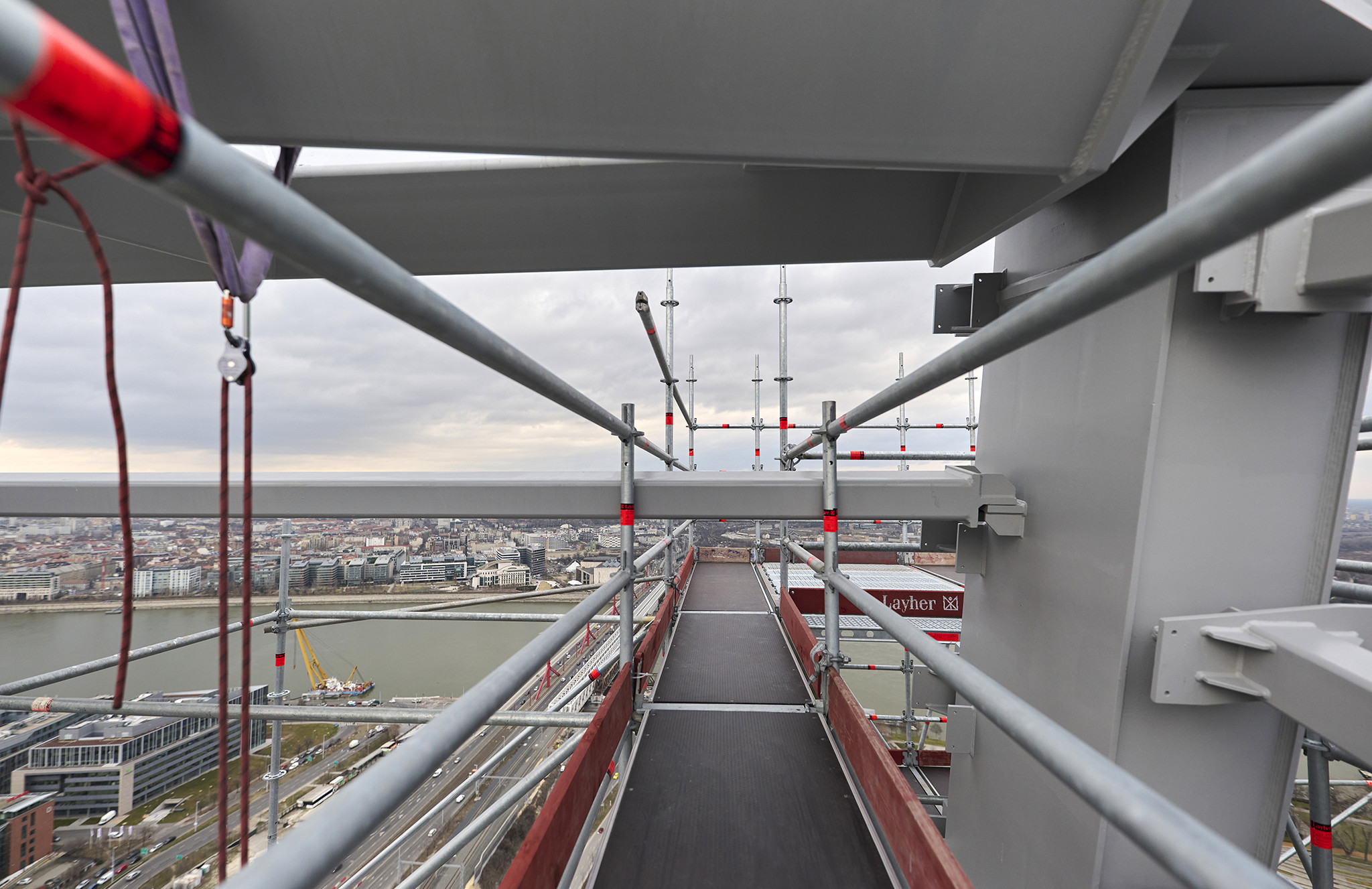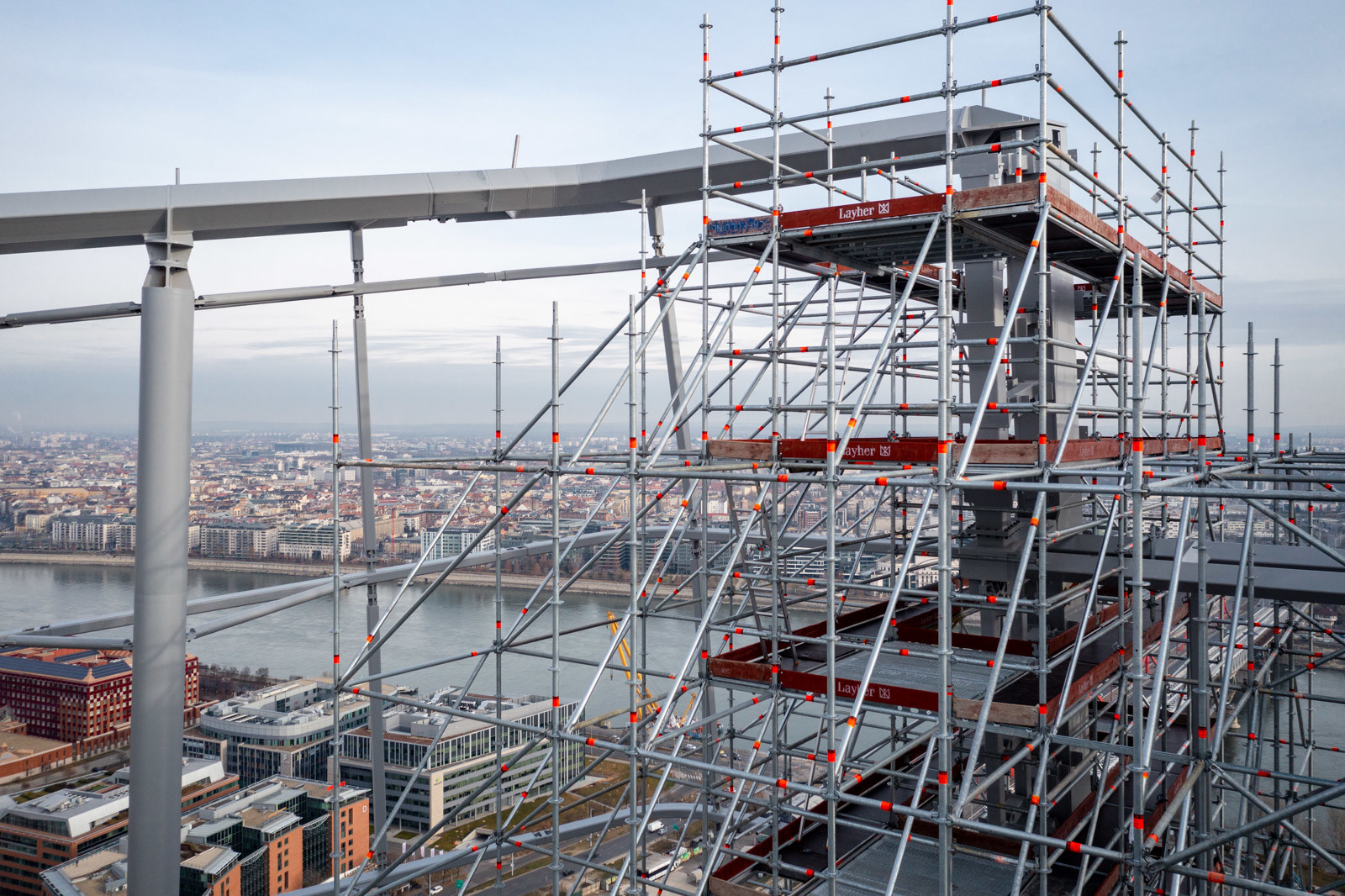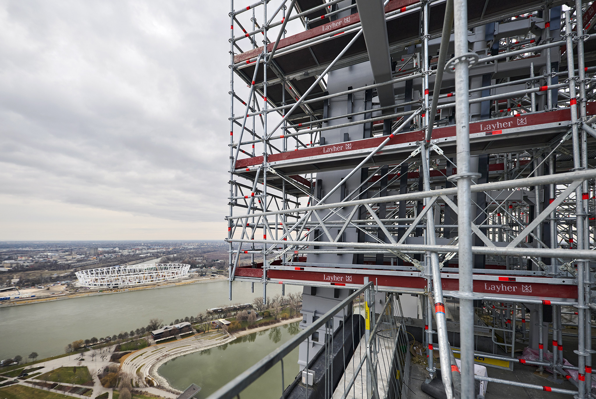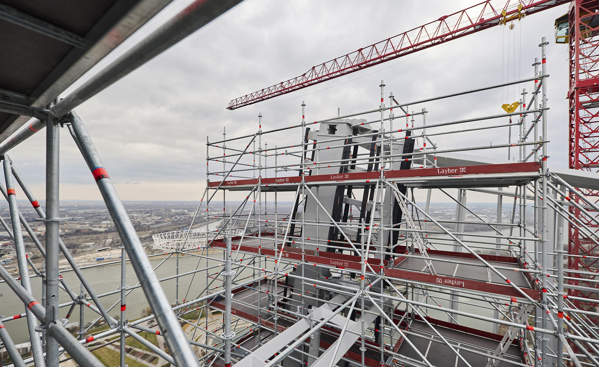 A grandiózus projekt különleges megoldásokat követelt a magasban folyó munkákhoz. A rendkívüli szélterheknek ellenálló, statikailag is helytálló Layher állványzat segíti a szakemberek munkáját.