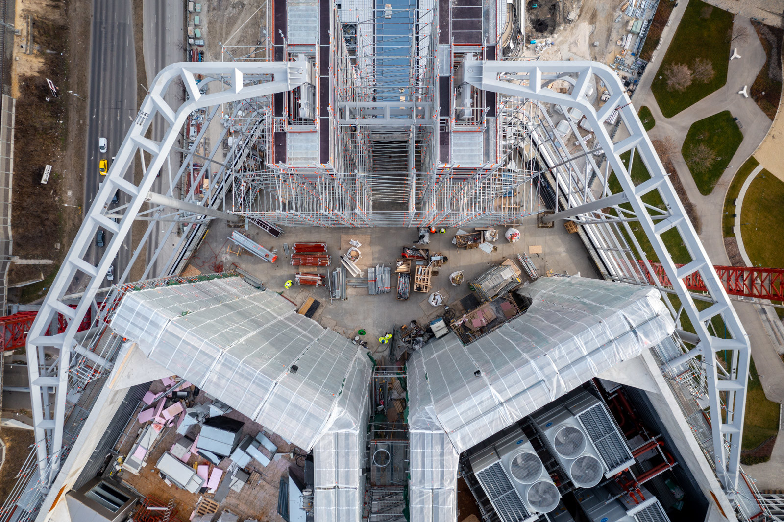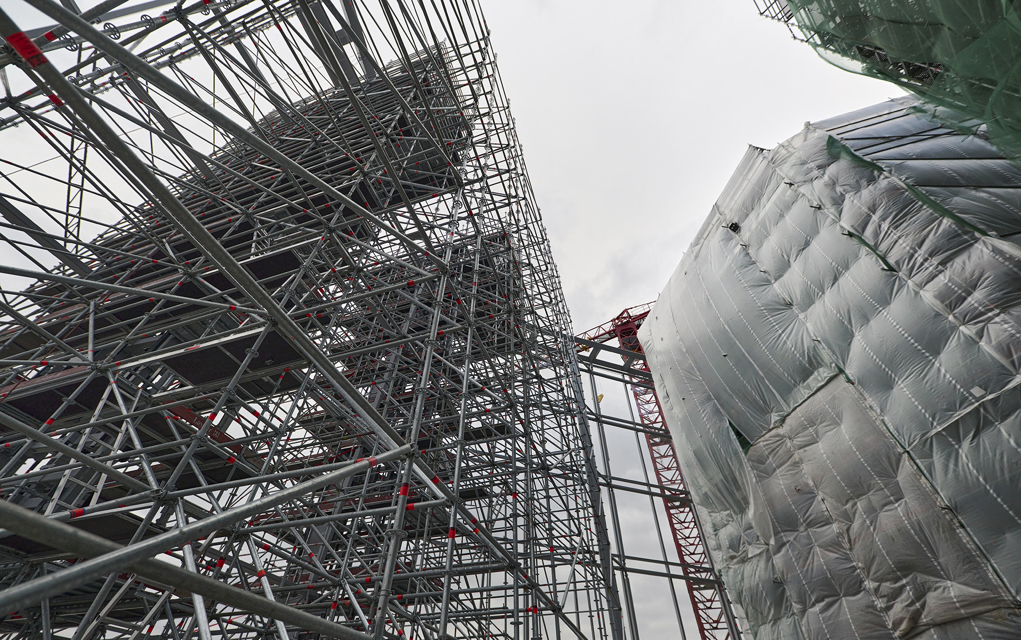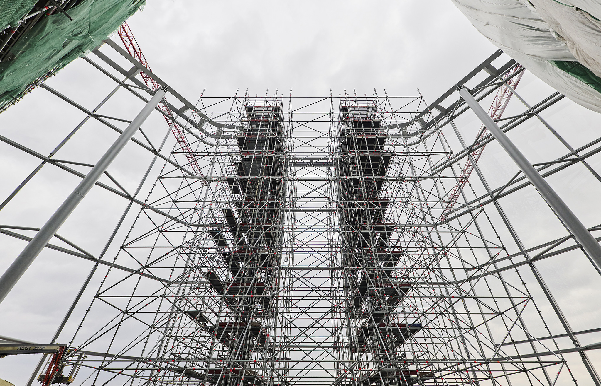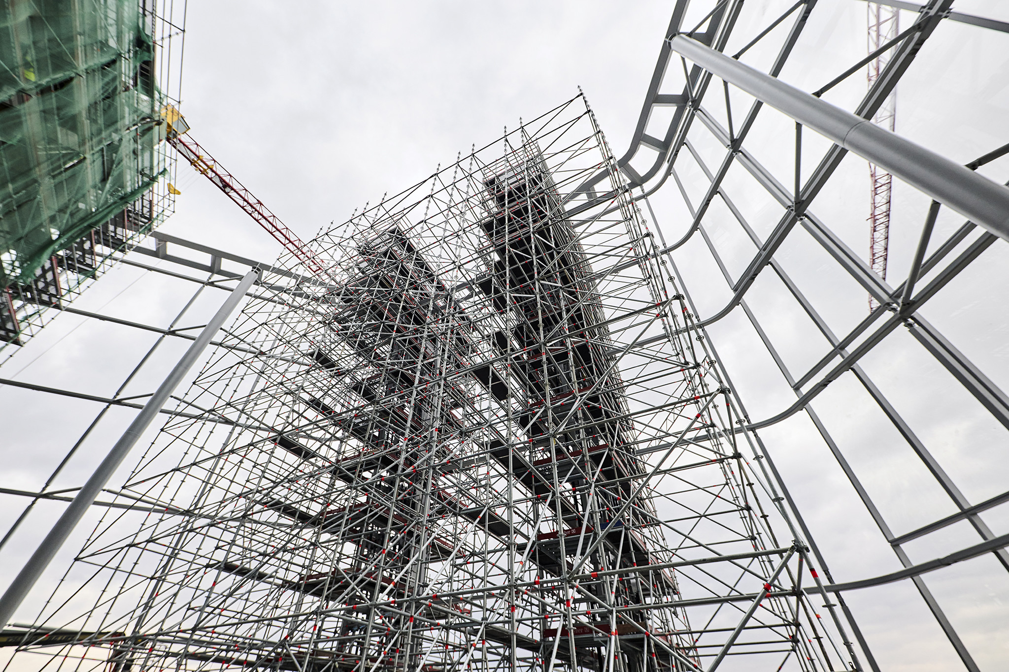 Az állványzat felépítése több ütemben zajlott a kivitelezési munkákhoz igazítva. Szintén látványos momentum volt, hogy az építőanyagokhoz hasonlóan az állványelemeket is a hozzávetőlegesen 160 méter magas toronydaruval mozgatták a megfelelő helyre.